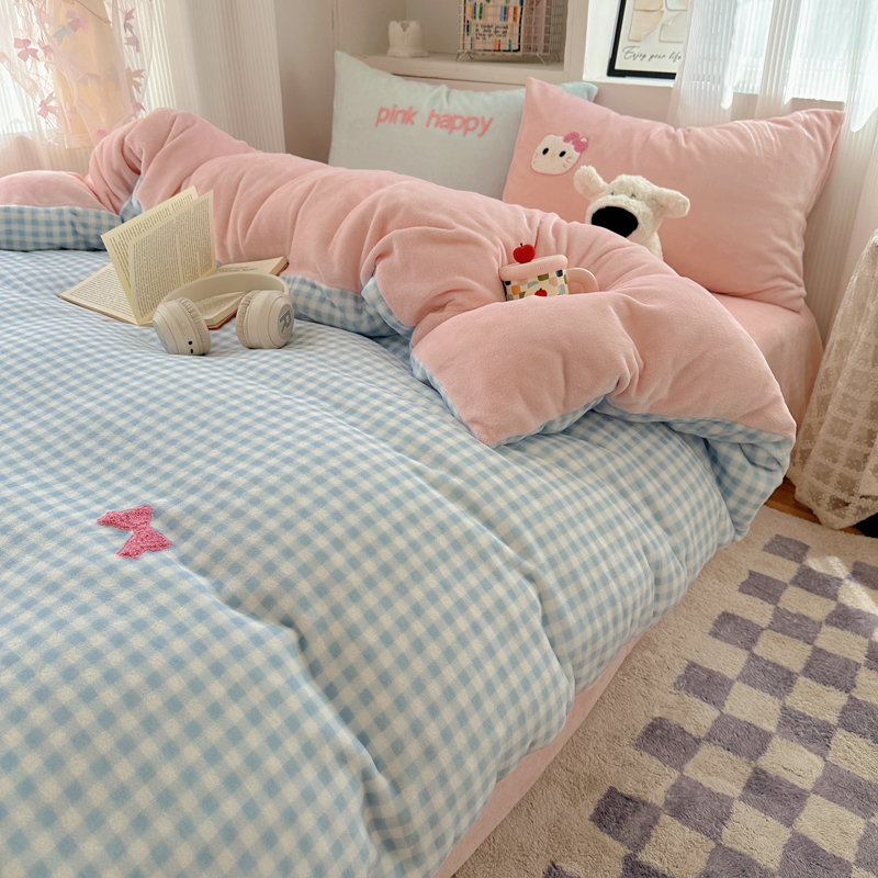 (总)顾里家纺 2024新款格子蝴蝶结毛巾绣牛奶绒四件套,粉格蝴蝶结,粉蓝蝴蝶结,黄格蝴蝶结,蓝格蝴蝶结,绿格蝴蝶结
