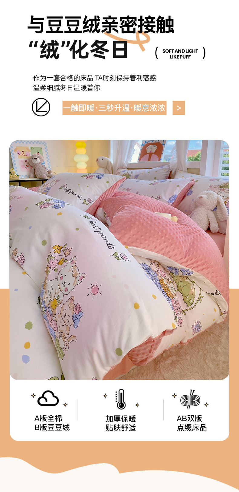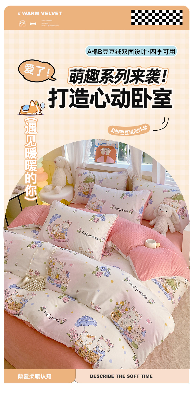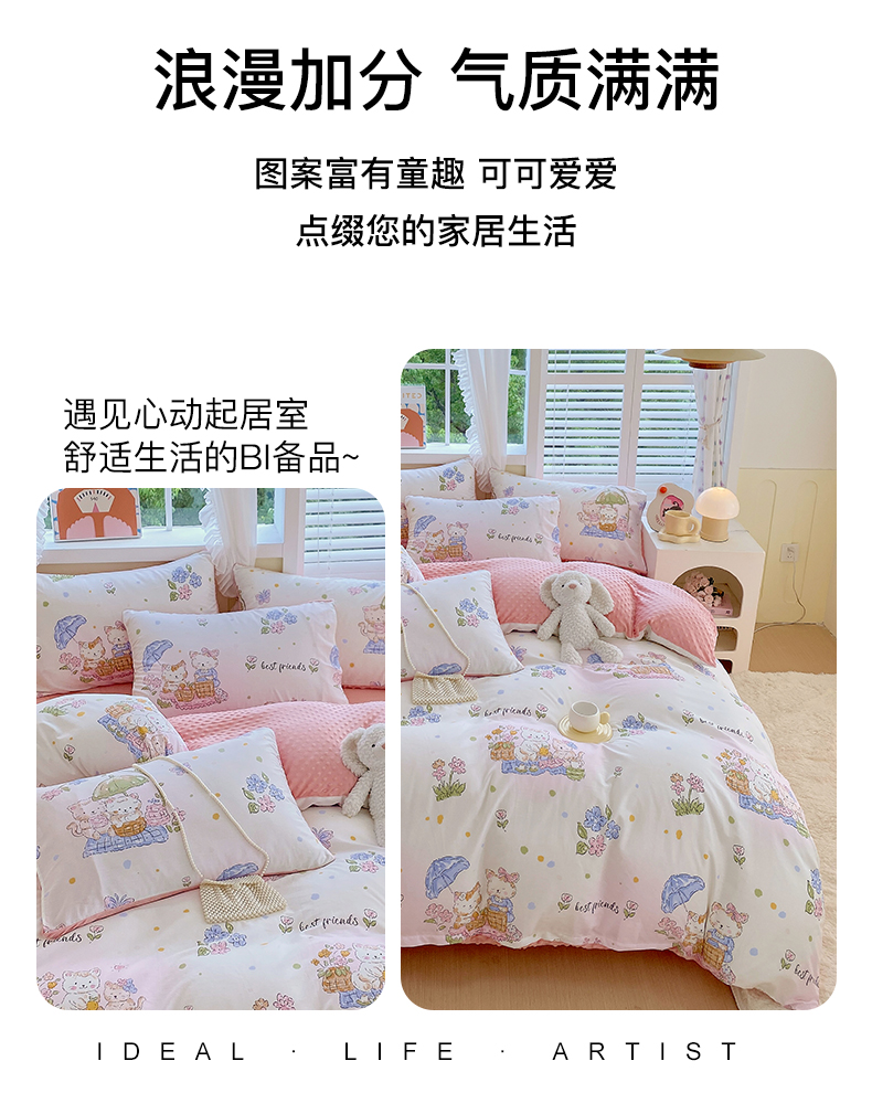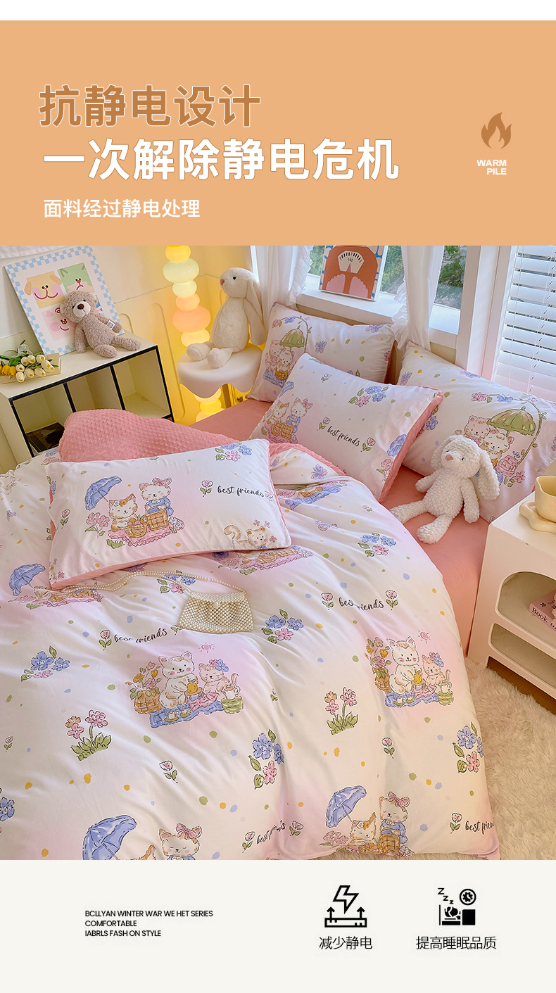当前位置: 91家纺网 > 商品网购 > 床品套件 > 四件套 > 其它四件套 > 金鑫汇家纺 2024新款棉加豆豆绒系列四件套 喵喵日记