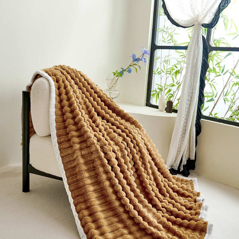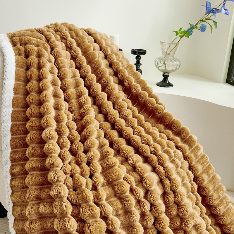 鹏程 24款300克抽条毛毯高克重法莱绒牛奶绒贝贝绒毛毯 咖条