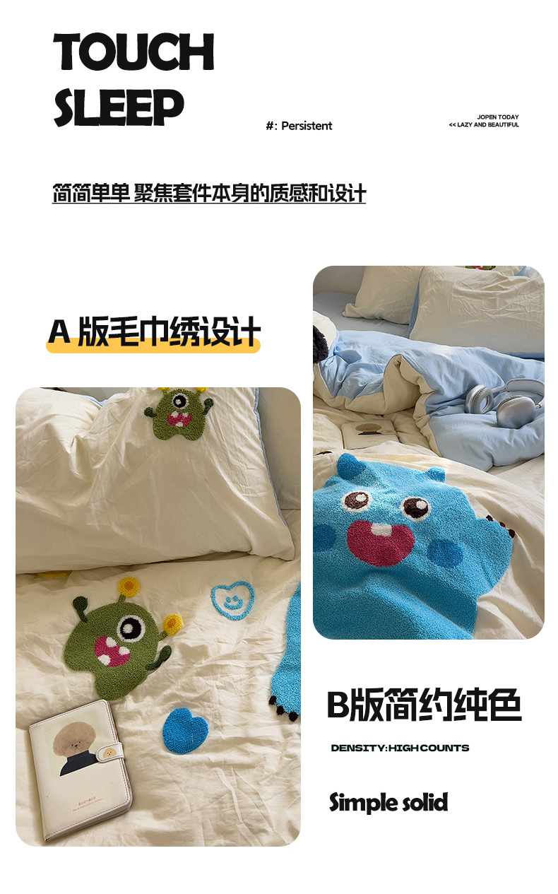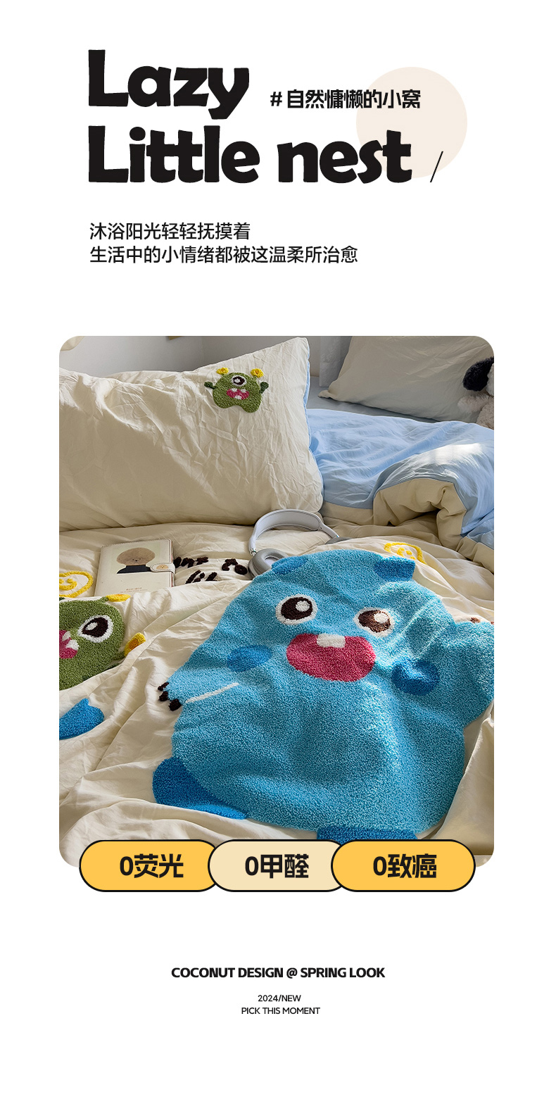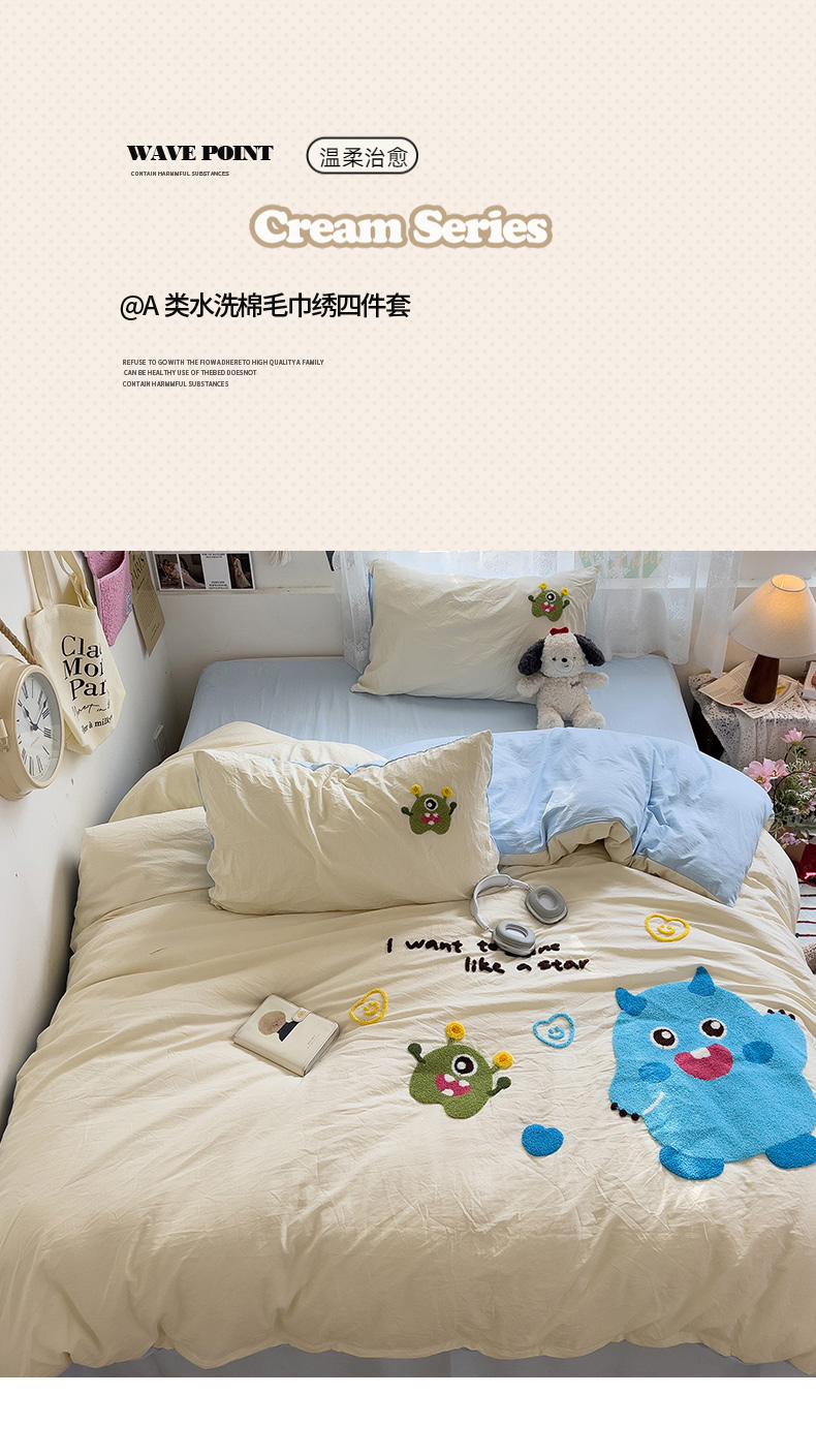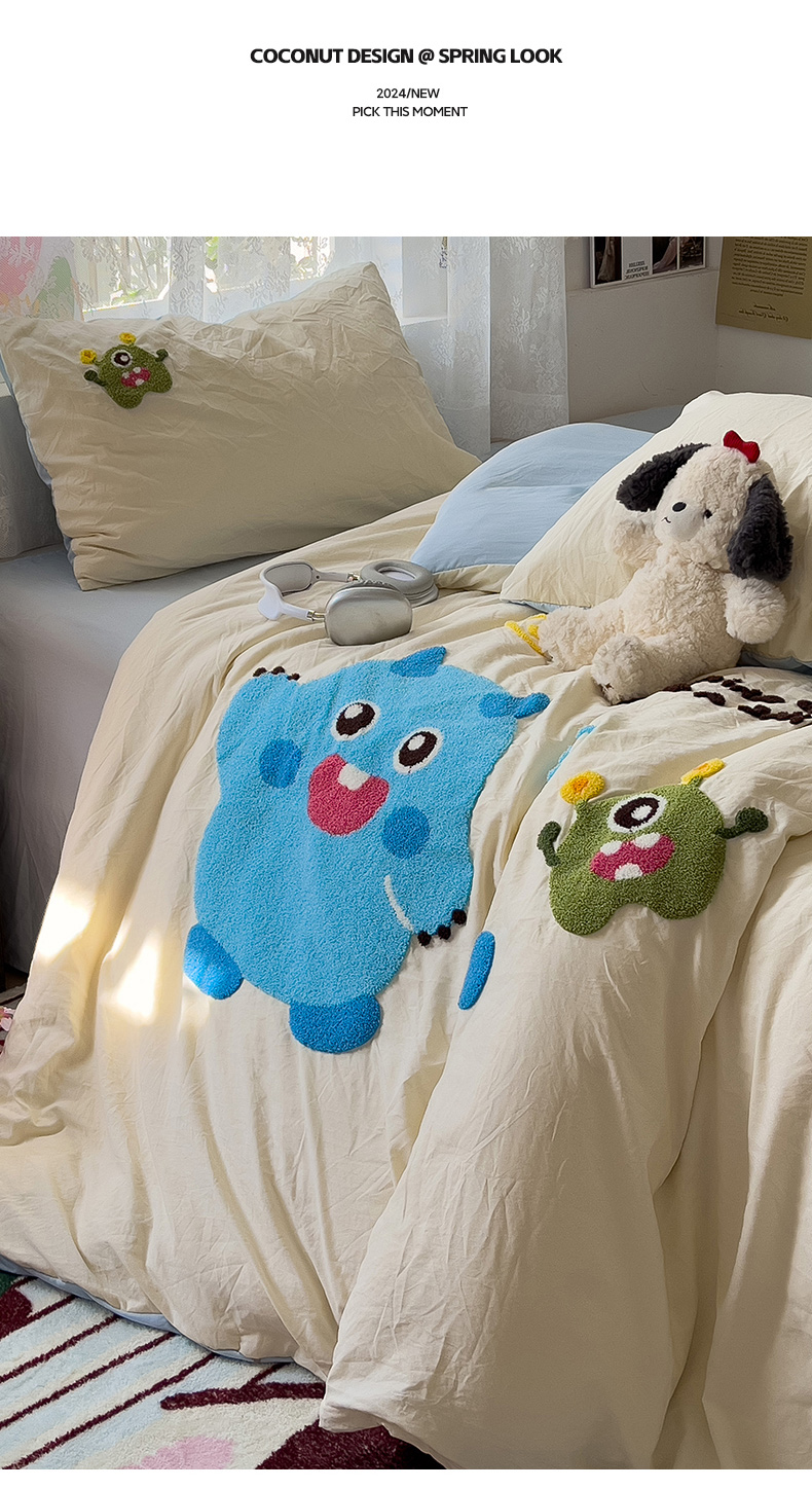 当前位置: 91家纺网 > 商品网购 > 床品套件 > 四件套 > 水洗棉四件套 > 2024新款水洗棉毛巾绣四件套系列 怪兽宝贝奶黄蓝