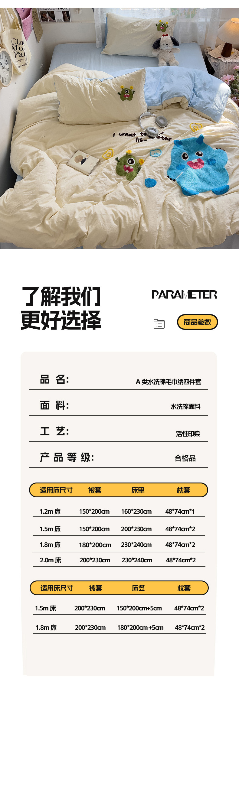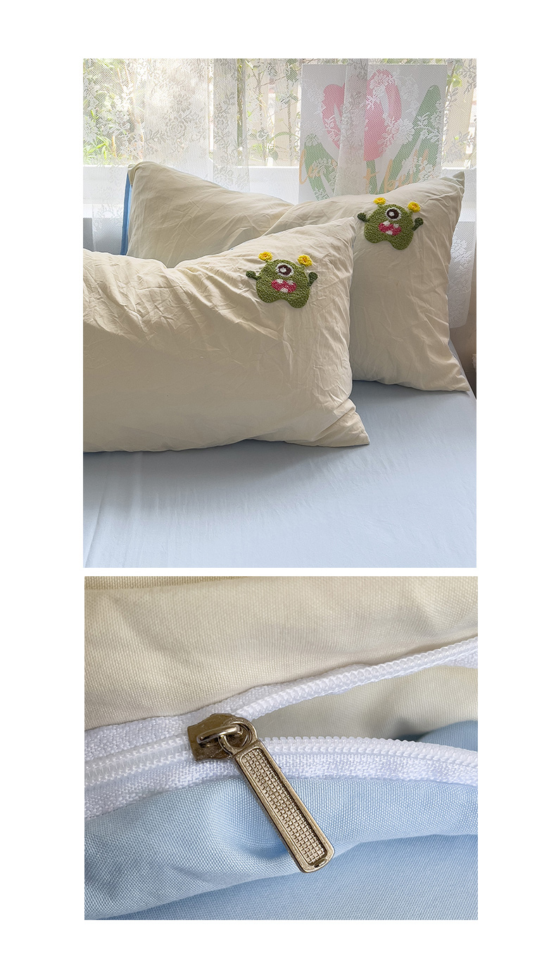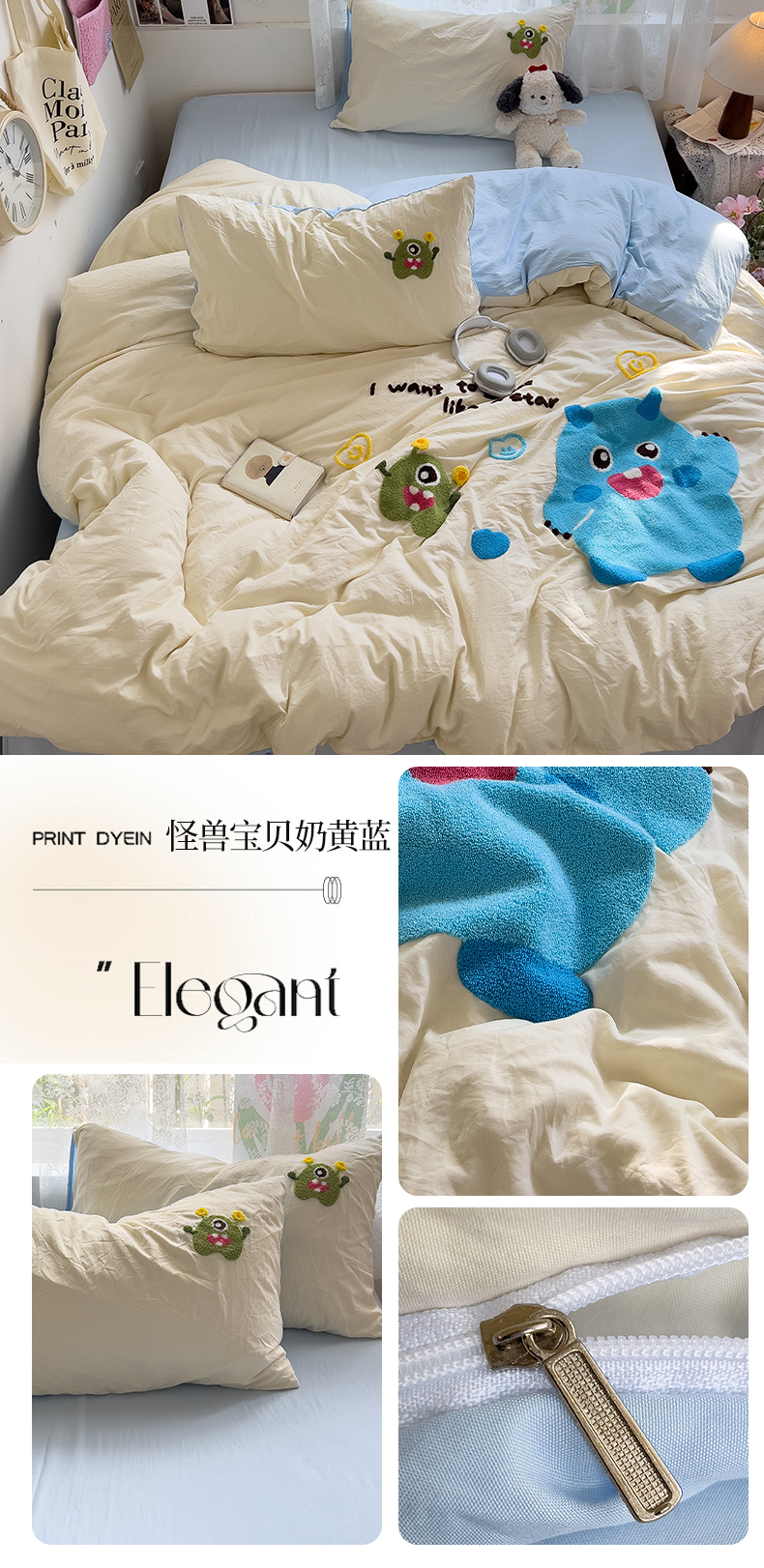 当前位置: 91家纺网 > 商品网购 > 床品套件 > 四件套 > 水洗棉四件套 > 2024新款水洗棉毛巾绣四件套系列 怪兽宝贝奶黄蓝