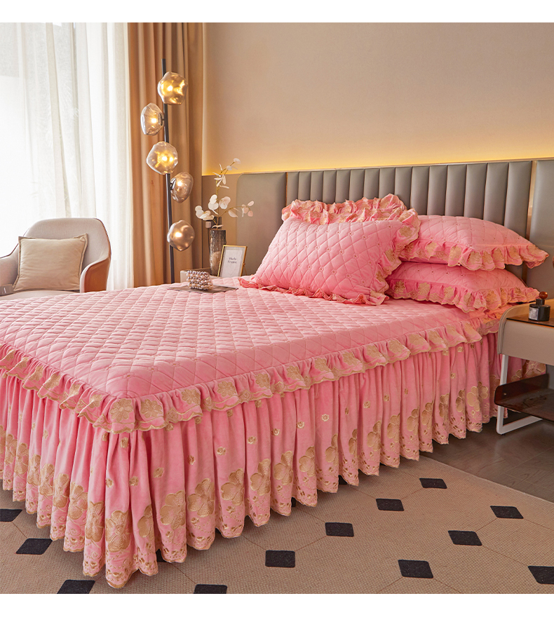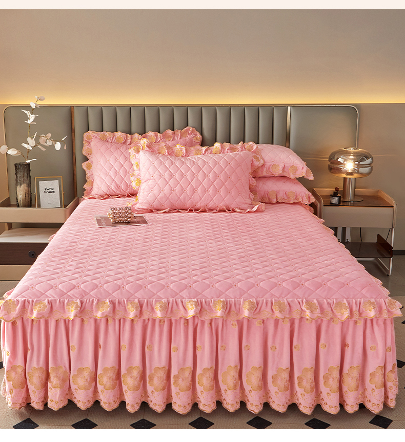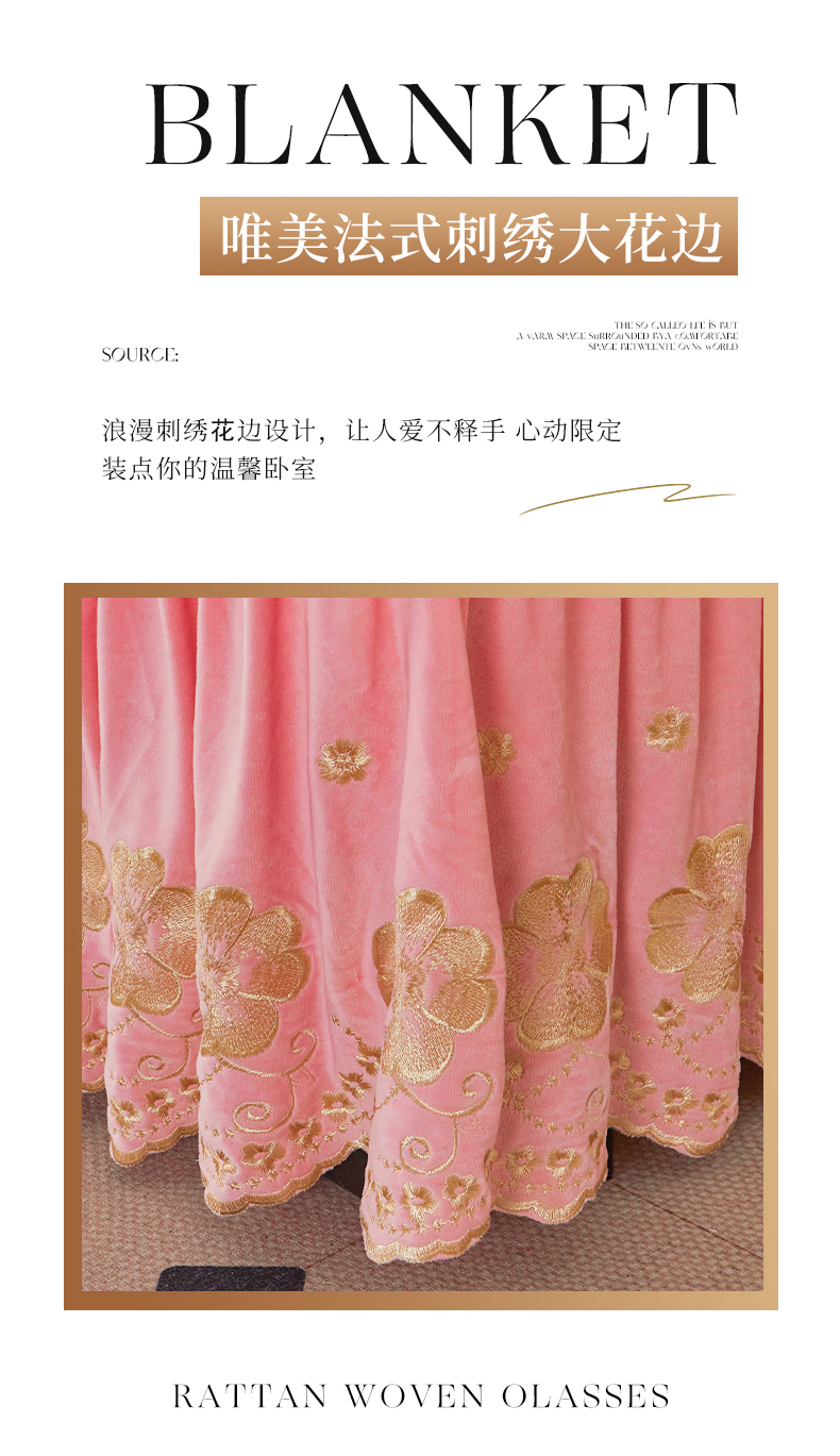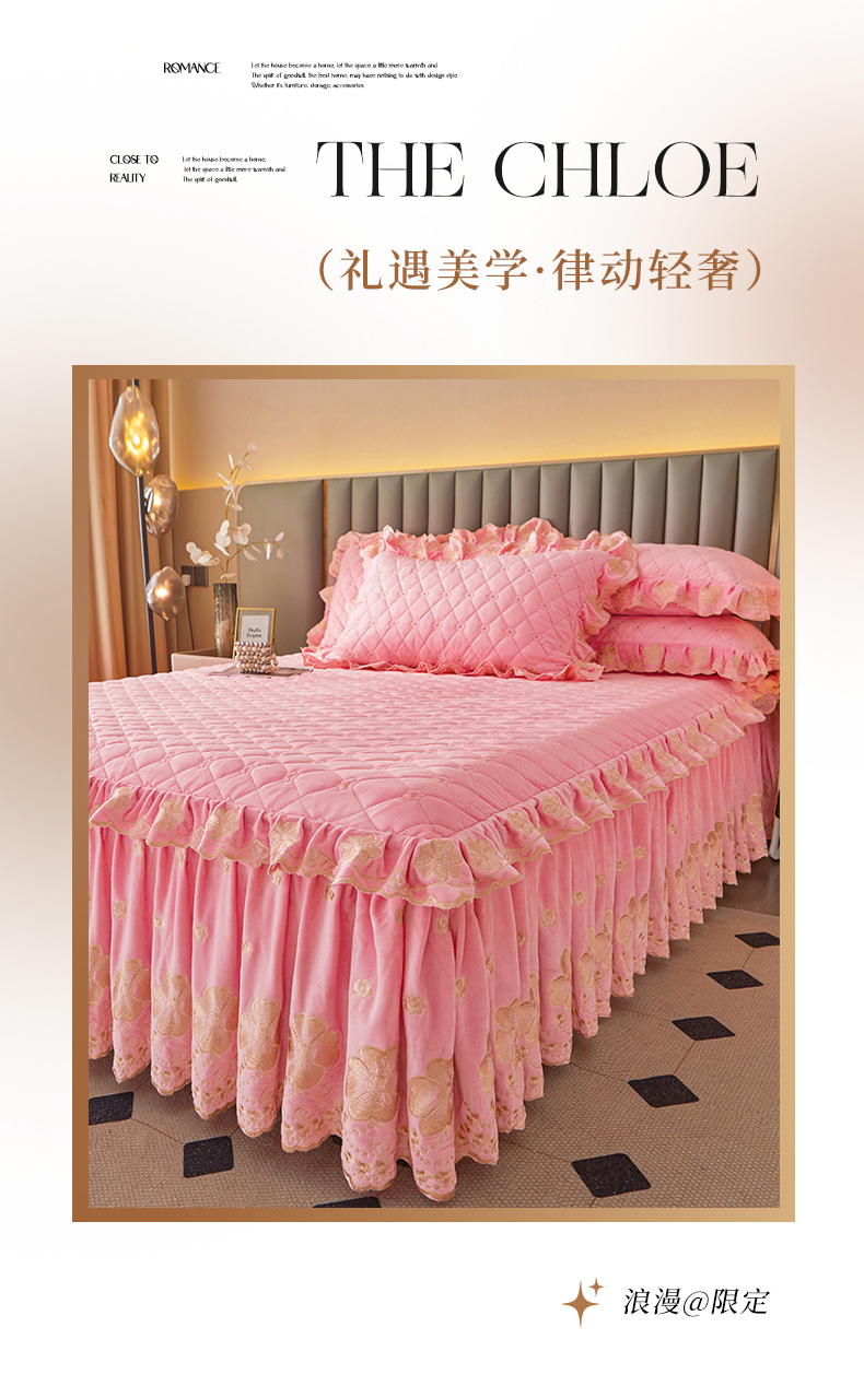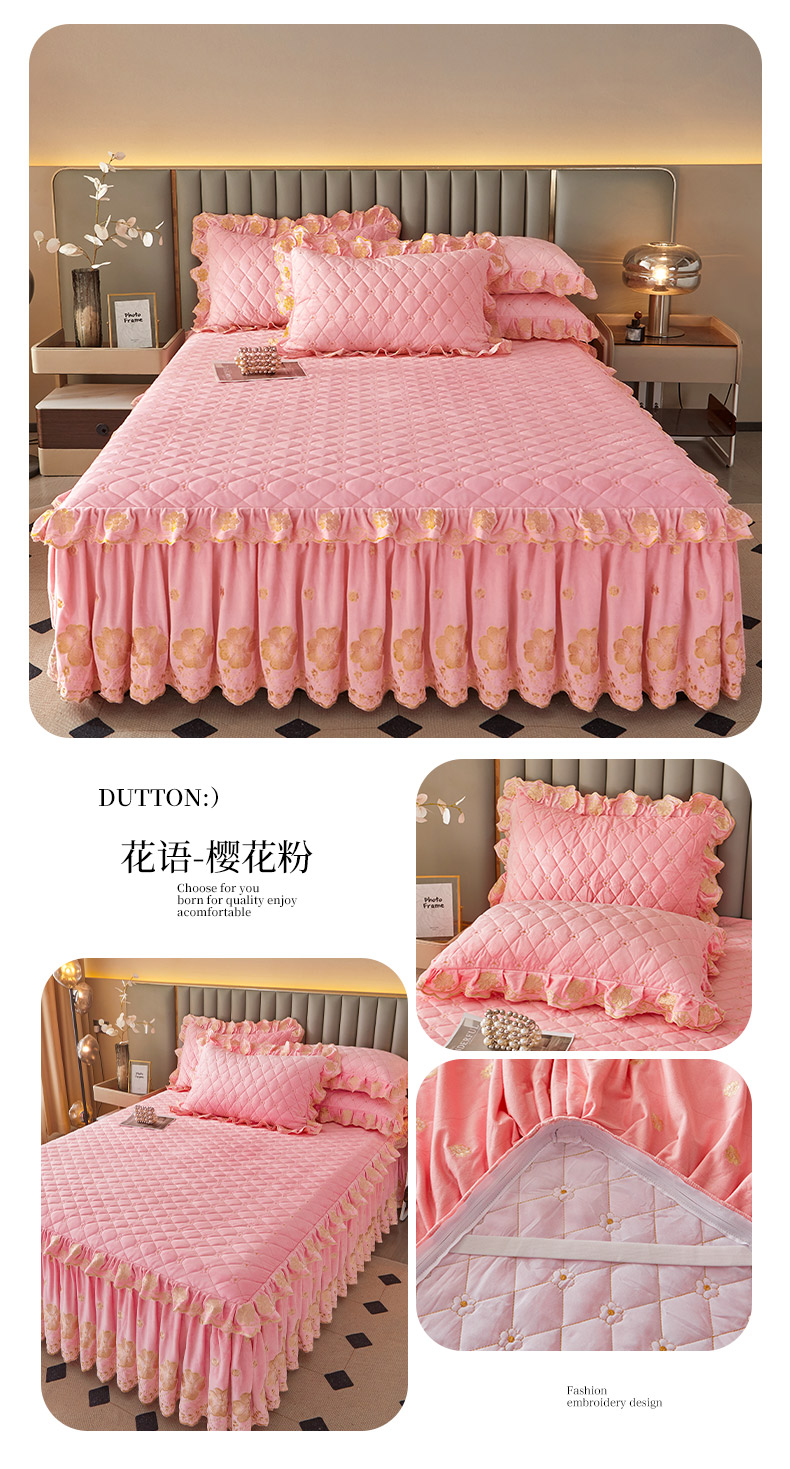 • 91家纺网 家纺一手货源 找家纺 罗艺轩 2025新款婴儿绒双层夹棉可拆卸床裙-花语 花语-樱花粉