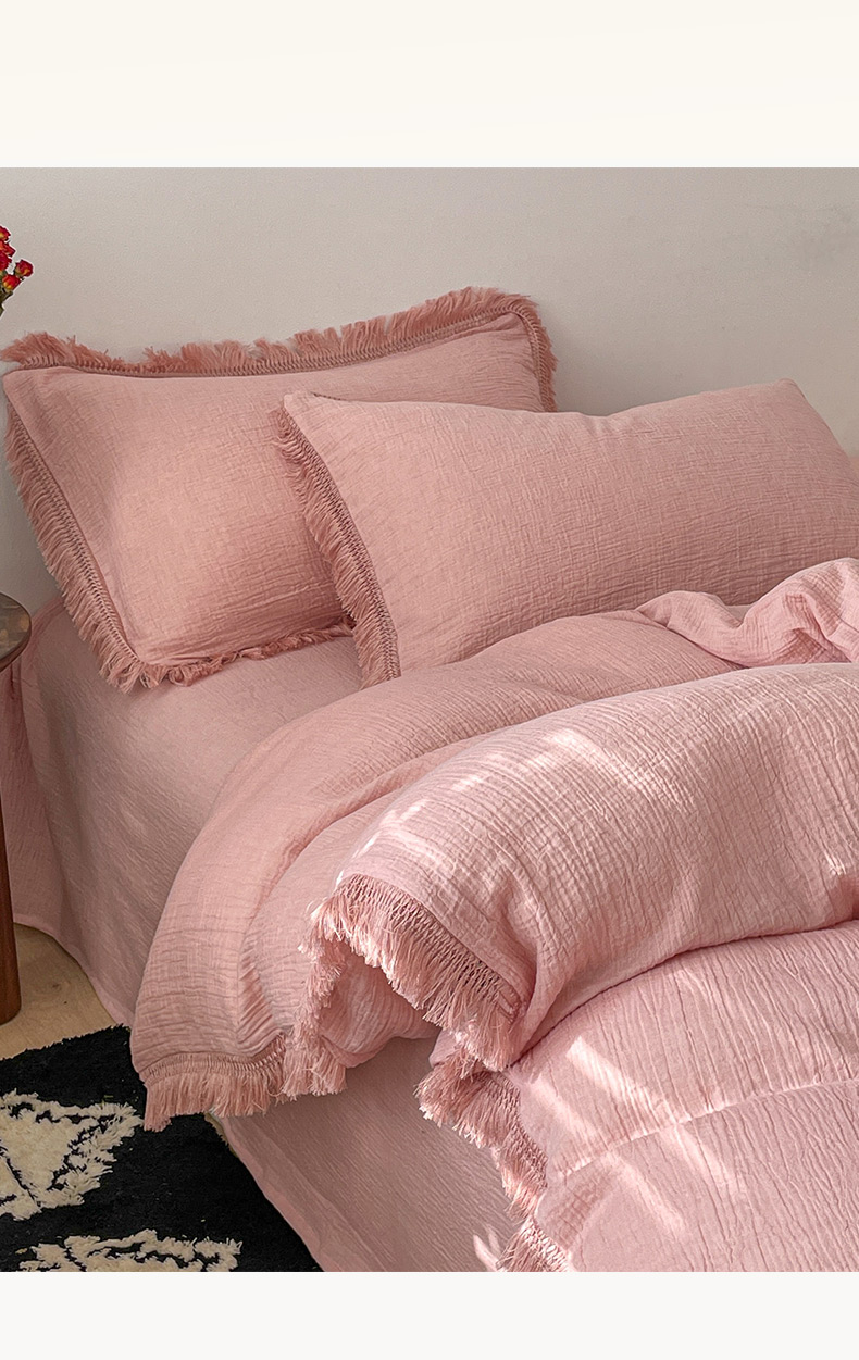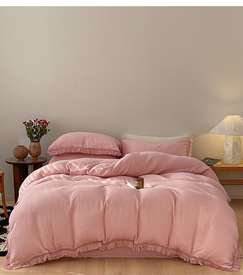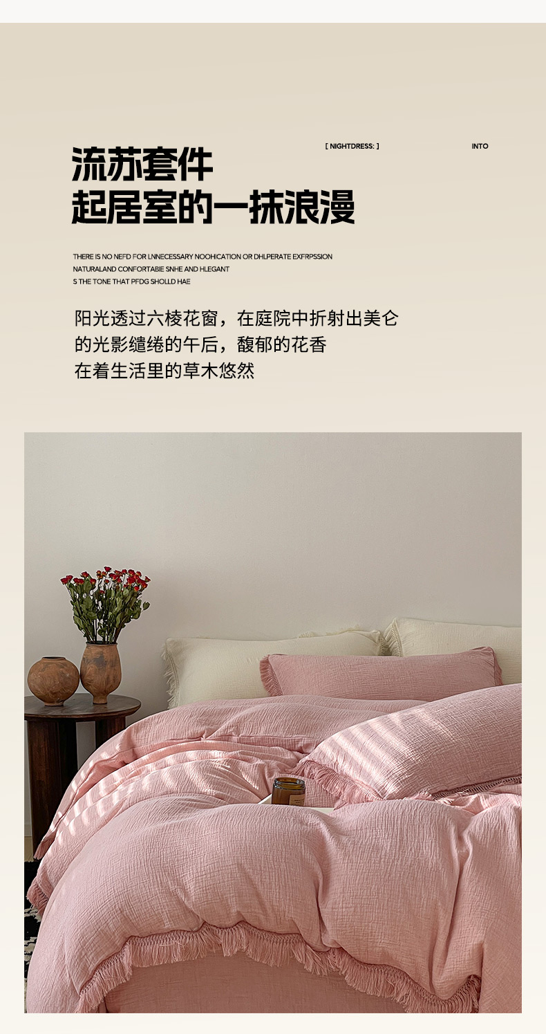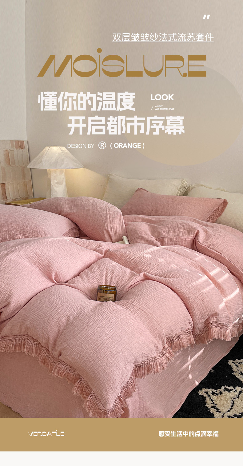 商品名称:卡巴伦家纺 2025新款双层皱皱纱法式流苏款四件套【全网控价(折后券后)不低于标准278/加大298元】 西柚-粉