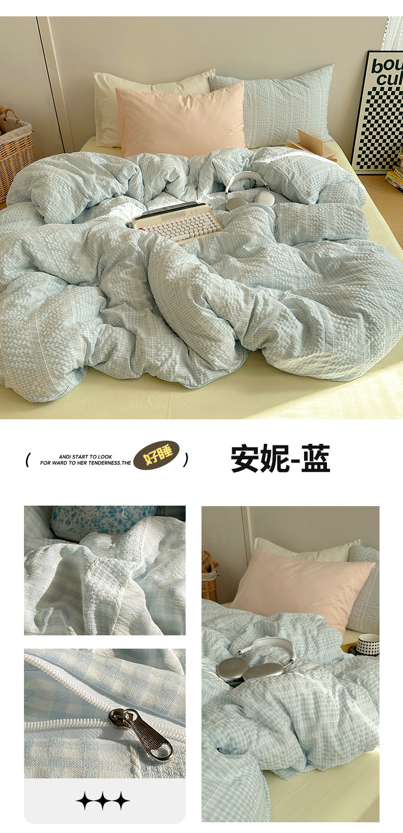 当前位置: 91家纺网 > 商品网购 > 床品套件 > 四件套 > 色织四件套 > 轻奢坊 2025新款色织提花复古格子四件套 安妮-蓝