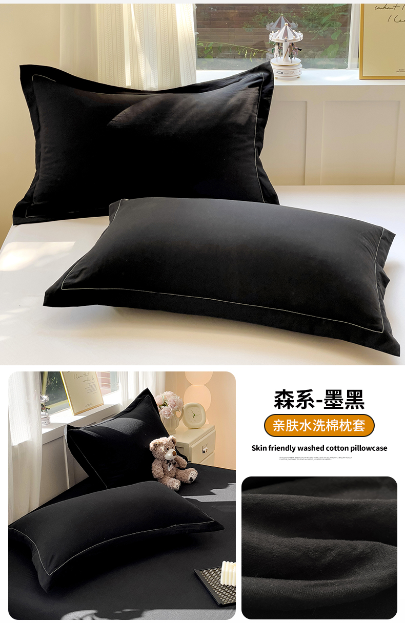 恬澳家纺 2025新款水洗棉森系枕套 森系-墨黑