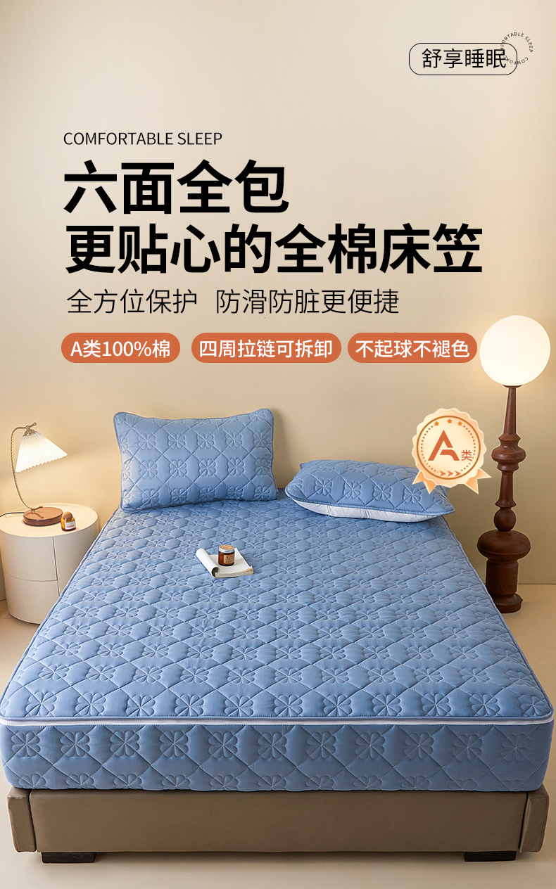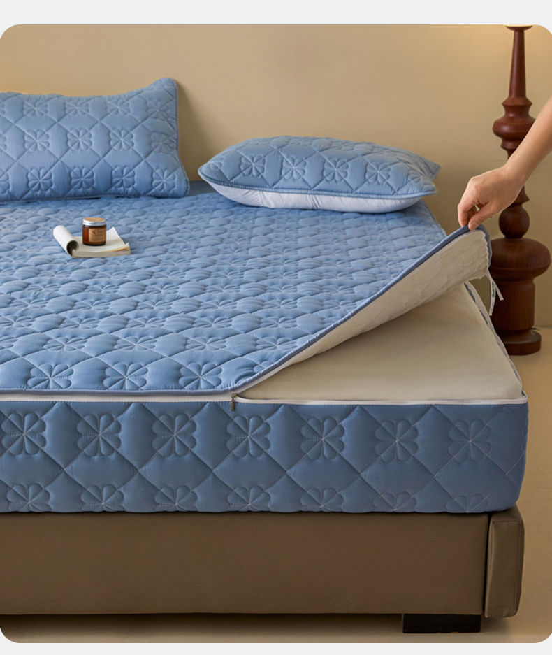 鑫钰2025新款纯棉全棉六面全包床笠 桃花-全包床笠-湖蓝