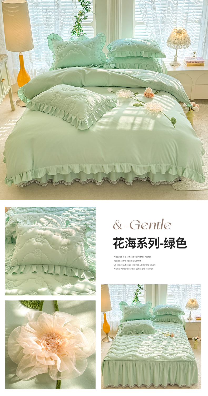 当前位置: 91家纺网 > 商品网购 > 床品套件 > 四件套 > 全棉普通四件套 > 芭比蔓家纺 2025新款夹棉床裙四件套-花海系列 花海系列-绿色