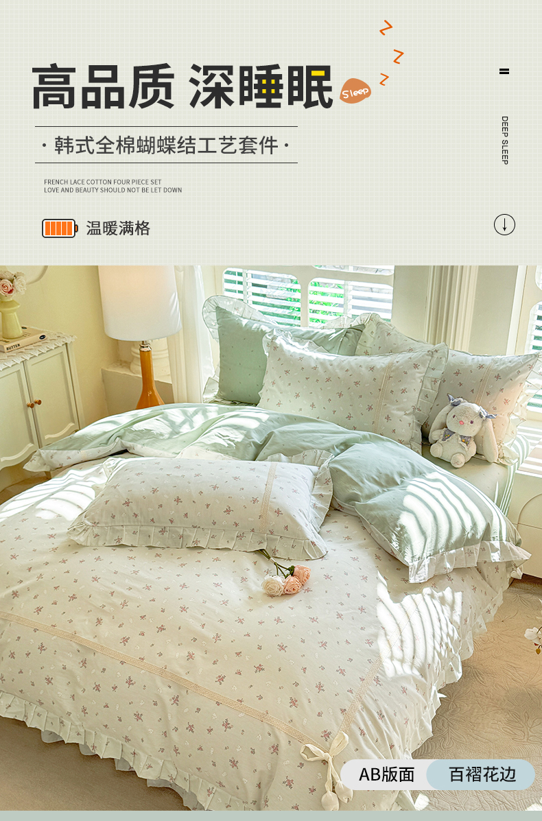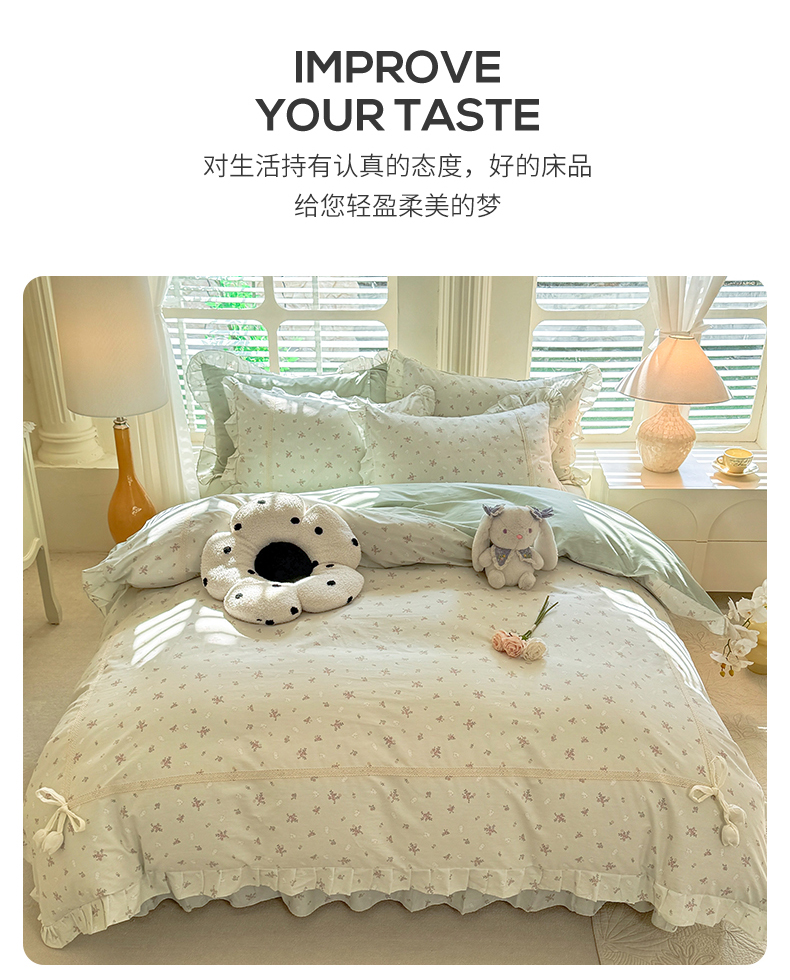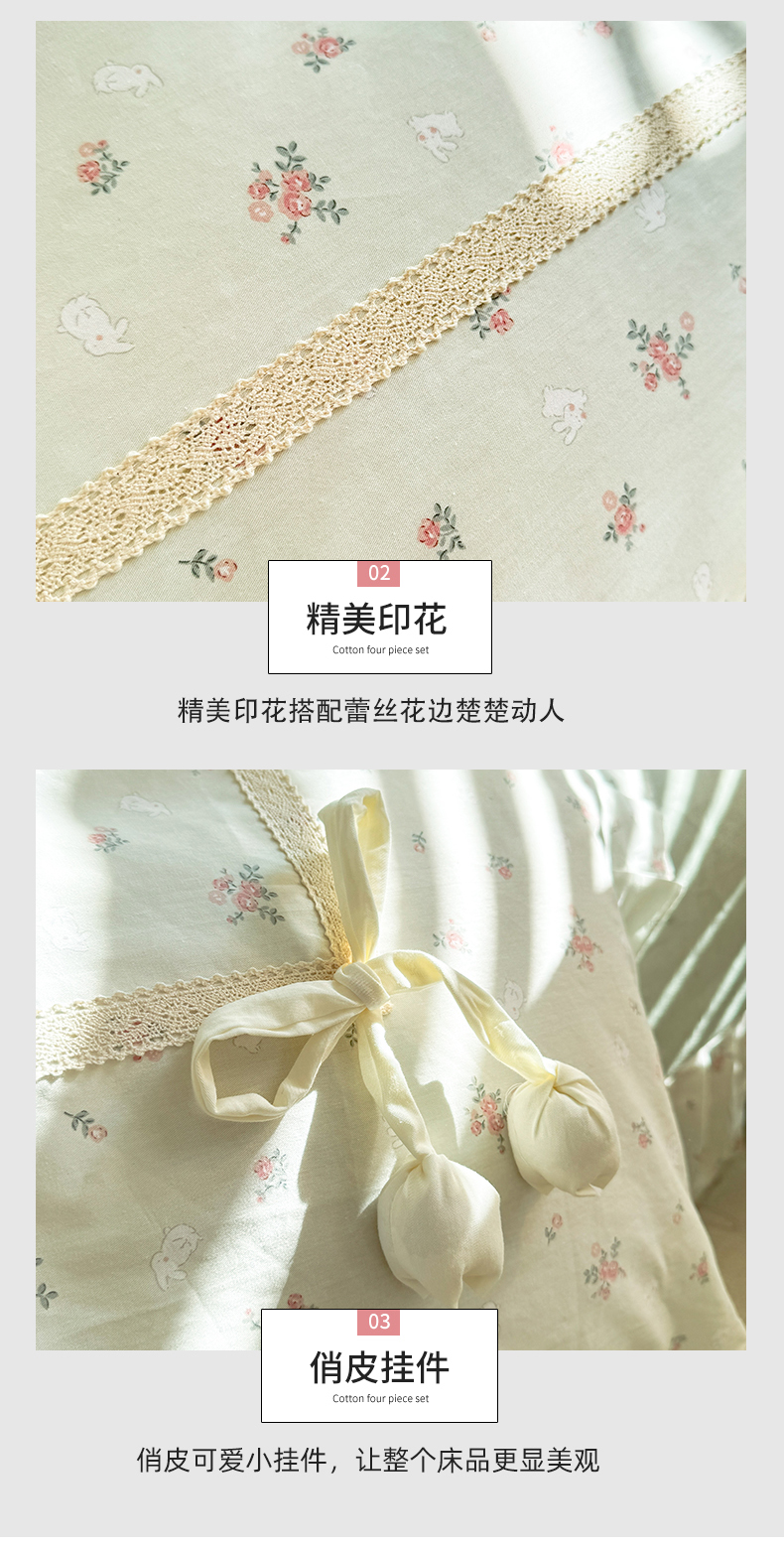 商品名称:艾唯希家纺 2025新款韩式全棉蝴蝶结工艺四件套纯棉公主风花边系列 顽宠-绿
