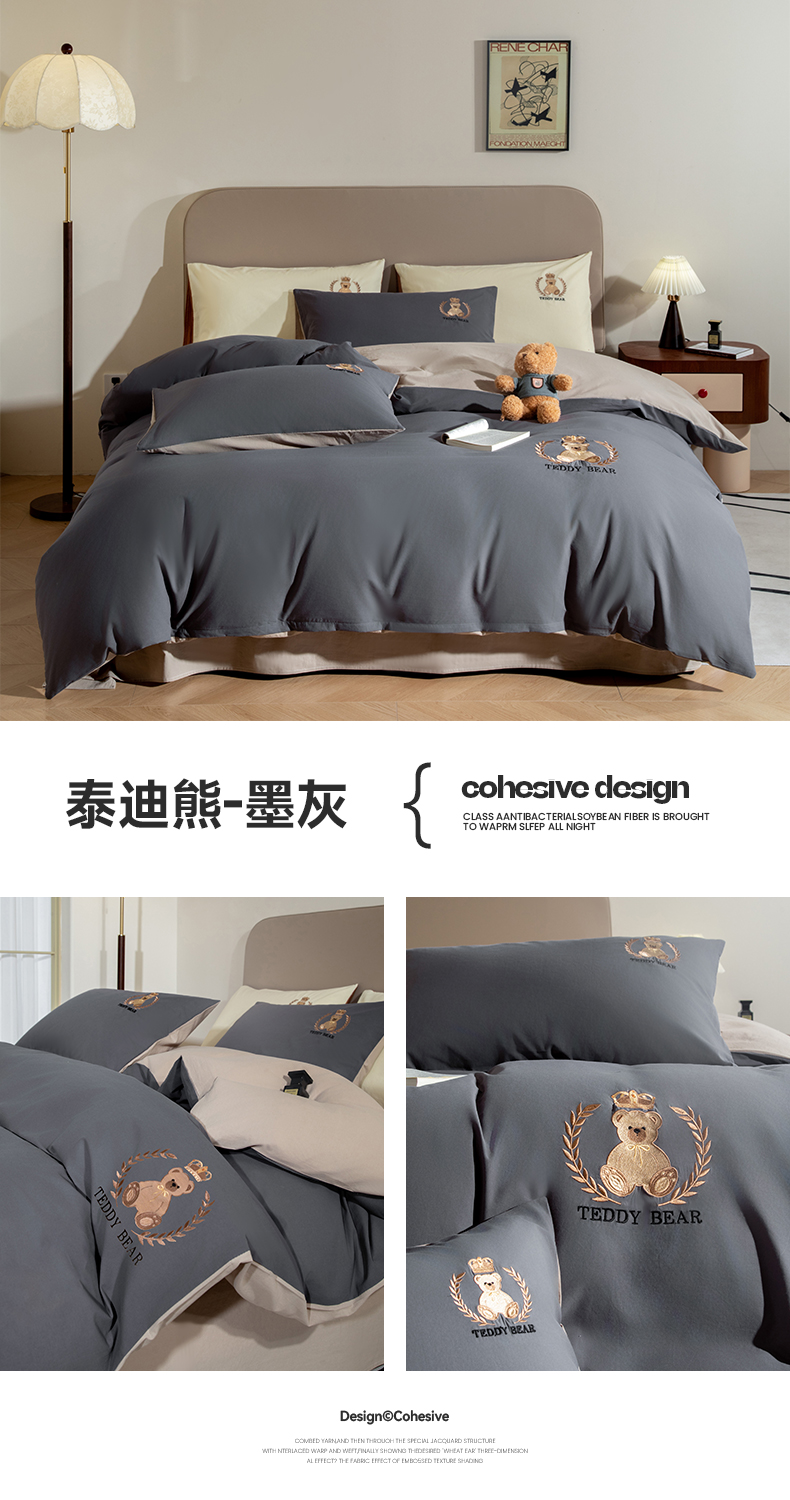 澳梵家居2025新款A类全棉水洗棉刺绣四件套-泰迪小熊 泰迪熊-墨灰