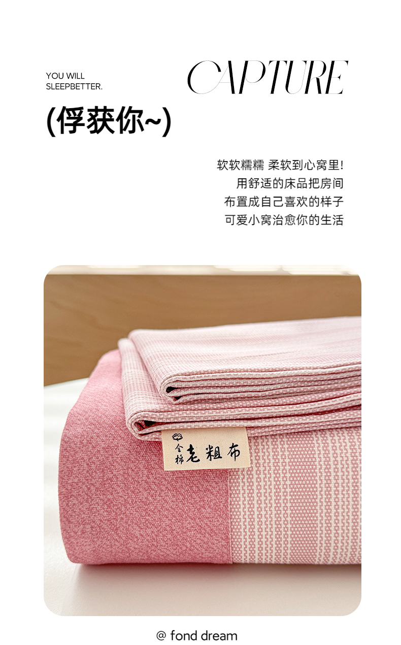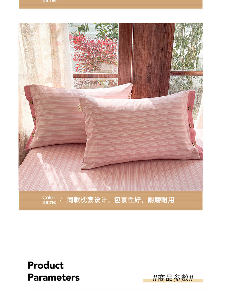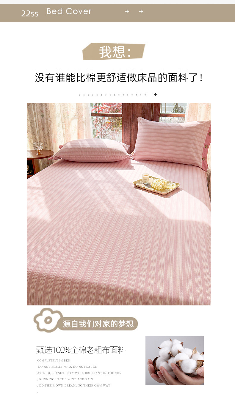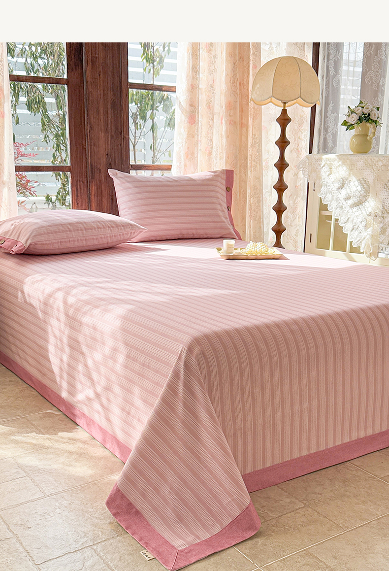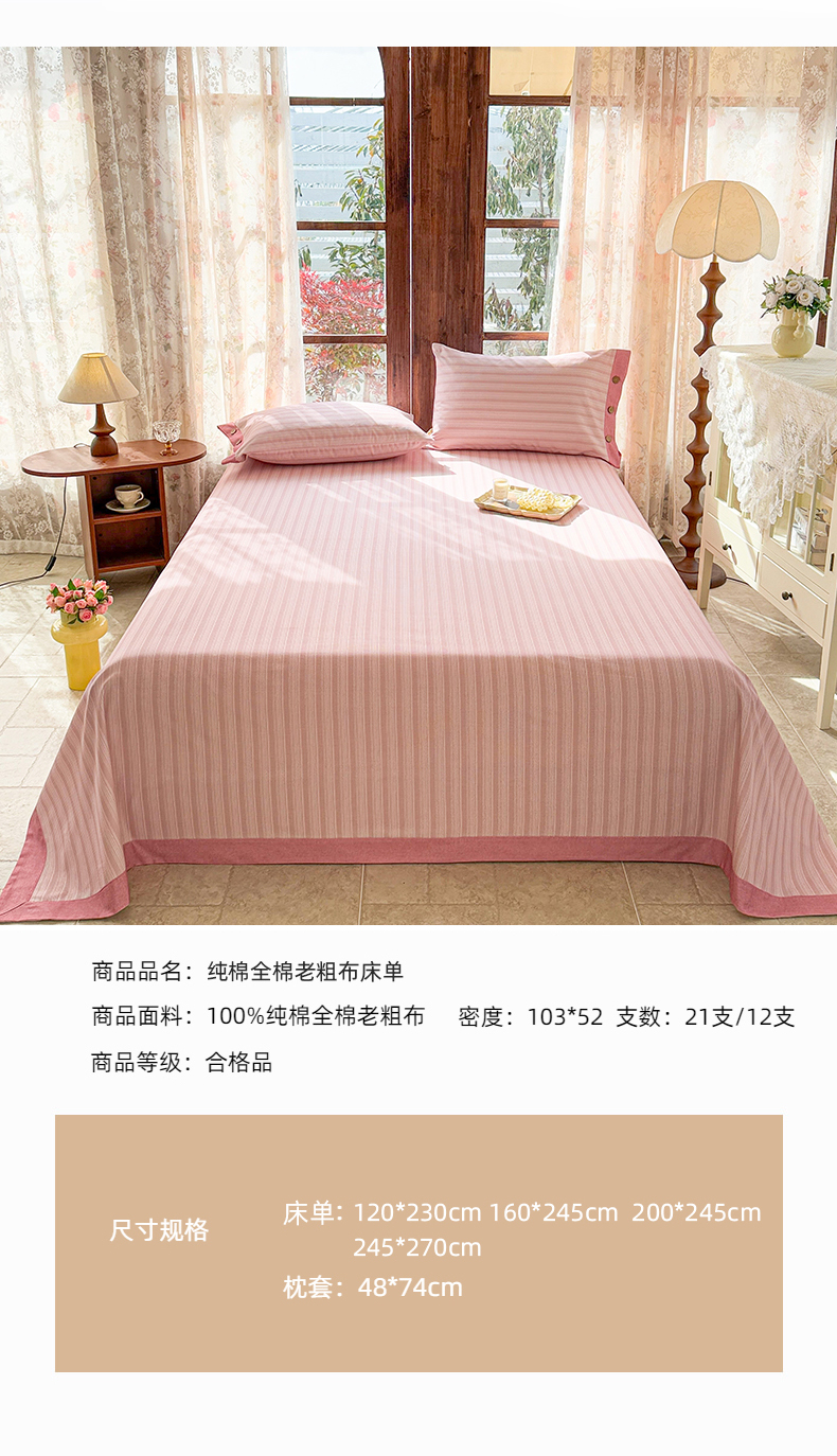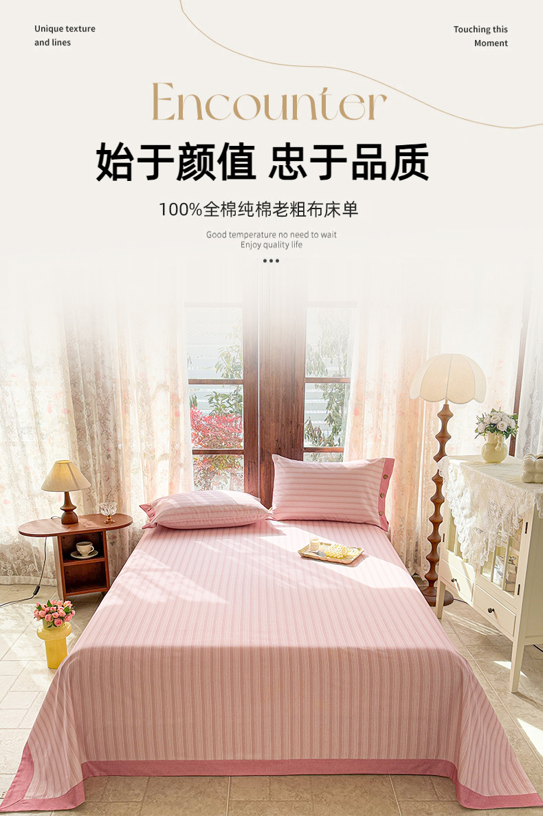 • 91家纺网 家纺一手货源 找家纺 简宜家居 2025新款宽边纯棉全棉老粗布床单 疏条-粉桃宽边