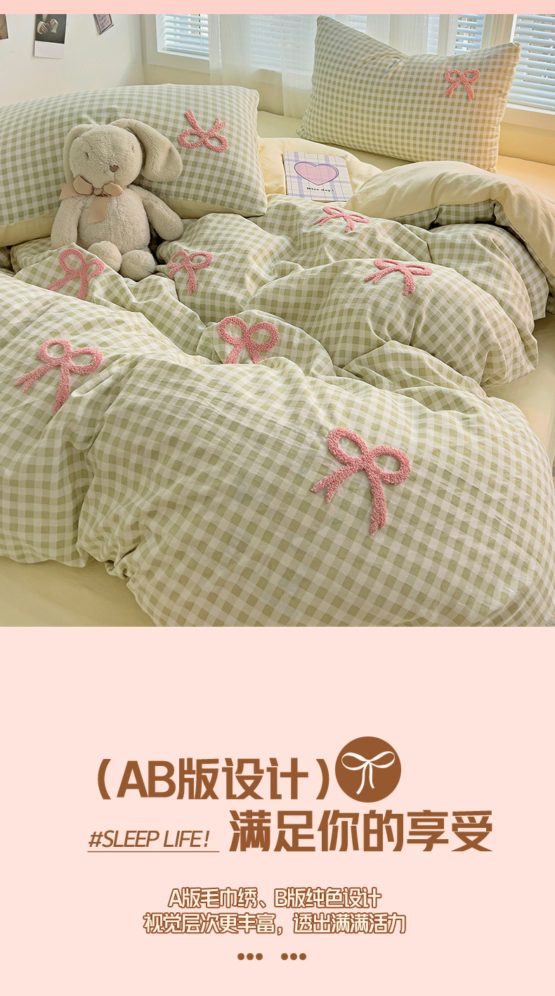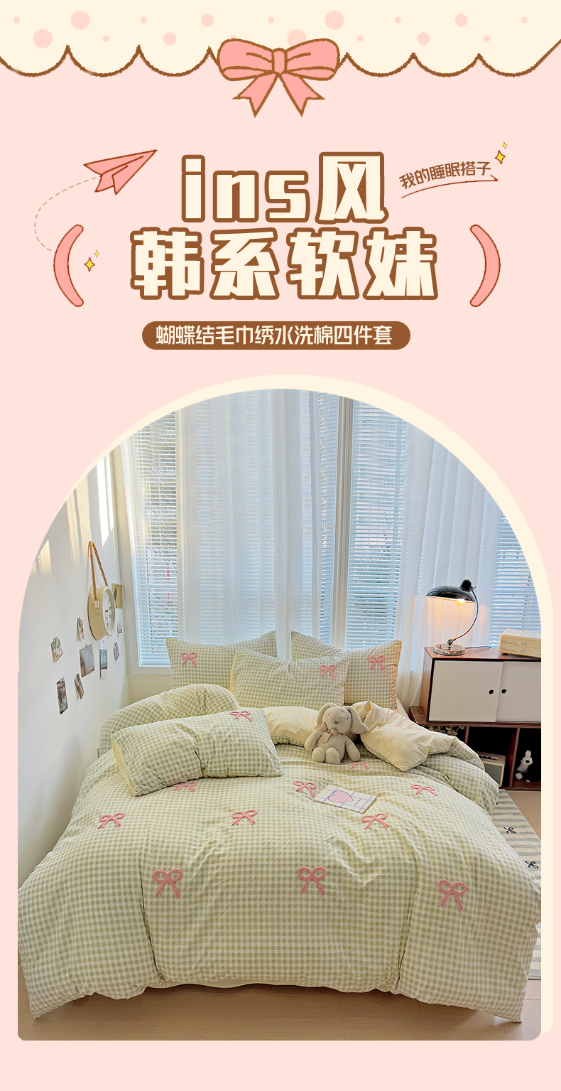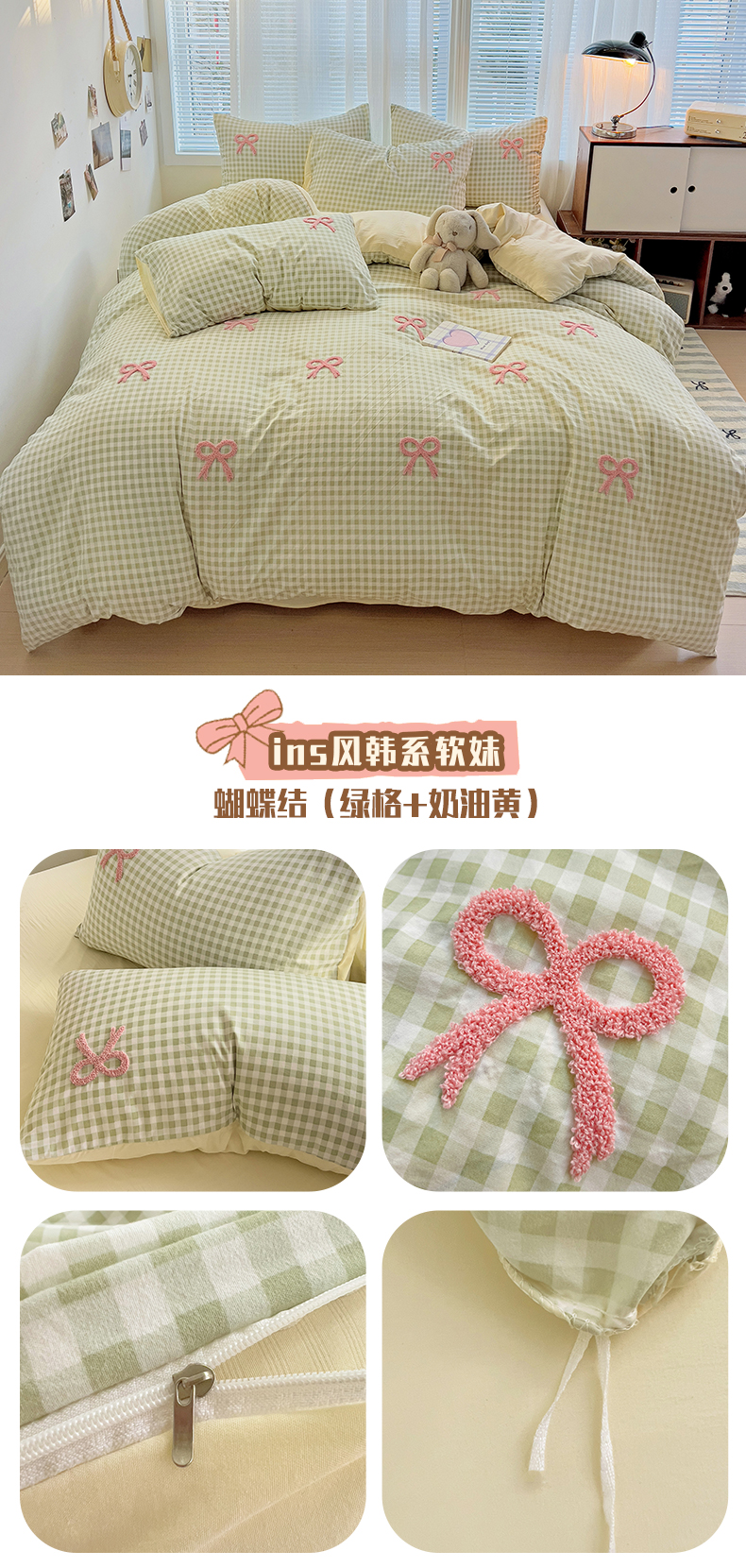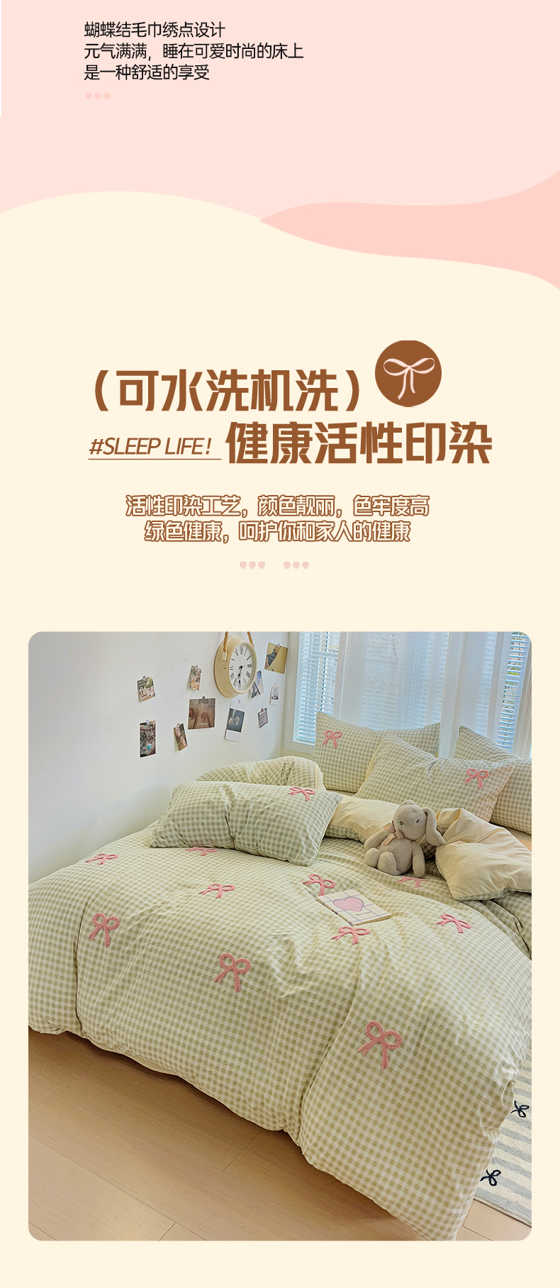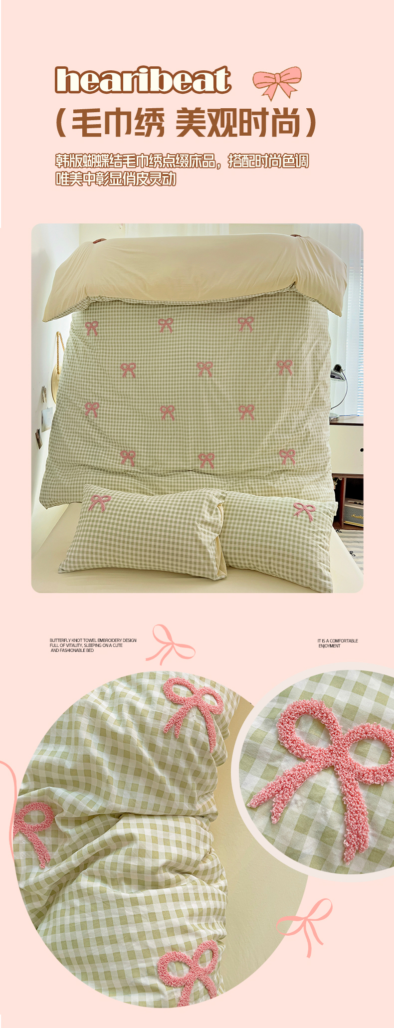 当前位置: 91家纺网 > 商品网购 > 床品套件 > 四件套 > 毛巾绣四件套 > 灰鲸2025新款ins韩系软妹风蝴蝶结毛巾绣四件套 蝴蝶结(绿格+奶油黄)
