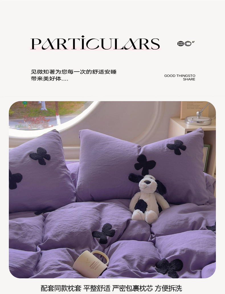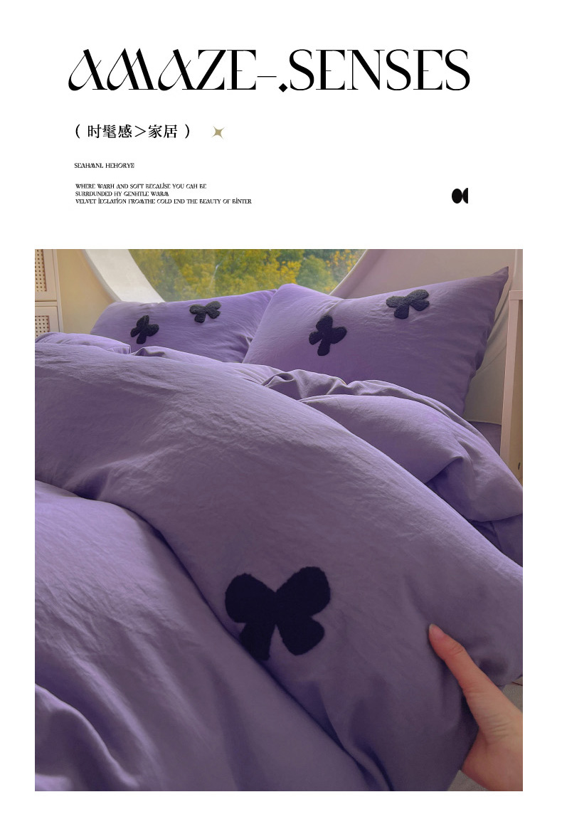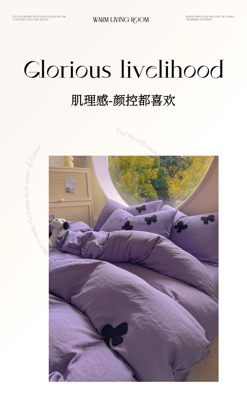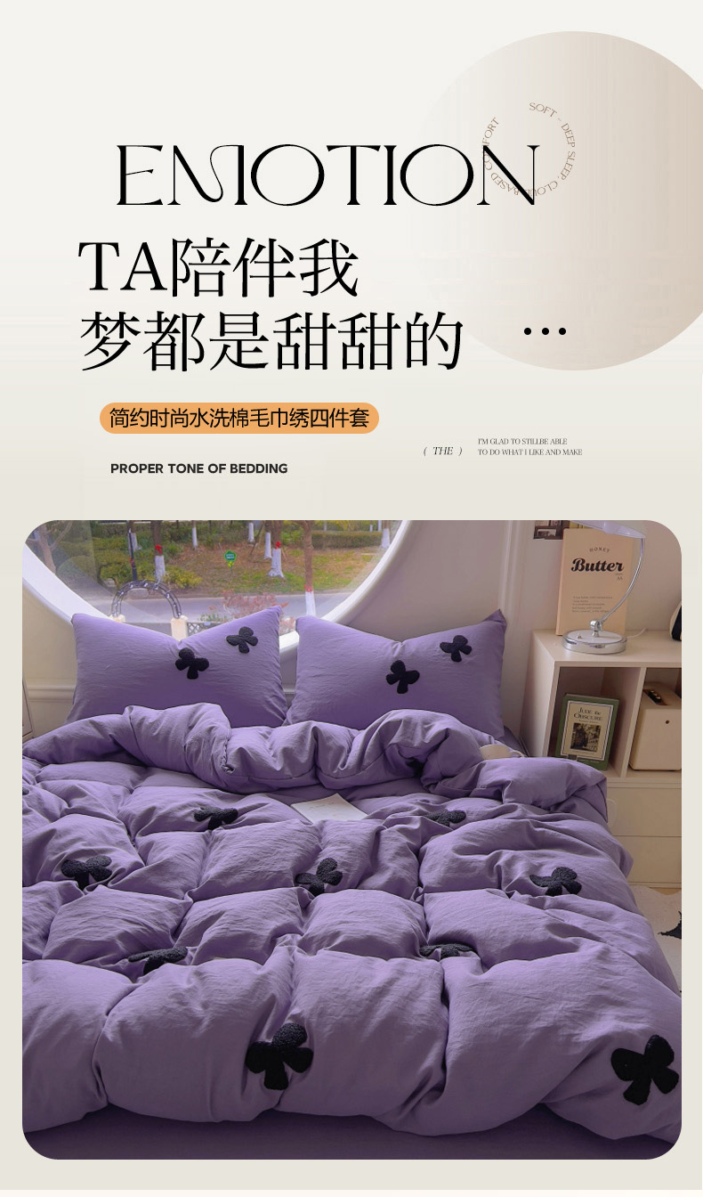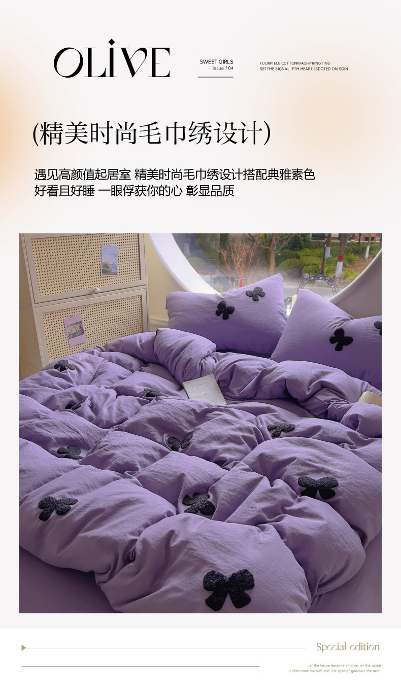当前位置: 91家纺网 > 商品网购 > 床品套件 > 四件套 > 毛巾绣四件套 > 花伞家居 2025新款A类水洗棉蝴蝶结毛巾绣四件套 毛巾绣蝴蝶-深紫