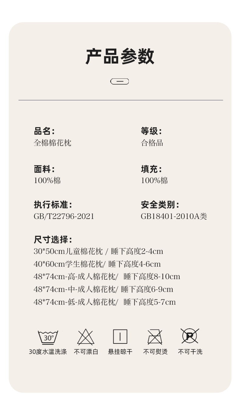(总)贵夫人 2025春夏新款100%纯棉花枕枕头枕芯—亲子系列,本色 30x50cm/只,本色 40x60cm/只,本色 48x74cm/只 低枕,本色 48x74cm/只 中枕,本色 48x74cm/只 高枕