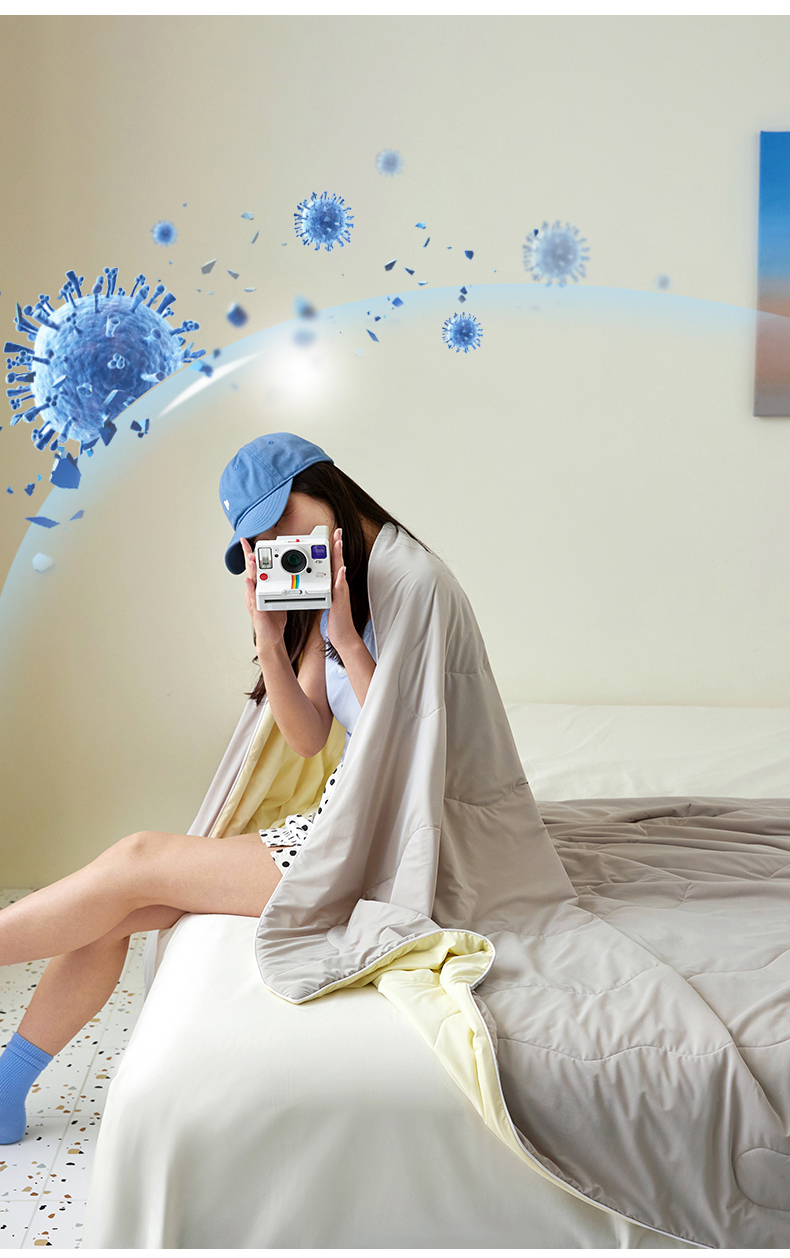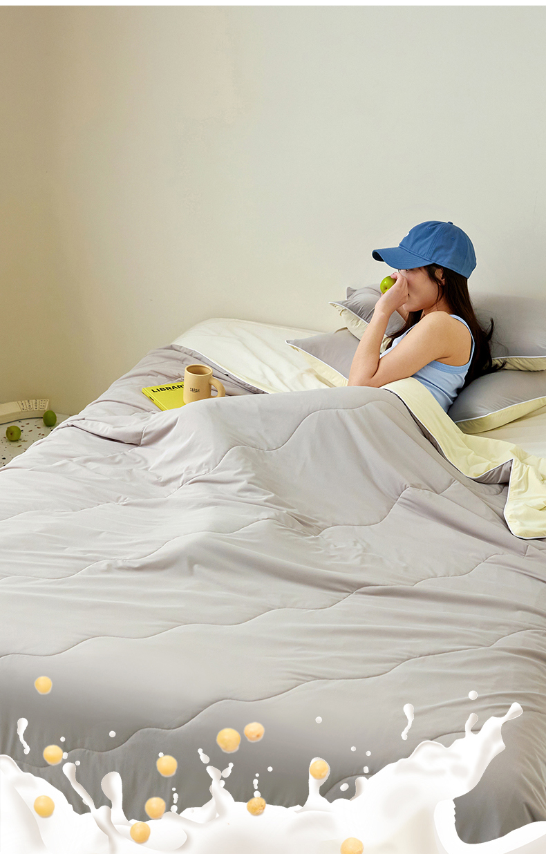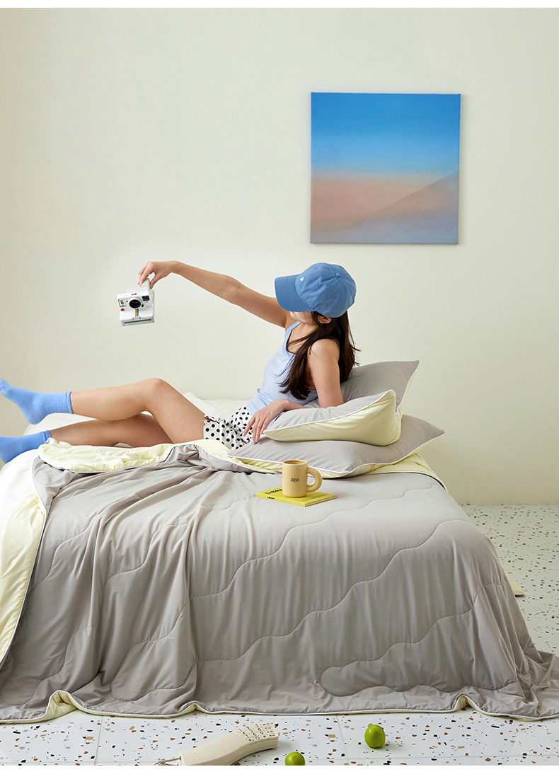 商品名称:头等舱 2025新款锦氨凉感A类20大豆7A抗菌纯色空调被夏凉被夏被模特图(配礼盒) 烟灰+米黄