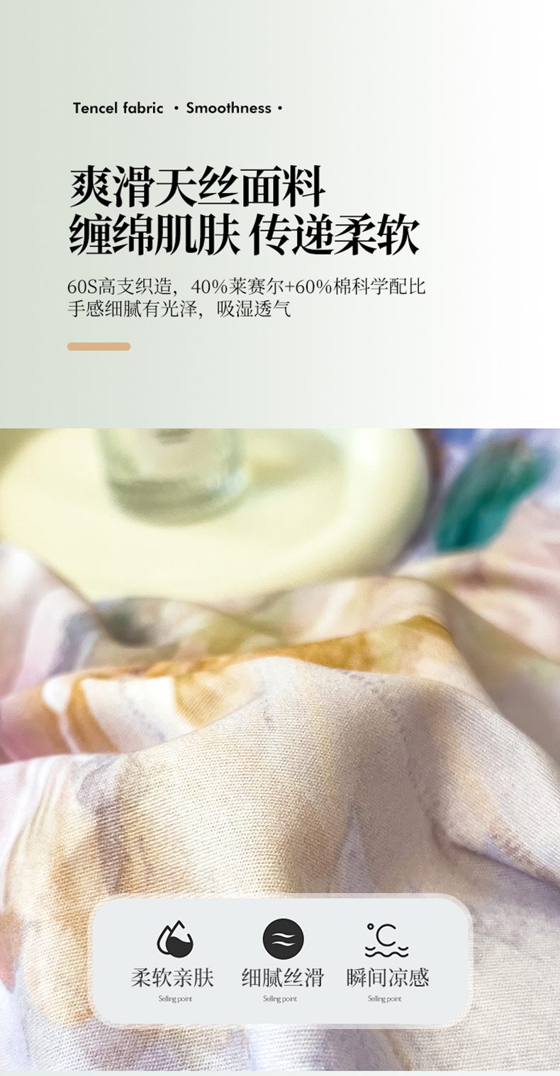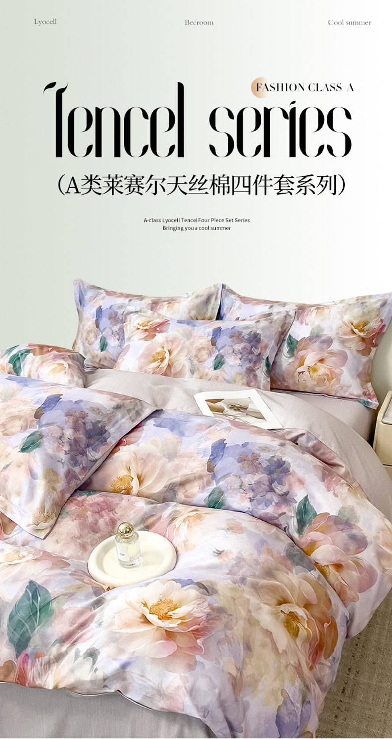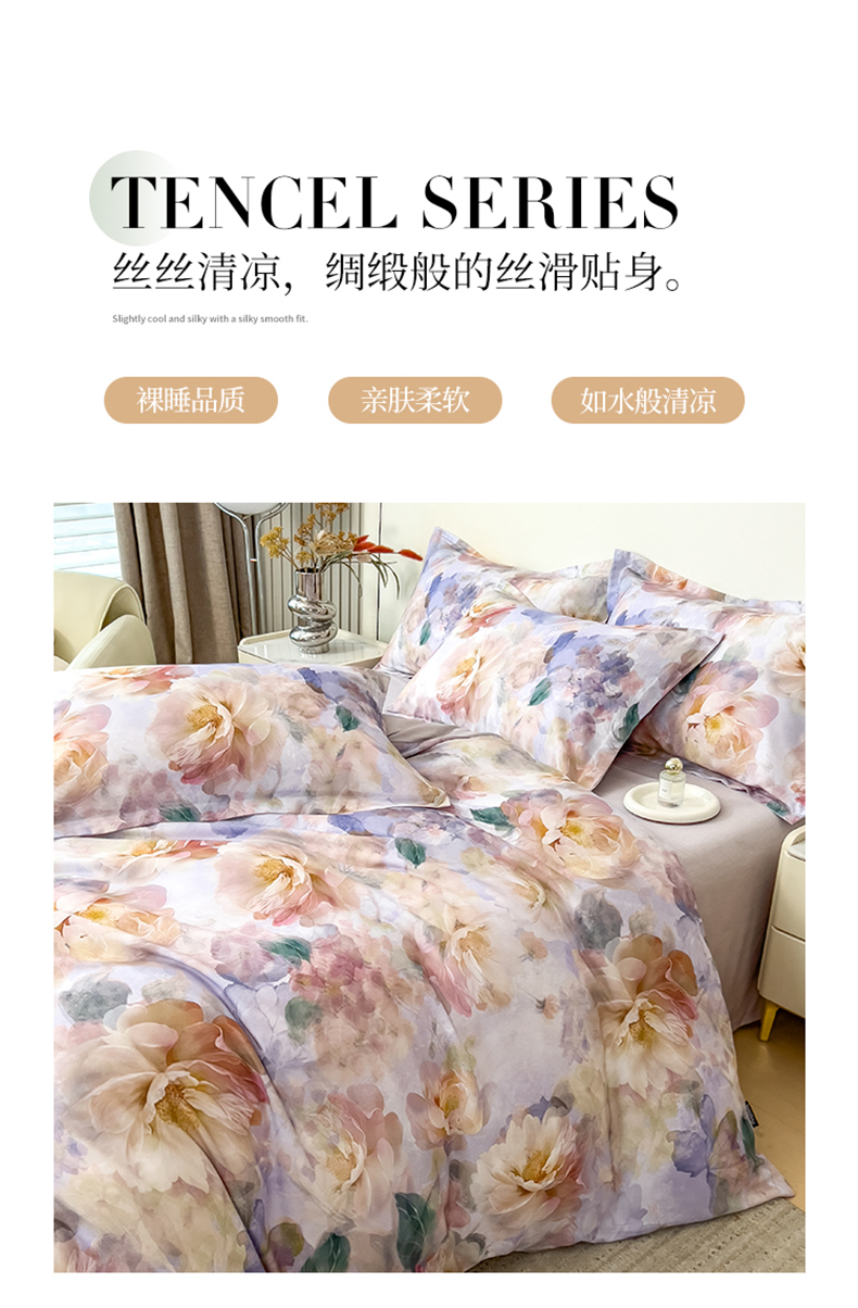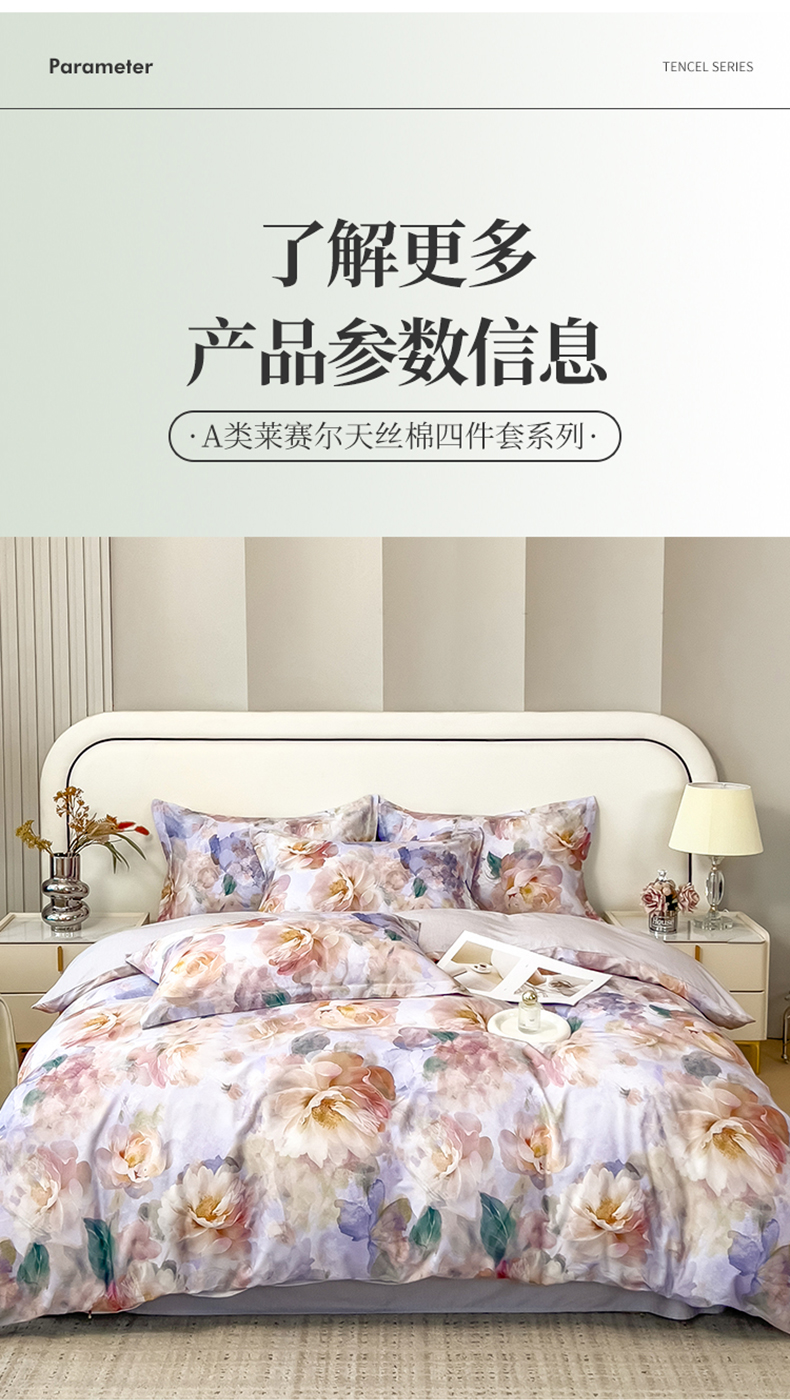 (总)芃成家纺 2025新款A类莱赛尔天丝棉四件套,梦幻花海,缤纷花语,国色天香,花开如画,花舞,奥斯汀玫瑰,春暖花开-粉,春暖花开-紫,春色写意-灰,春色写意-兰,冬雪寒香,繁花满庭,古典玫瑰,国色花韵-粉,国色花韵-玉,花涧入梦,秘境灰,莫奈花园,青花瓷,秋日私语,水墨花卉,晚秋,絮语,烟云牡丹