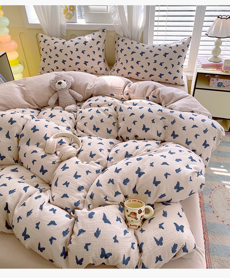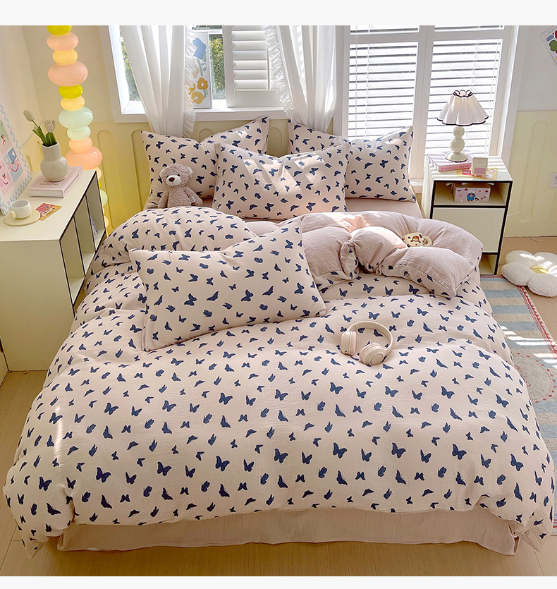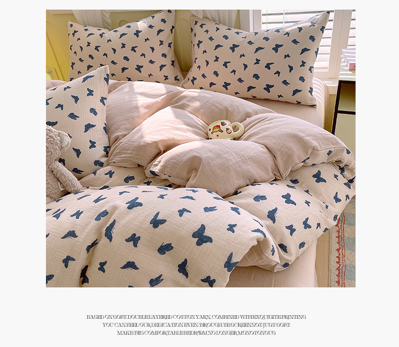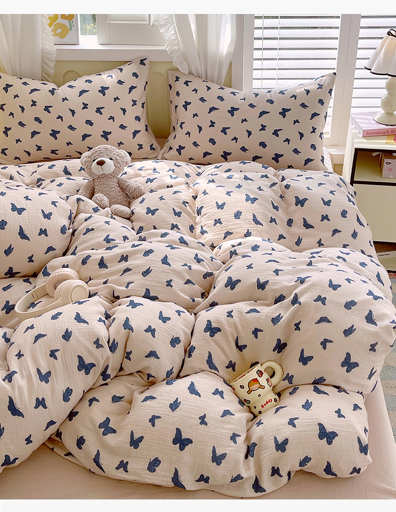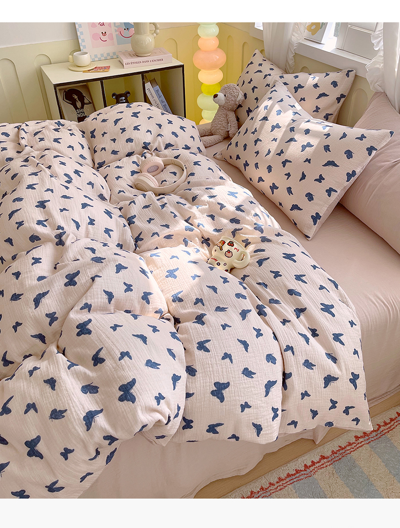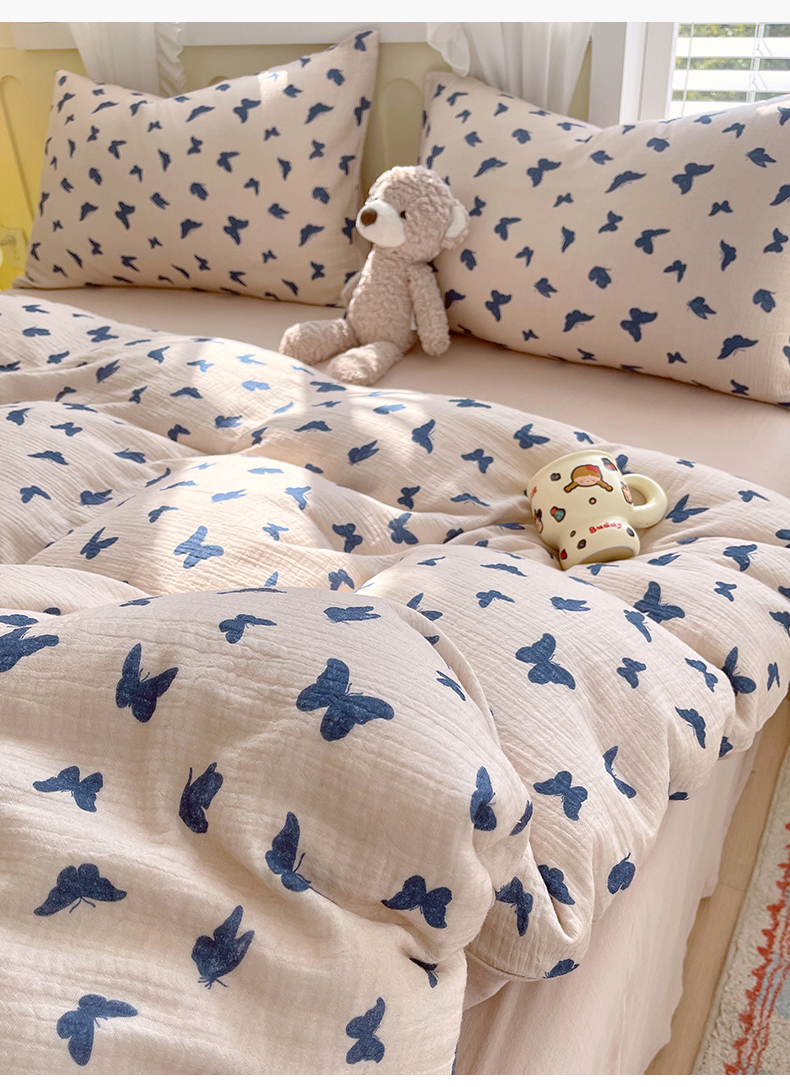 凯磊2025新款.纯棉皱皱纱数码印花四件套 蝴蝶剪影 蓝