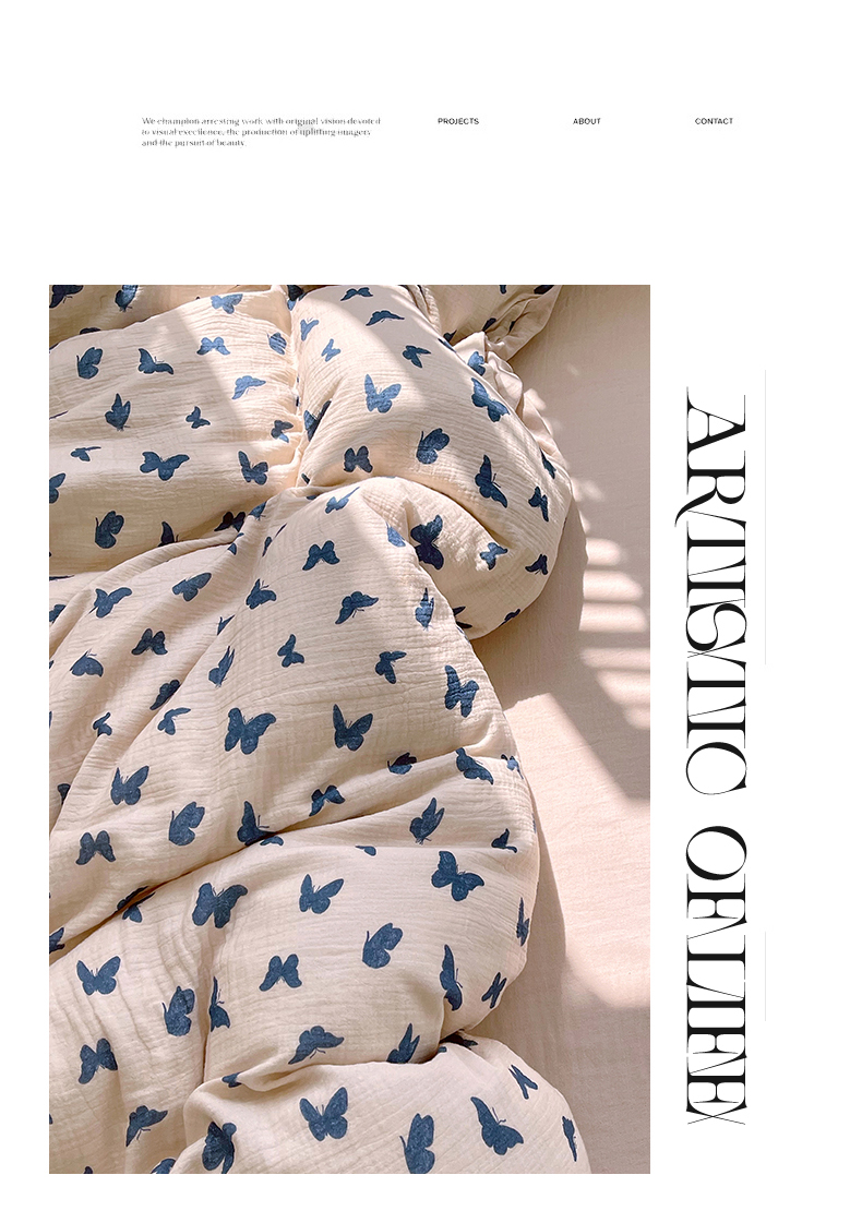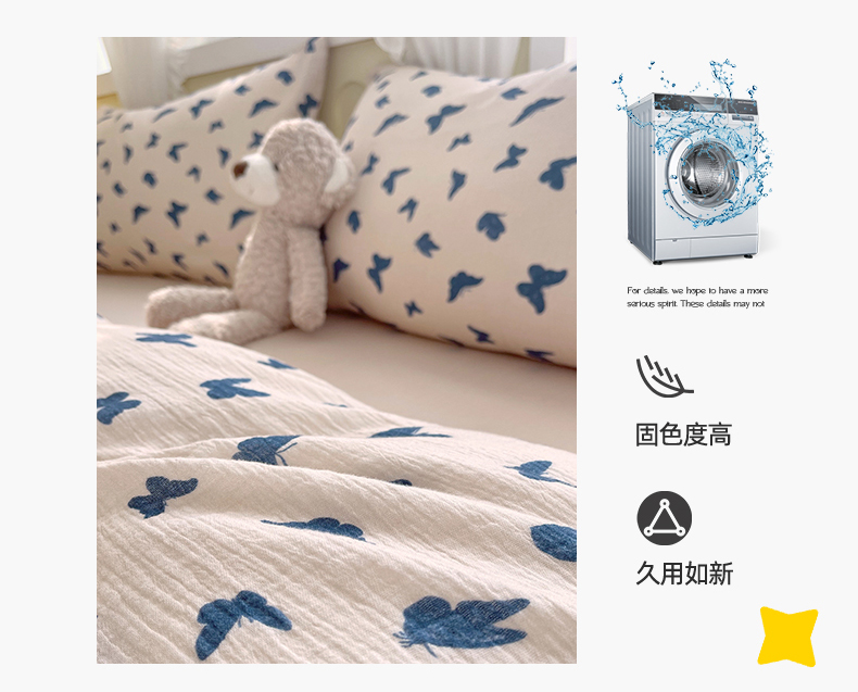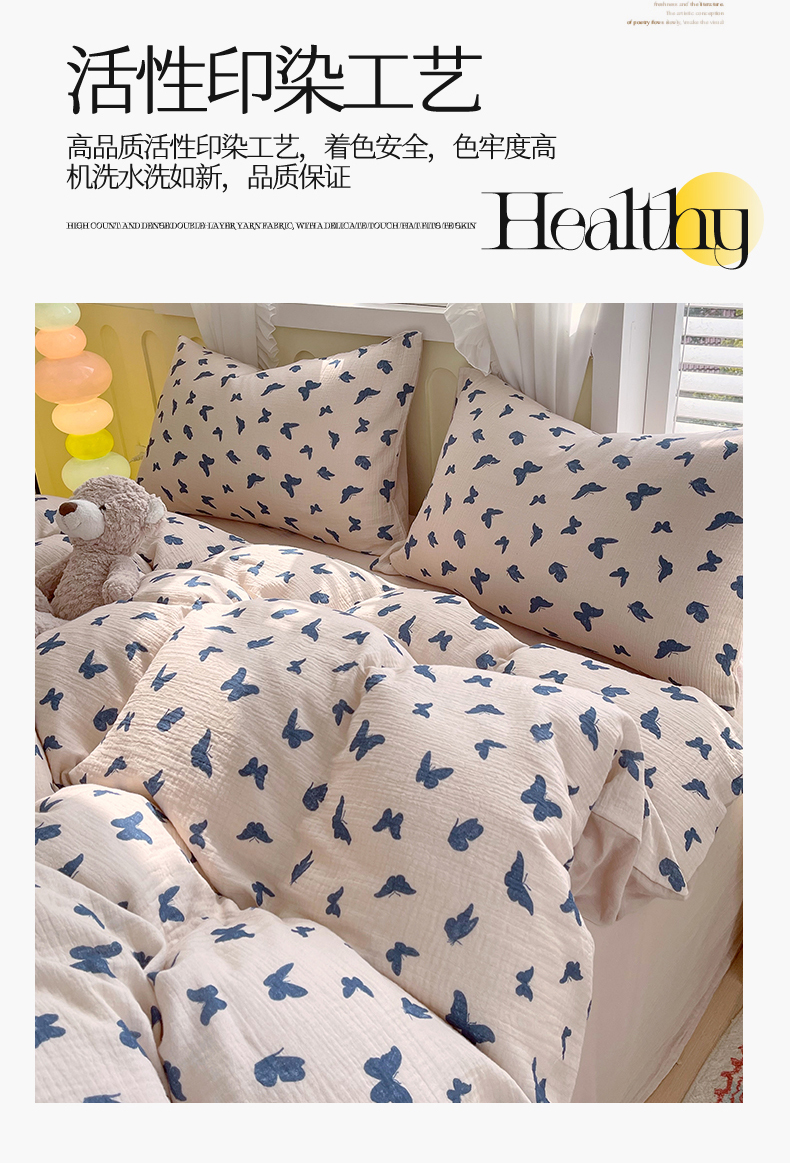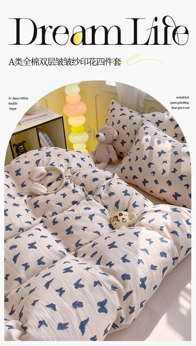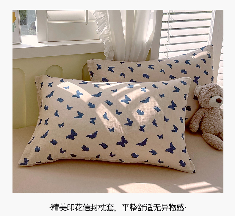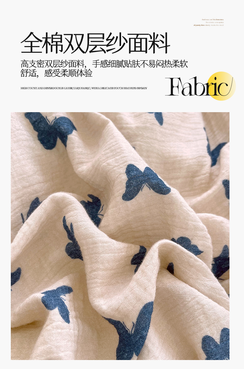 凯磊2025新款.纯棉皱皱纱数码印花四件套 蝴蝶剪影 蓝