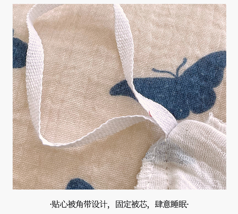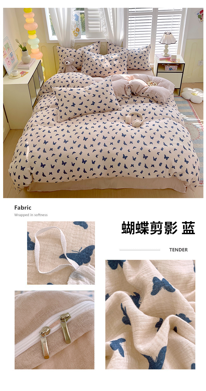 商品名称:凯磊2025新款.纯棉皱皱纱数码印花四件套 蝴蝶剪影 蓝