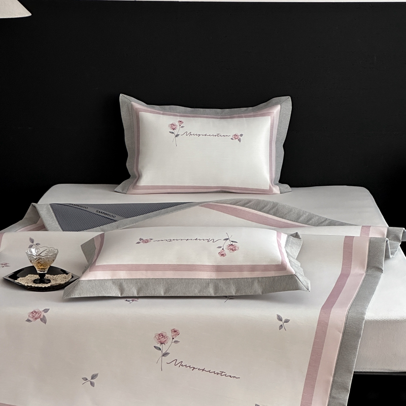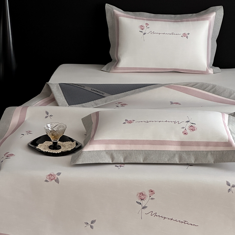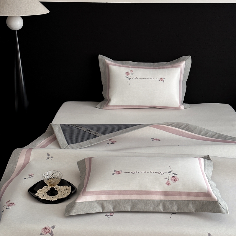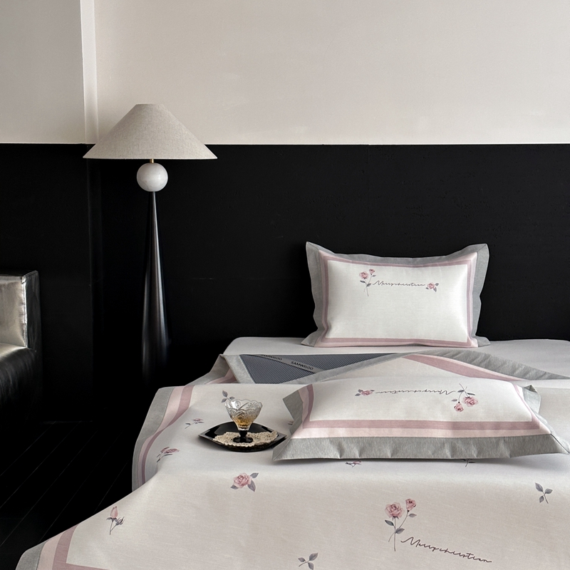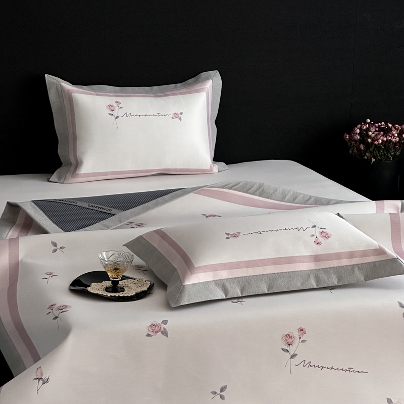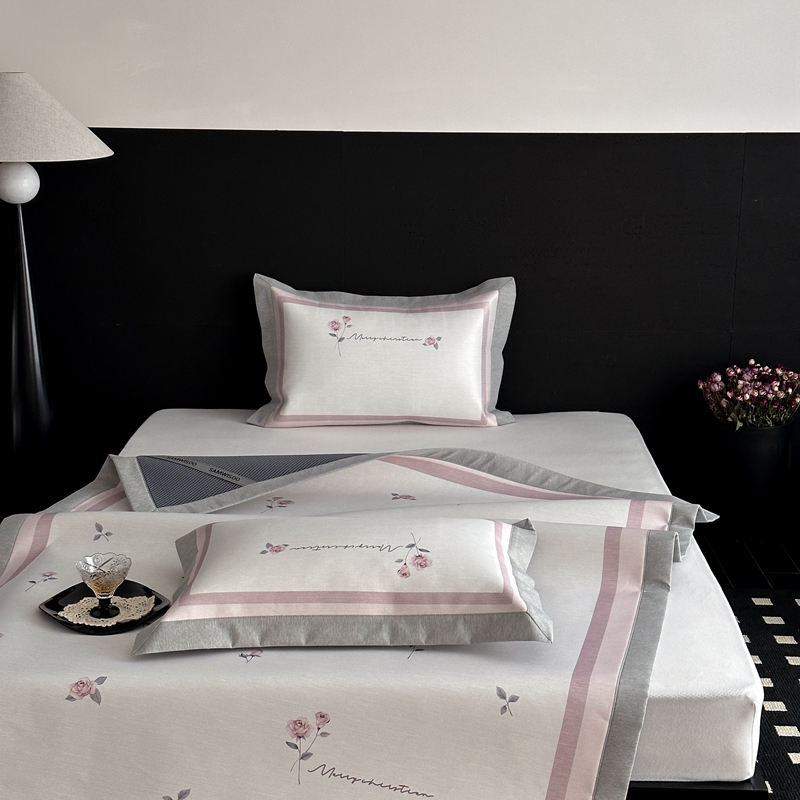 商品名称:三味舒屋 2025新款凉感抗菌南法恬谧系列大版数码印花冰丝床席-床笠 米蕾粉-床席款