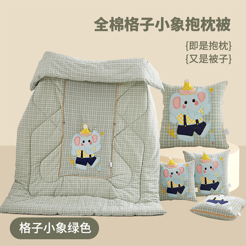 商品名称:古本家居 2025新款四季款全棉格子小象抱枕被 格子小象绿色