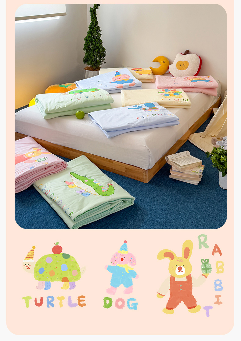 (总)2025新款快乐多巴胺纯棉夏被,粉色彩虹小兔兔,粉色彩虹小猪猪,黄色彩虹小狮子,黄色彩虹小鸭子,蓝色彩虹小狗,蓝色彩虹小象,绿色彩虹小鳄鱼,绿色彩虹小恐龙
