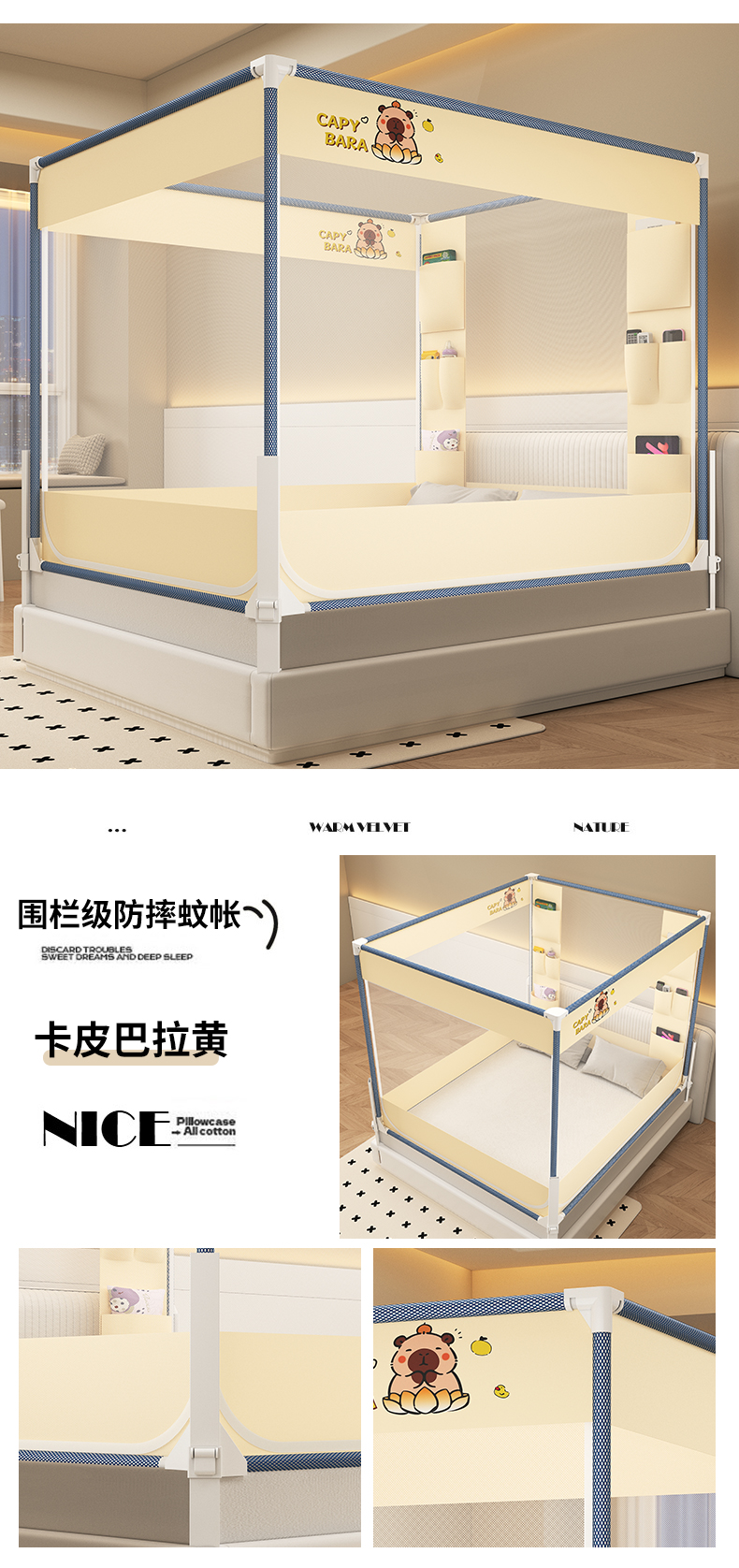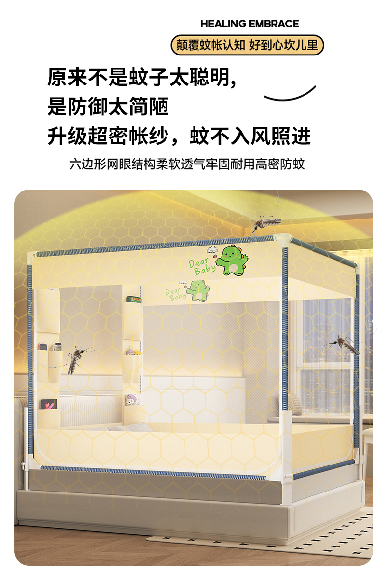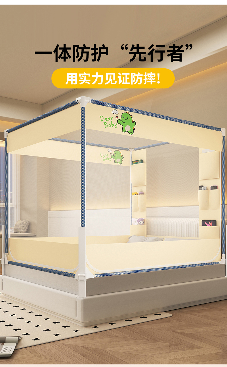 无瑕家居 2025新款高级围栏家用卧室加粗儿童防止掉床超大空间免安装坐床蚊帐围栏款蚊帐储物围栏蚊帐系列 绿色小恐龙
