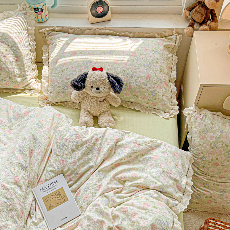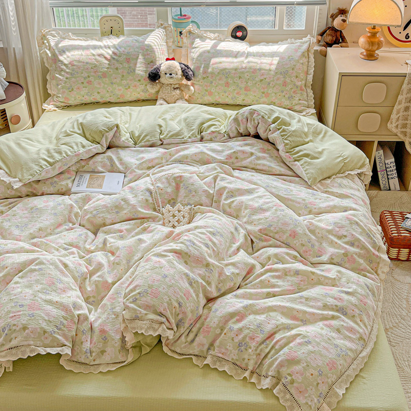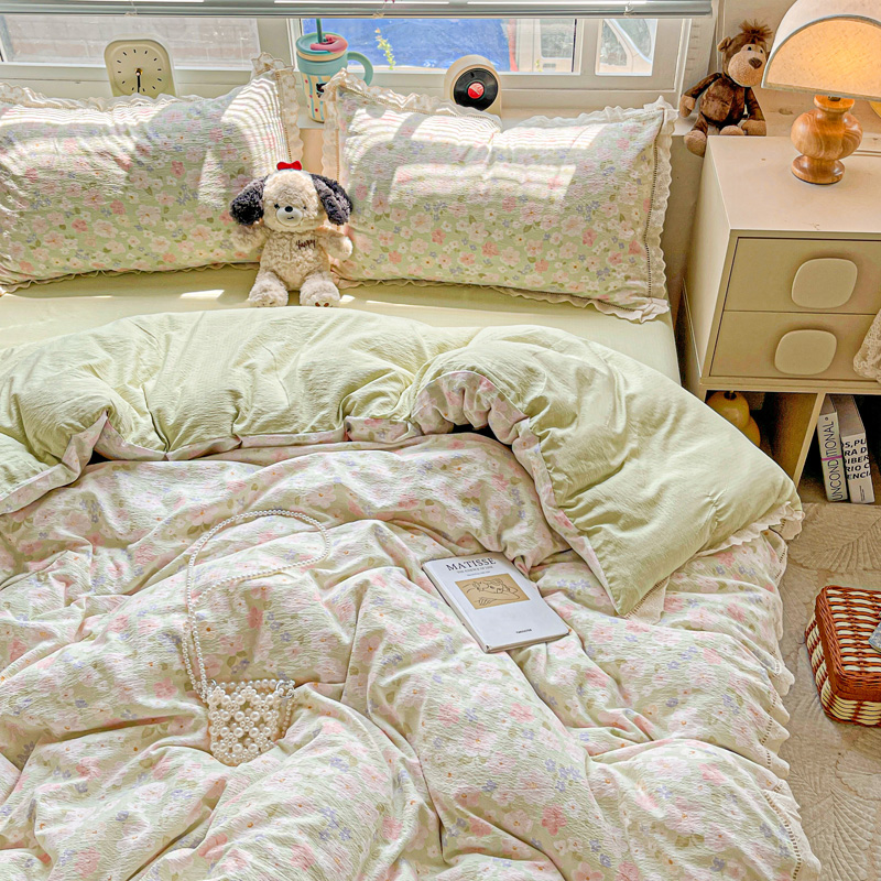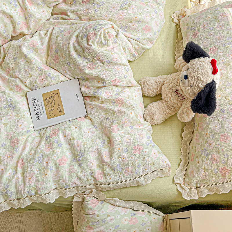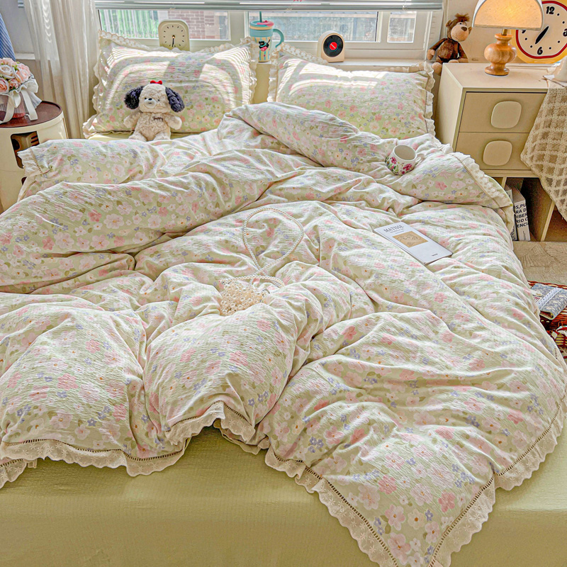 (总)一比一 2026新款云感皱皱双层纱四件套-全棉花边款【控价99元销售】,半夏绿,百福蓝,薄荷微凉,春风里,春晓,豆蔻,蝴蝶梦,可颂,兰黛,山野栀子,素颜,太妃糖,心动,遇见,芝士奶酪,紫爱心,紫苏,花园兔,蜡笔画,小黑兔,白茶-绿,初恋,莱茵河畔,桃花诺