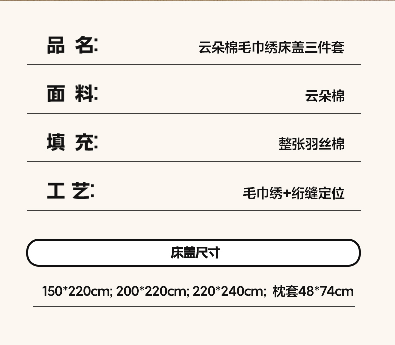 商品名称:(总)鑫喜莱家纺 2025新款毛巾绣云朵棉床盖三件套