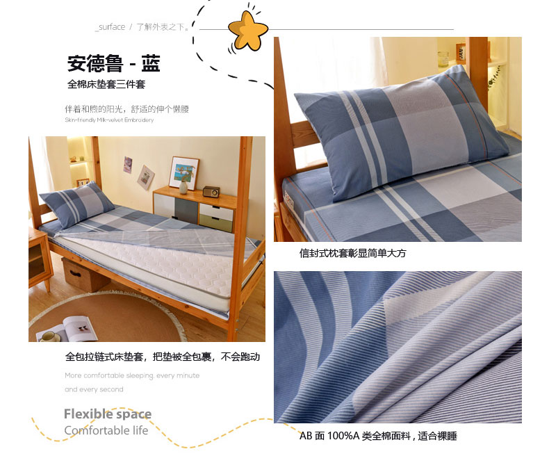 商品名称:水妙家纺 2025新款A类全棉拉链床垫套三件套纯棉学生上下铺全包床垫保护套三件套 可订制 床垫套安德鲁-蓝