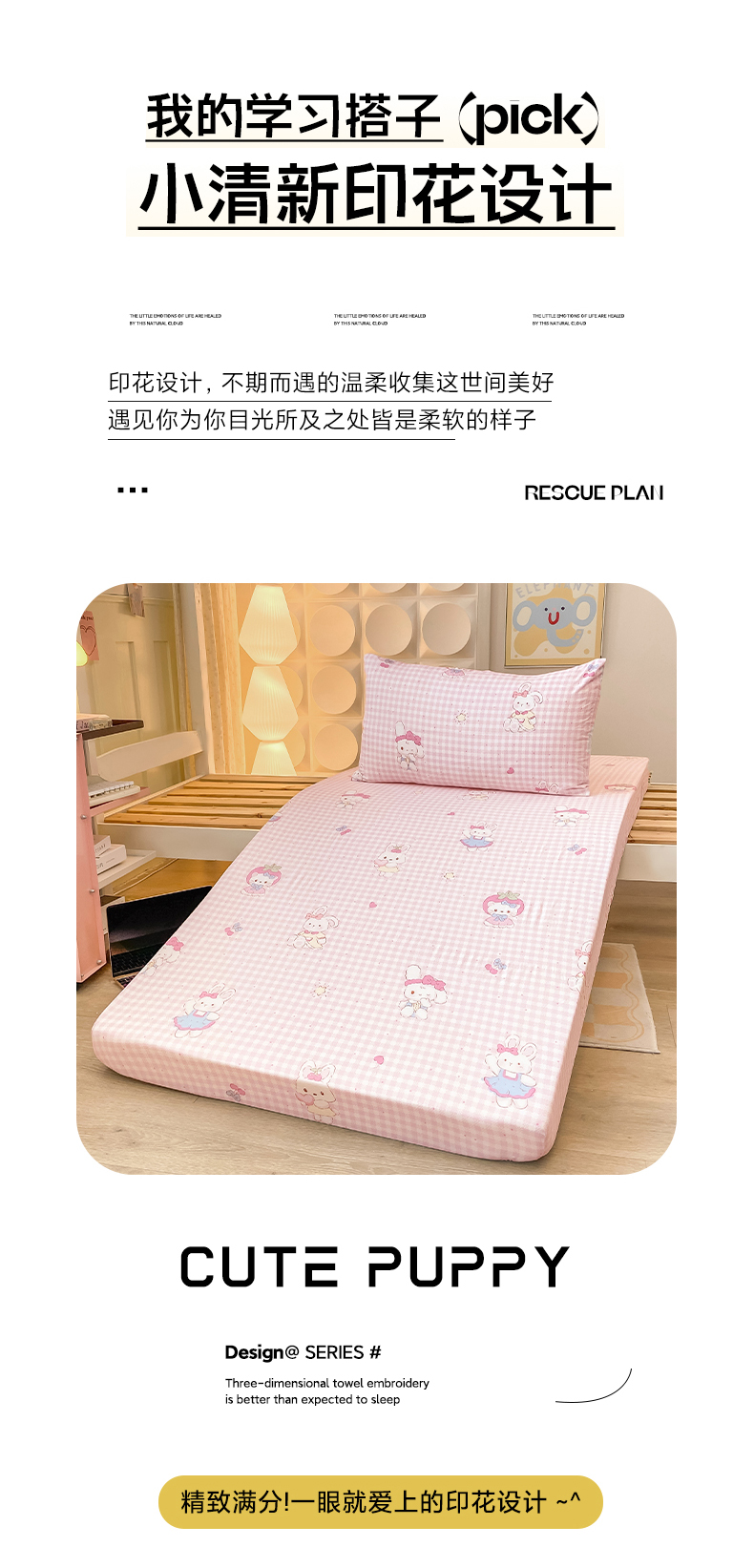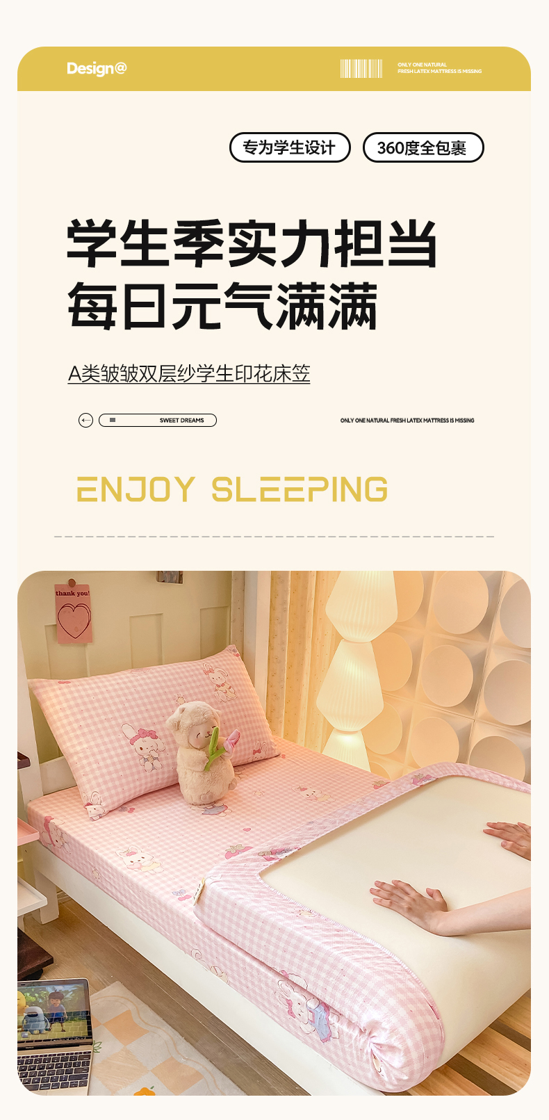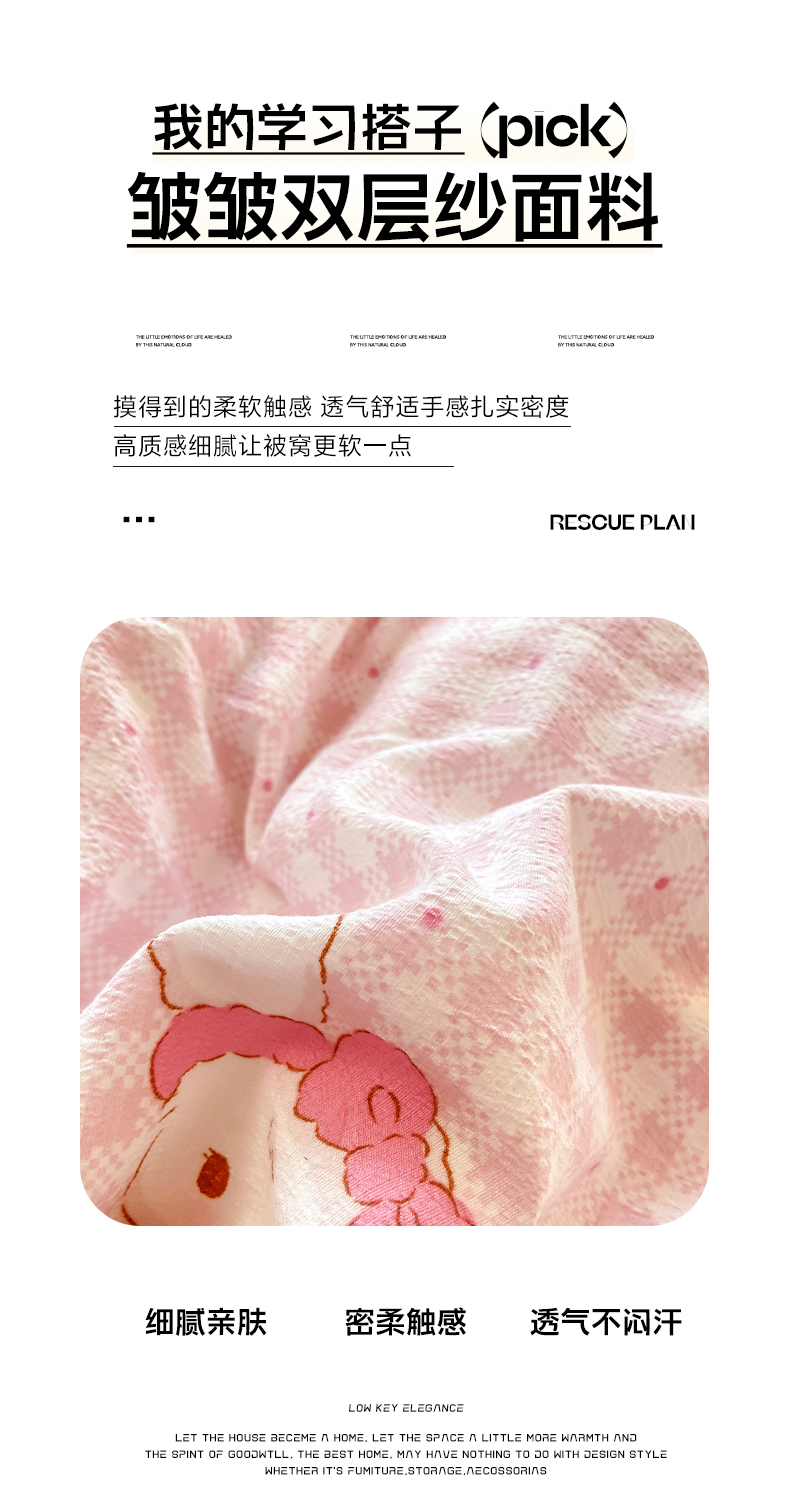 • 91家纺网 家纺一手货源 找家纺 眠势力 2025新款ins云感双层纱学生宿舍上下铺奶油风云感四季款单床笠床笠单件 乖乖兔