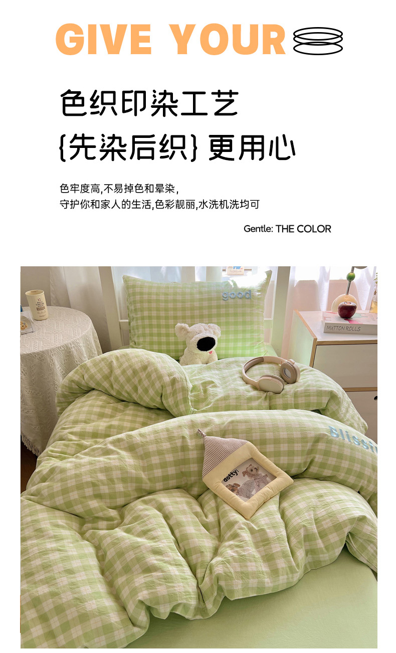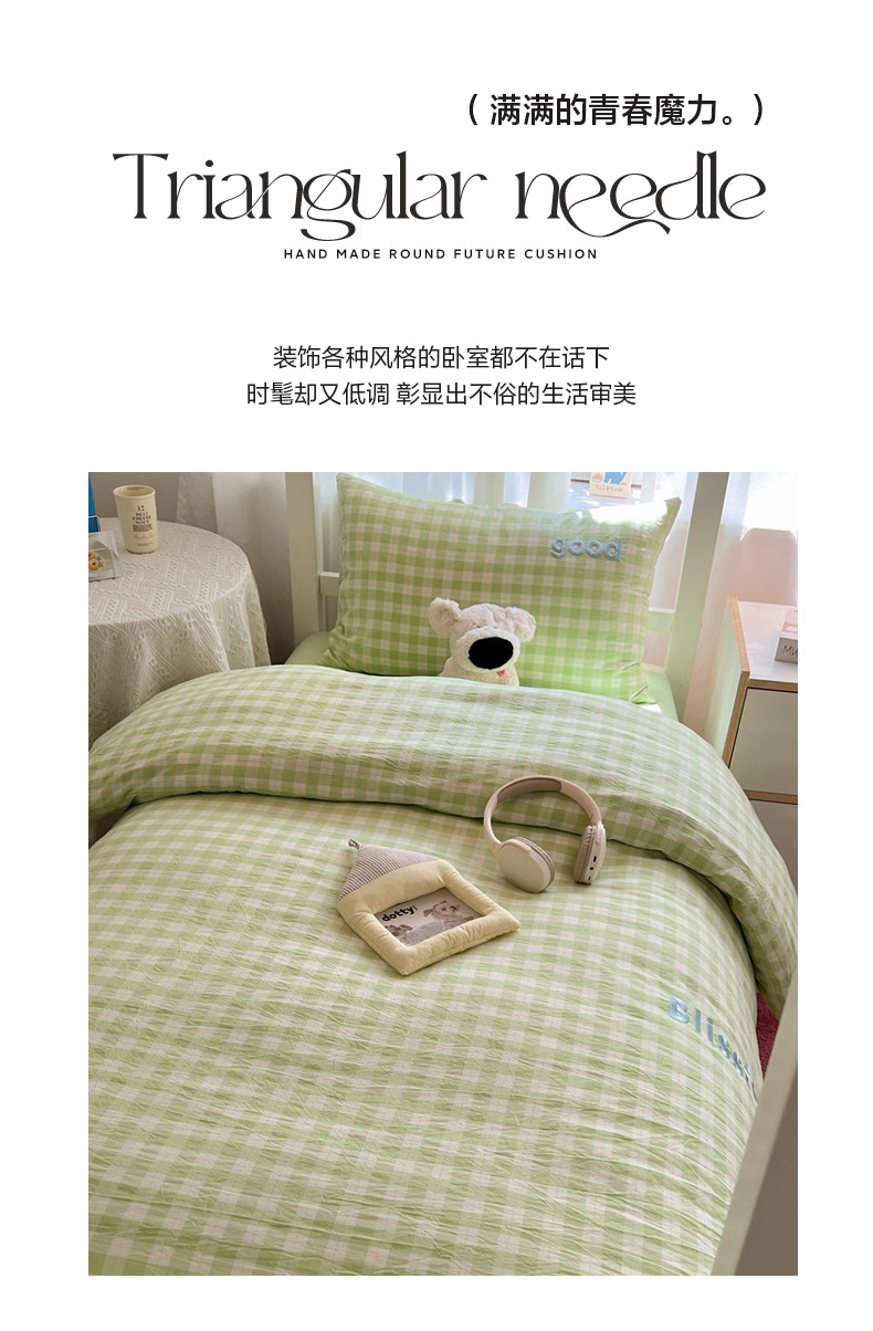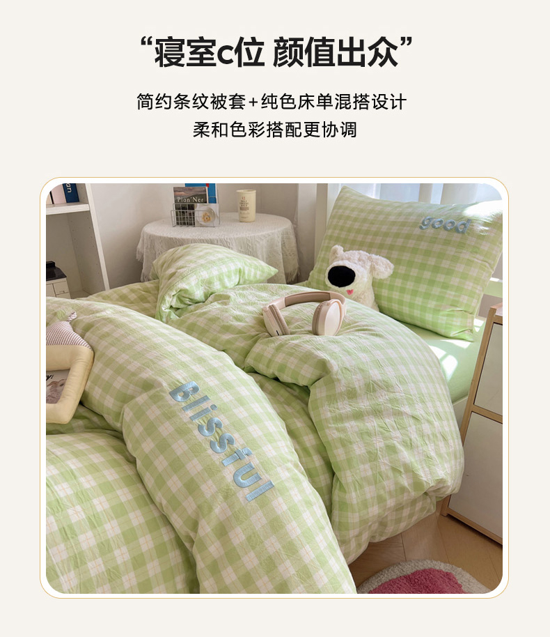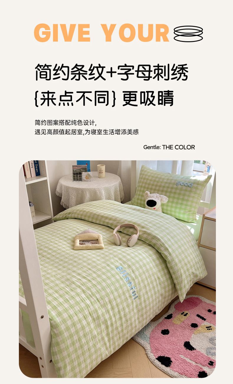 当前位置: 91家纺网 > 商品网购 > 床品套件 > 三件套 > 丽涵家纺 2025新款色织水洗棉刺绣学生三件套 尚格-绿