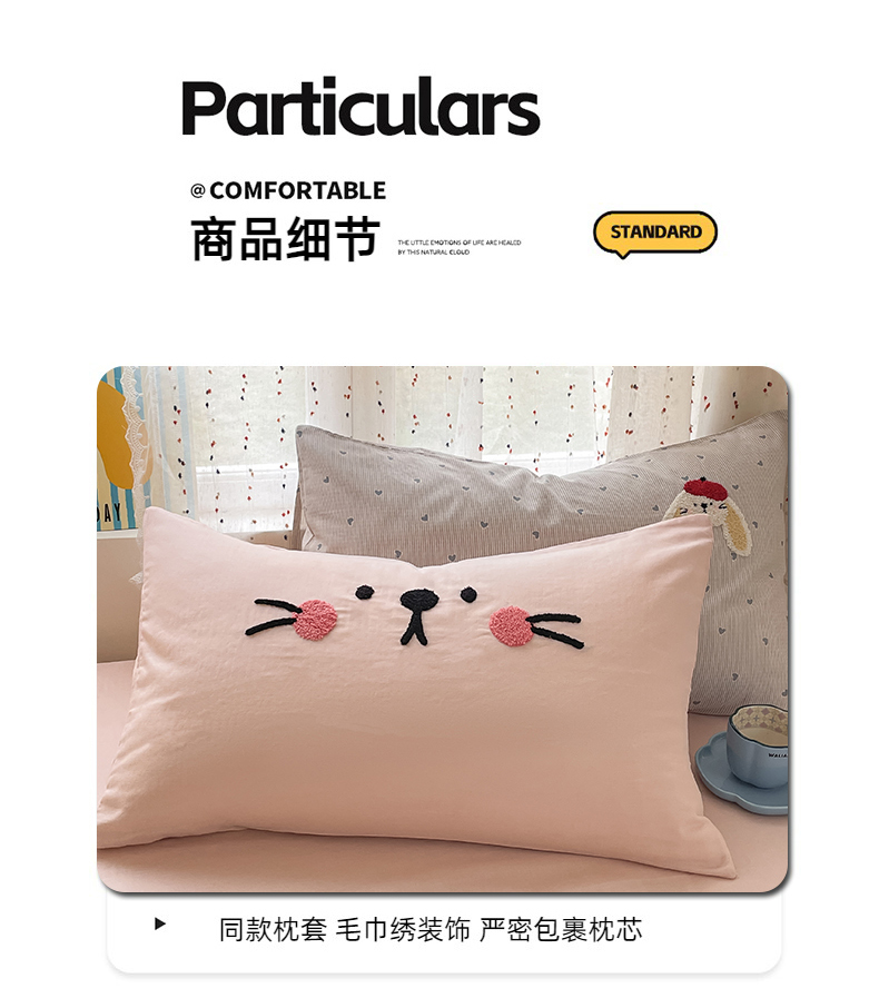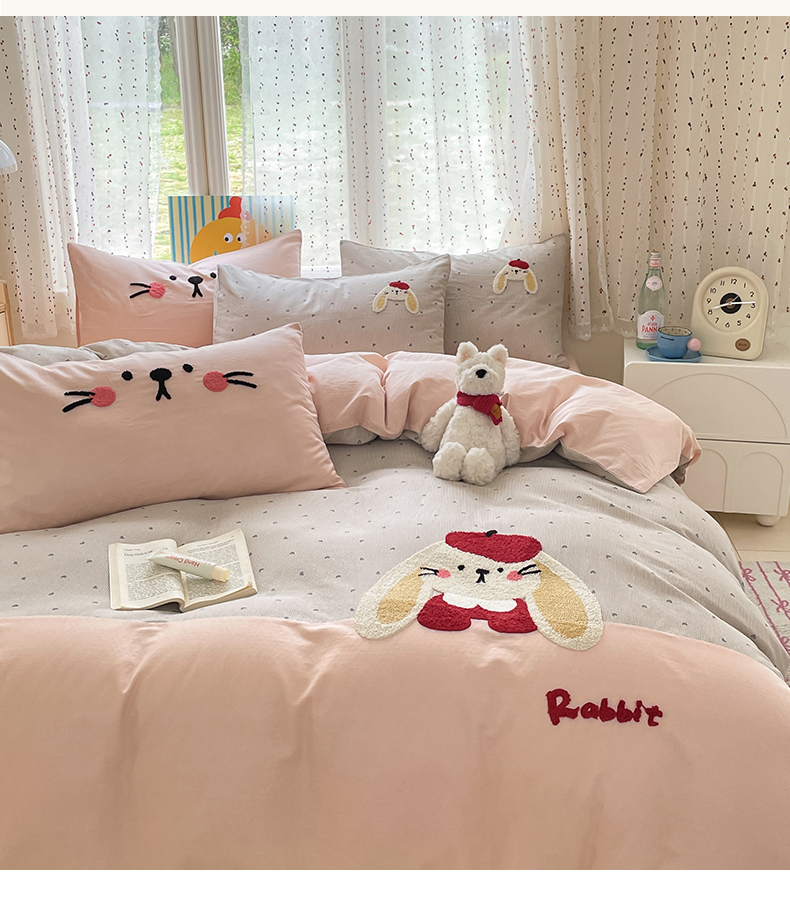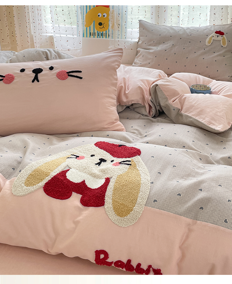 商品名称:寐居家纺 2025新款全棉纯棉A类双层纱拼接毛巾绣花四件套 萌兔之星