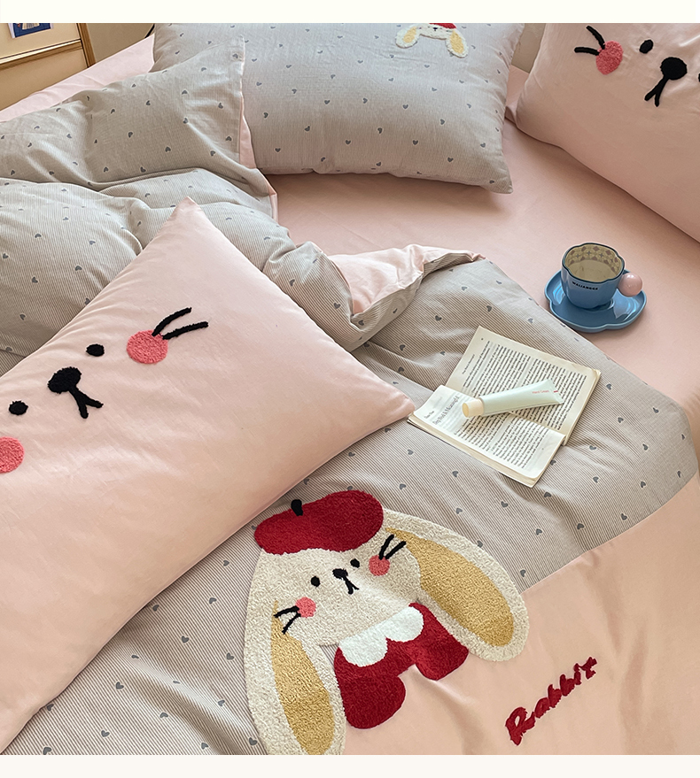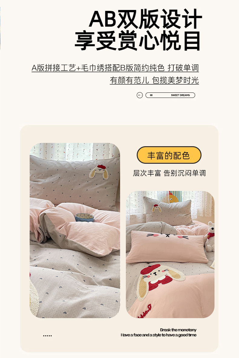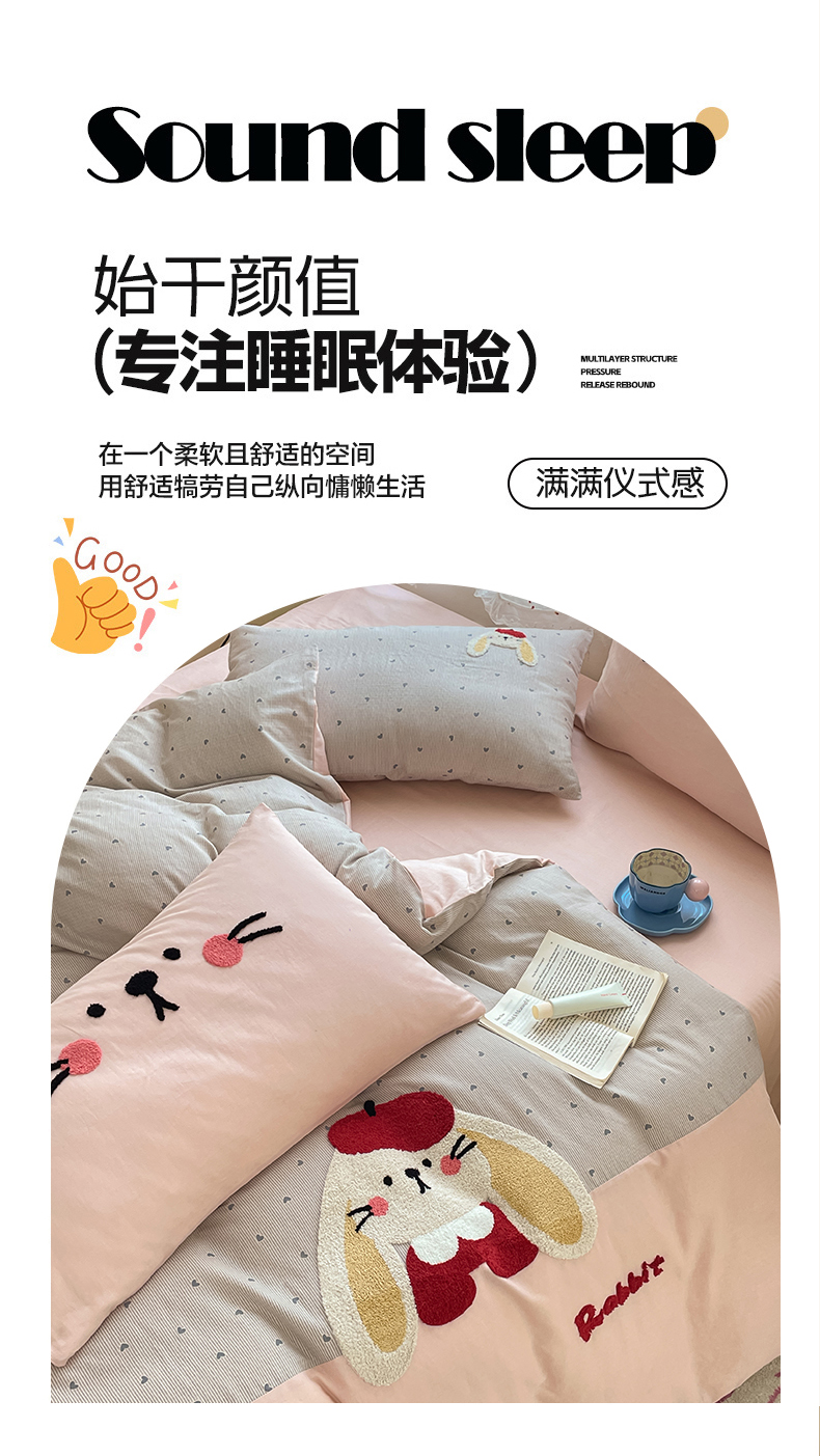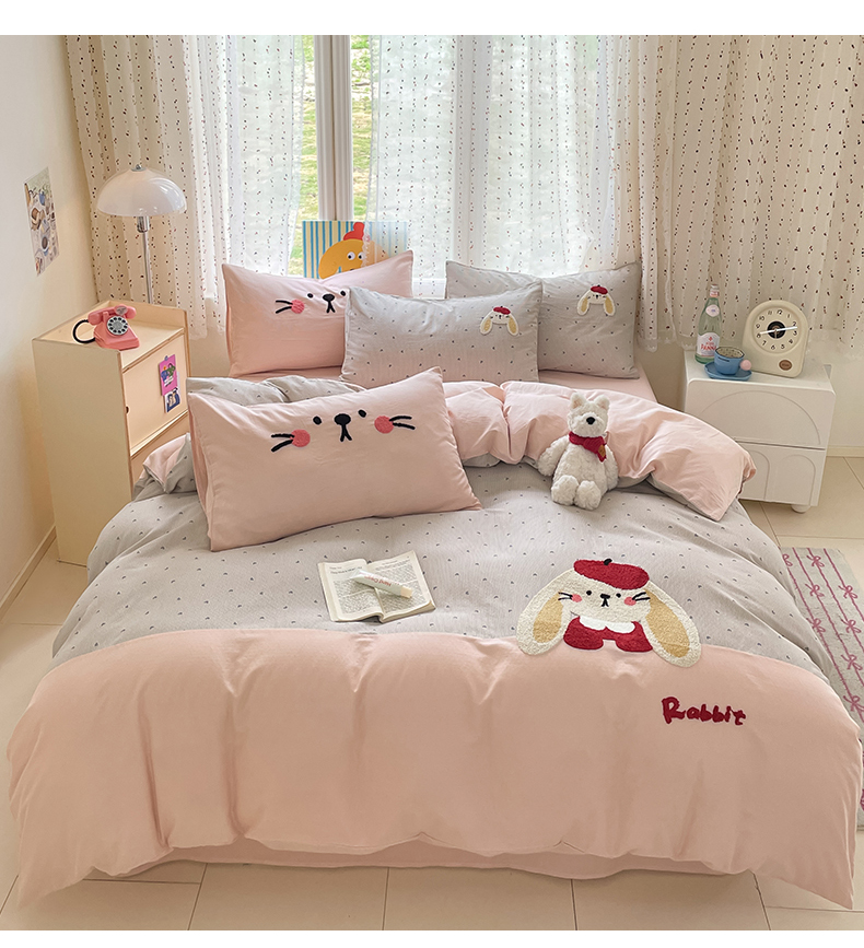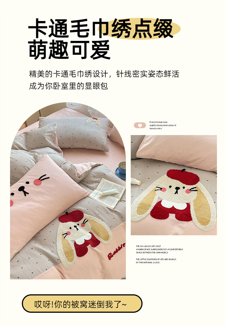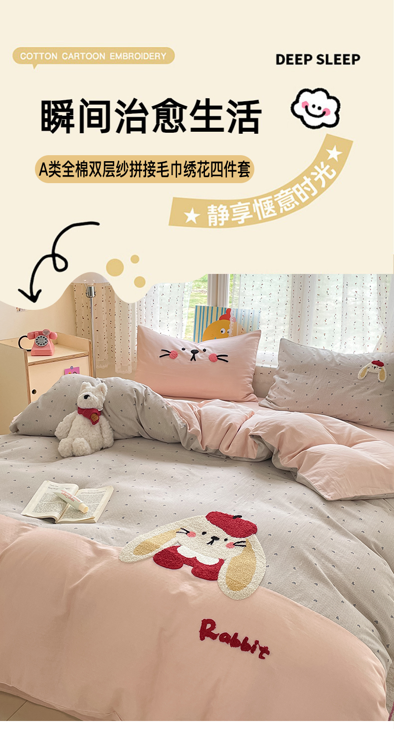 寐居家纺 2025新款全棉纯棉A类双层纱拼接毛巾绣花四件套 萌兔之星