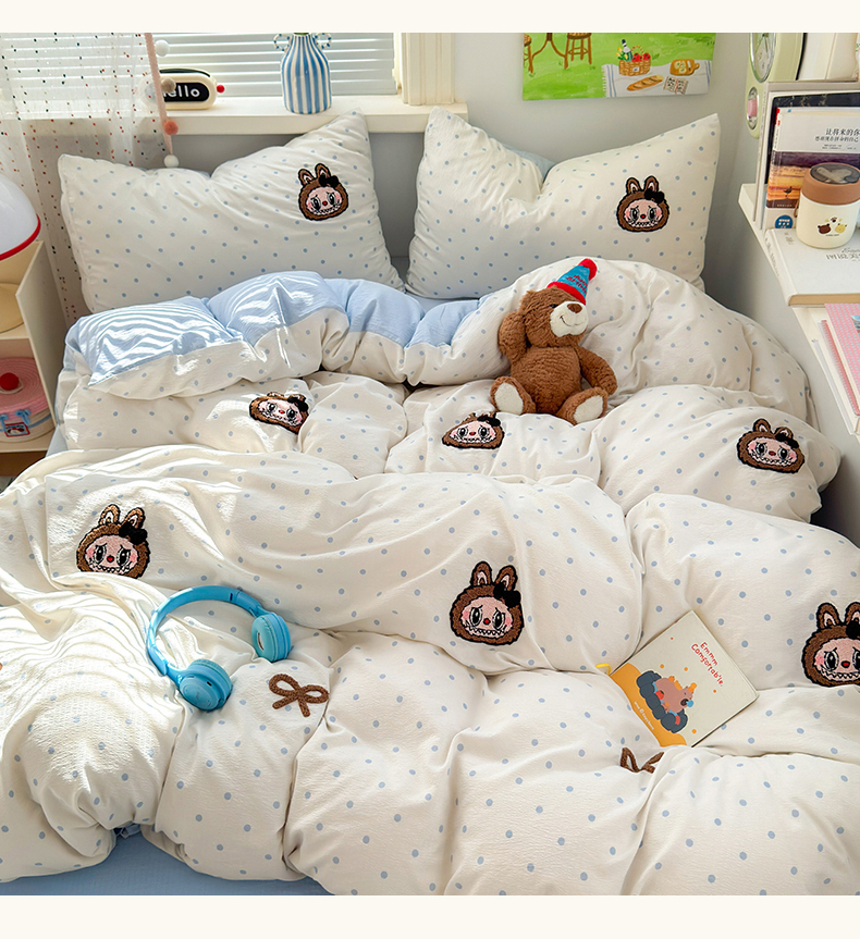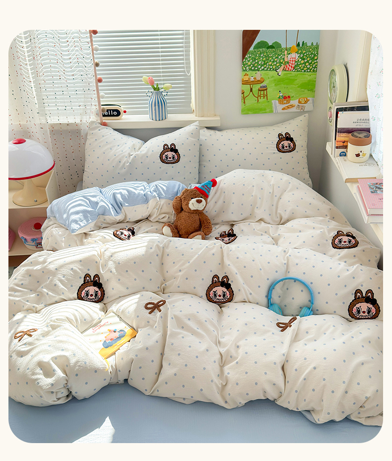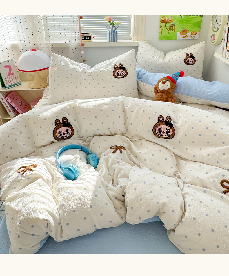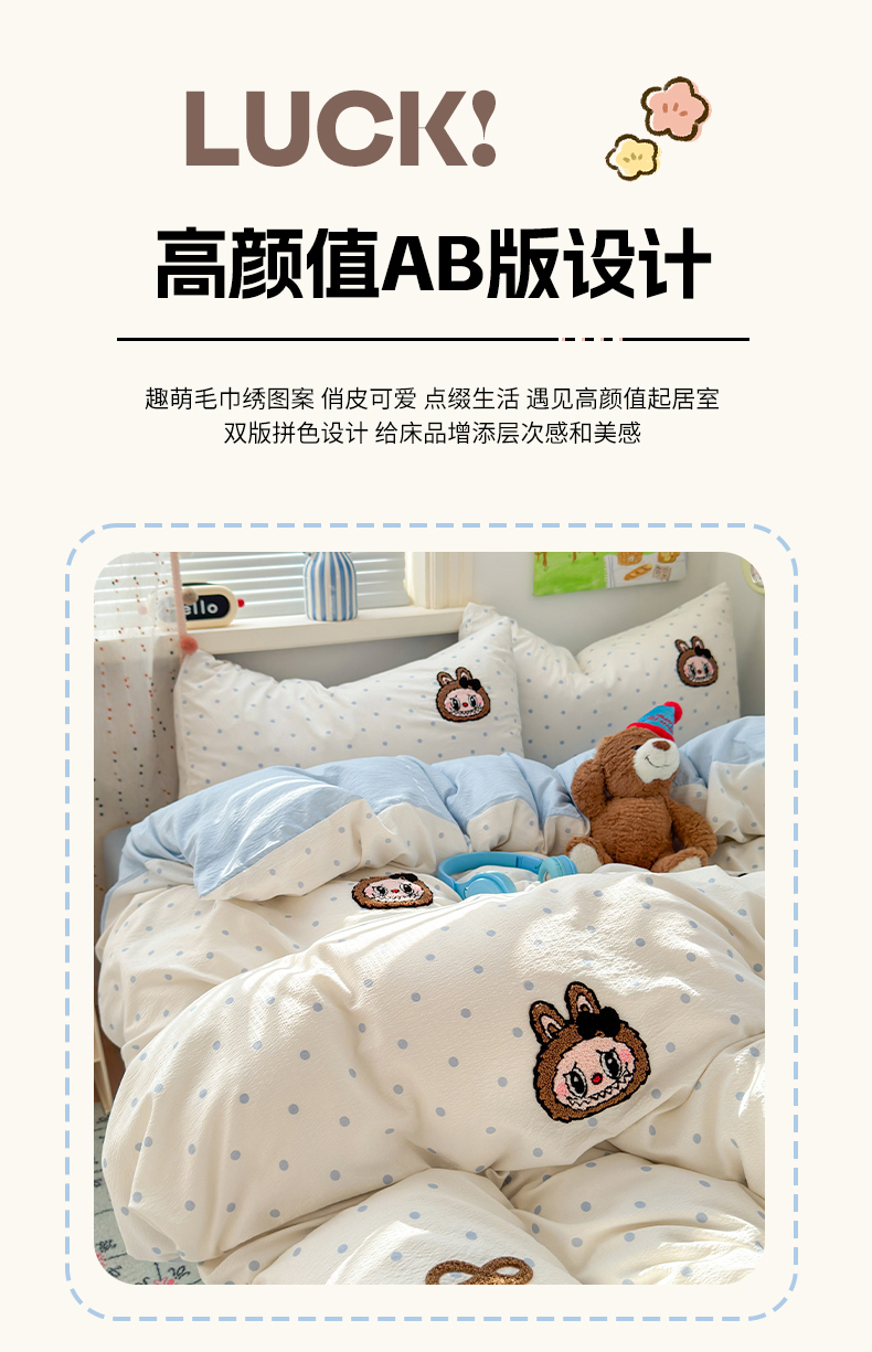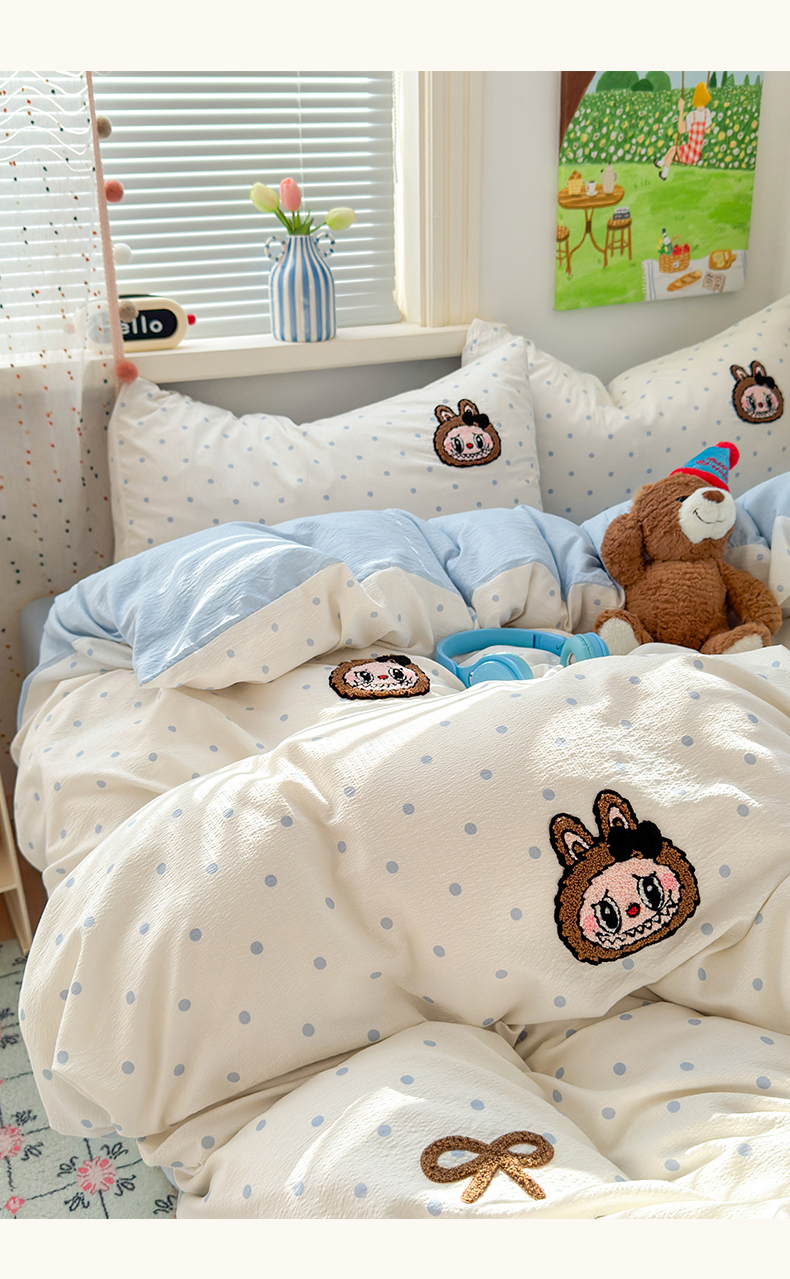 当前位置: 91家纺网 > 商品网购 > 床品套件 > 四件套 > 毛巾绣四件套 > 罗亿家纺 2025新款云感双层纱卡通毛巾绣四件套(拉布布系列场景二) 蝴蝶结小布-奶蓝