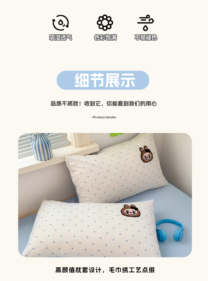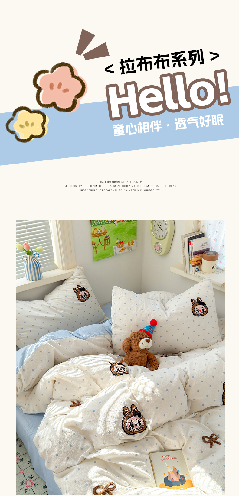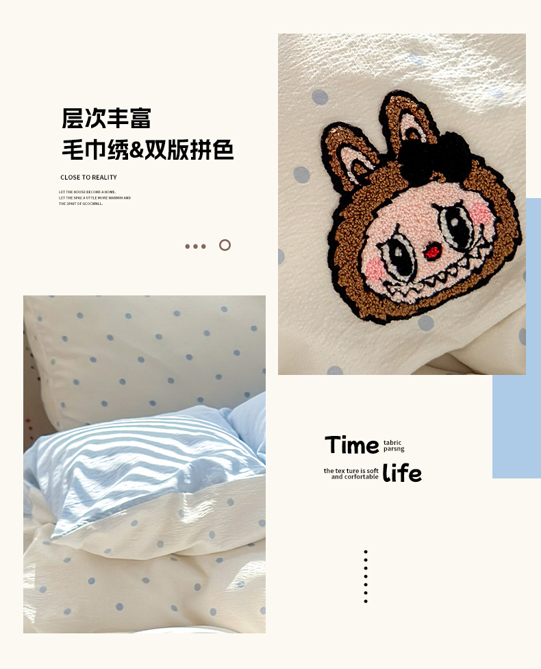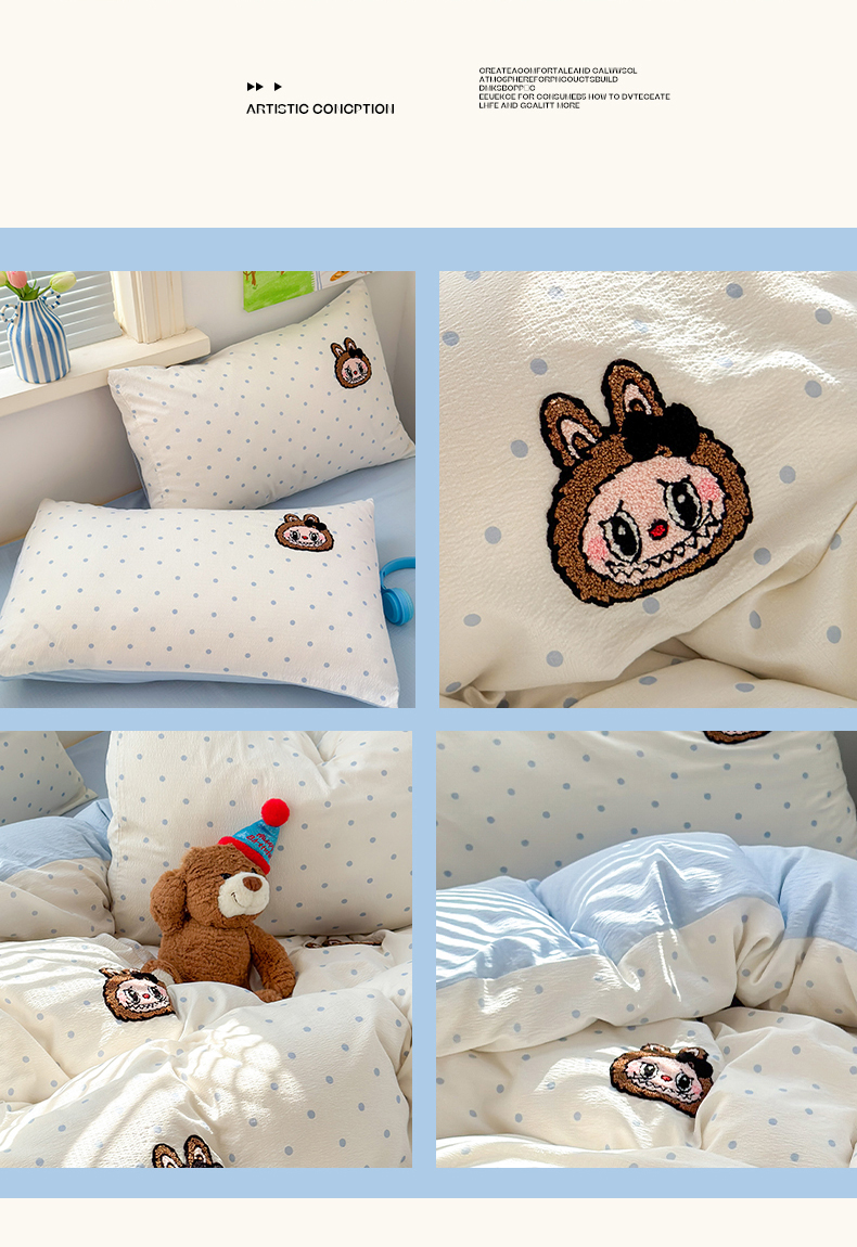 当前位置: 91家纺网 > 商品网购 > 床品套件 > 四件套 > 毛巾绣四件套 > 罗亿家纺 2025新款云感双层纱卡通毛巾绣四件套(拉布布系列场景二) 蝴蝶结小布-奶蓝