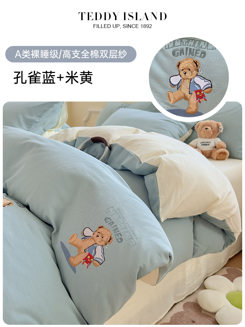 当前位置: 91家纺网 > 商品网购 > 床品套件 > 四件套 > 全棉普通四件套 > 尚品本色 2025新款轻奢全棉双层纱绣花四件套 孔雀蓝+米黄