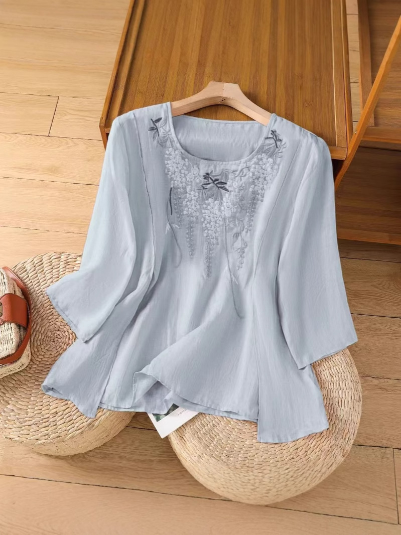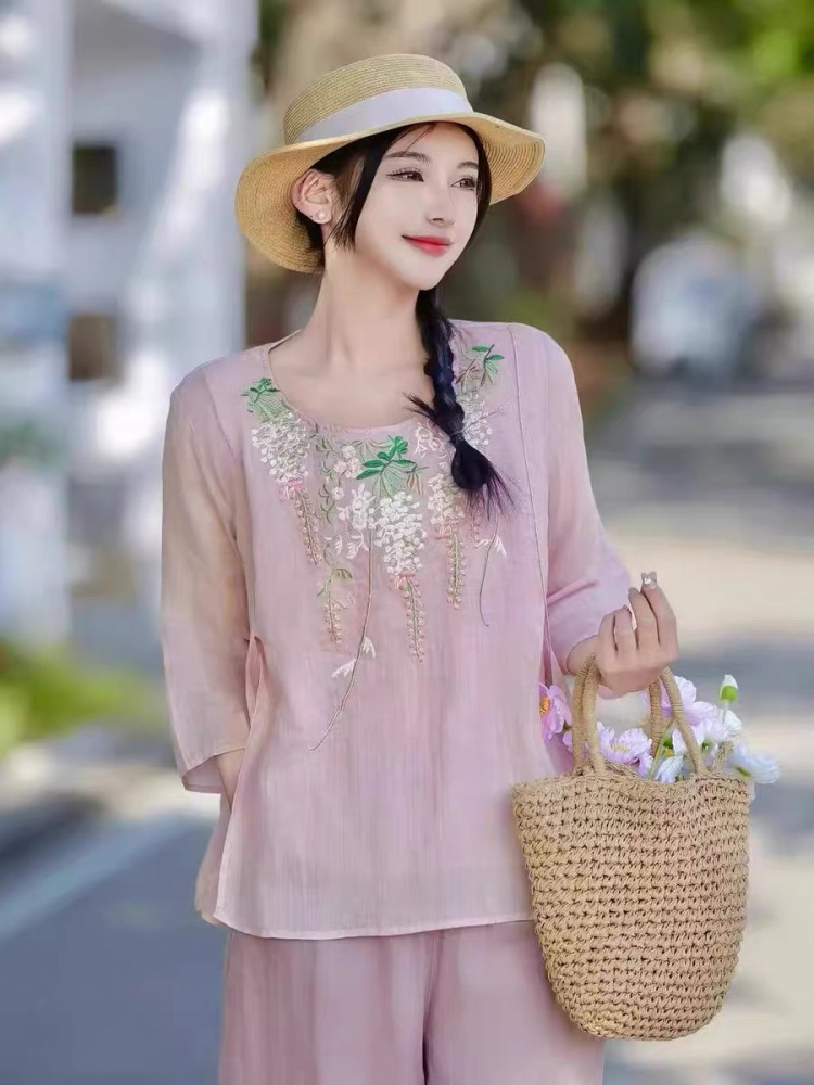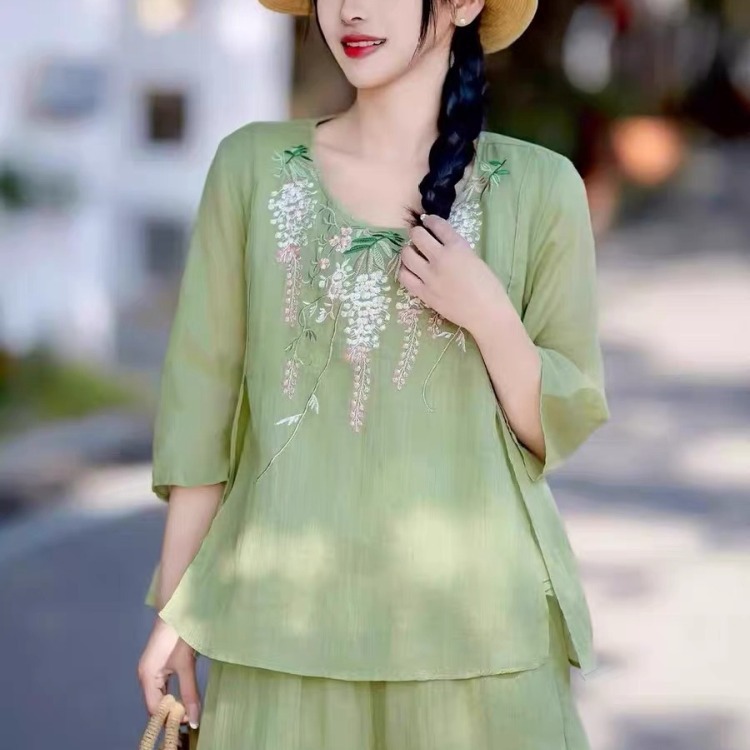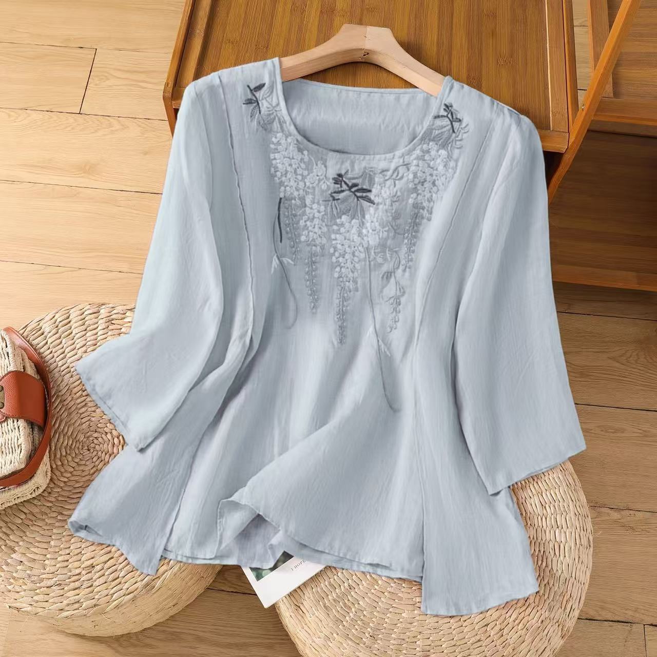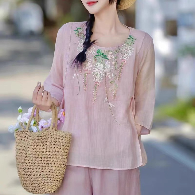 (总)洛兰沙家居馆【只代发】【只代发】 2025春夏新款刺绣苎麻显瘦立领斜襟盘扣七分袖T恤上衣女