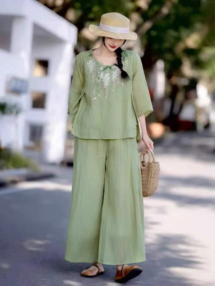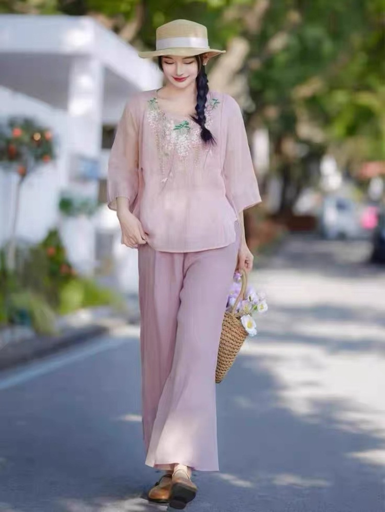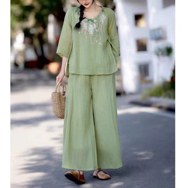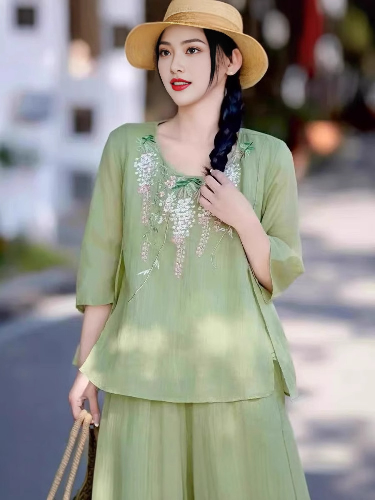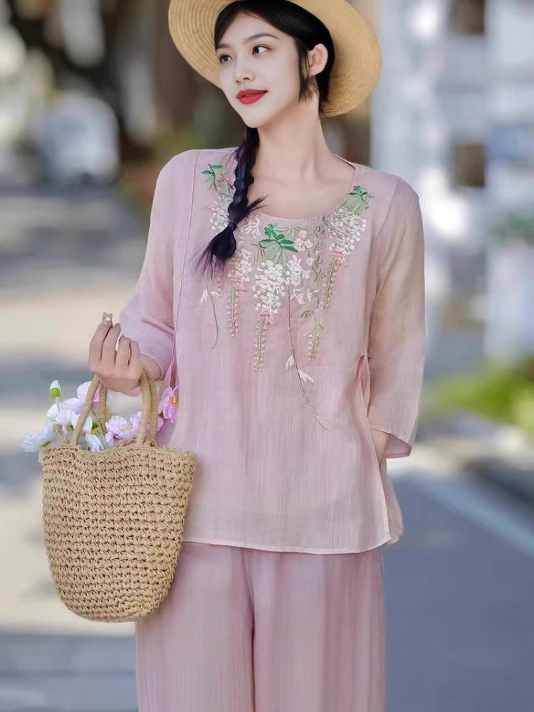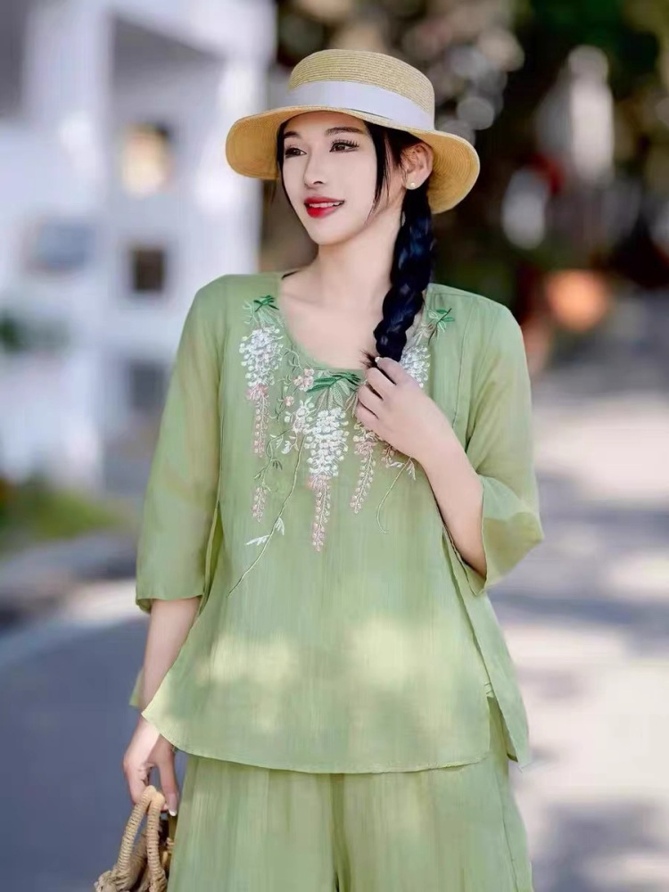 (总)洛兰沙家居馆【只代发】【只代发】 2025春夏新款刺绣苎麻显瘦立领斜襟盘扣七分袖T恤上衣女