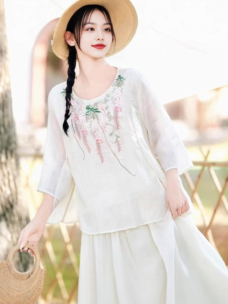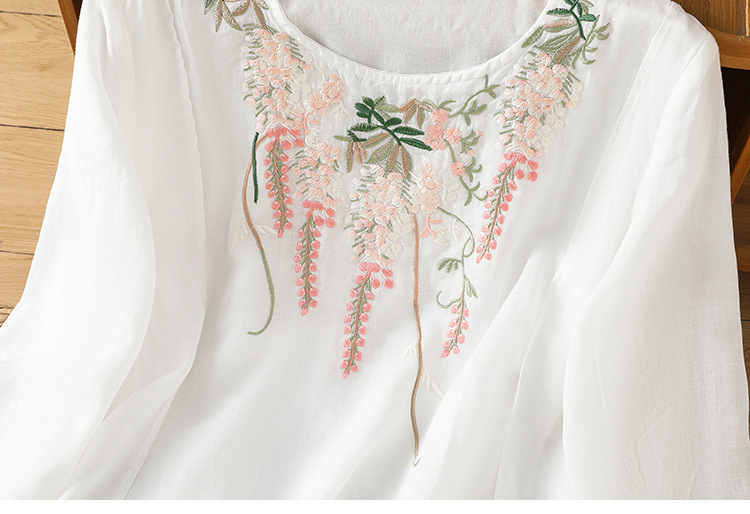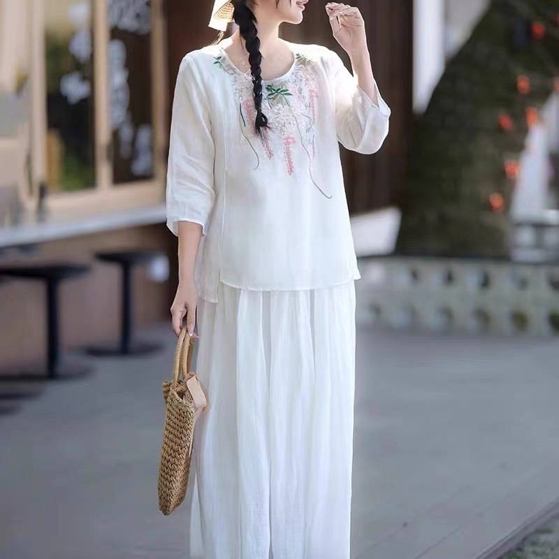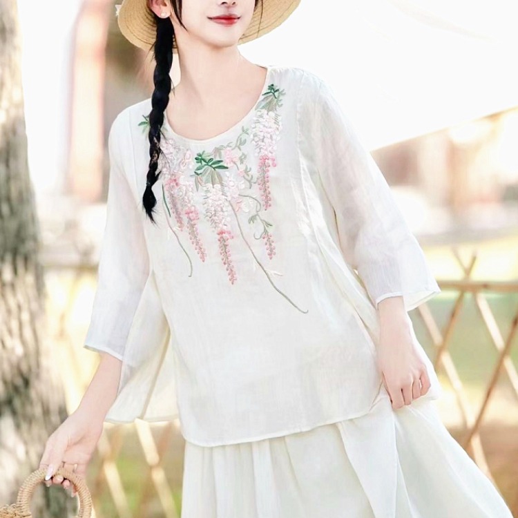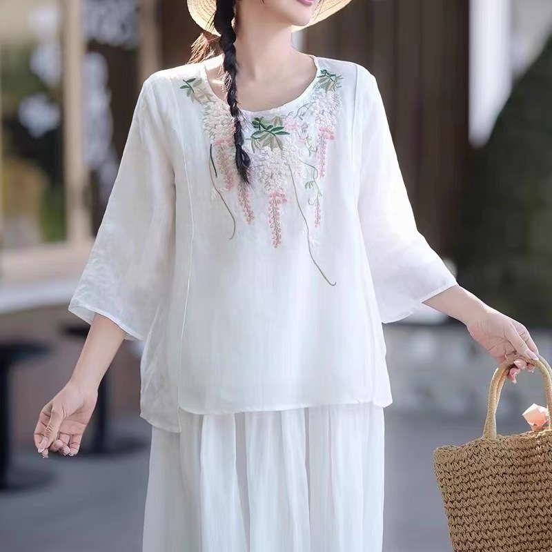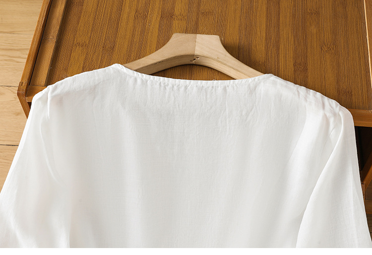 商品名称:(总)洛兰沙家居馆【只代发】【只代发】 2025春夏新款刺绣苎麻显瘦立领斜襟盘扣七分袖T恤上衣女