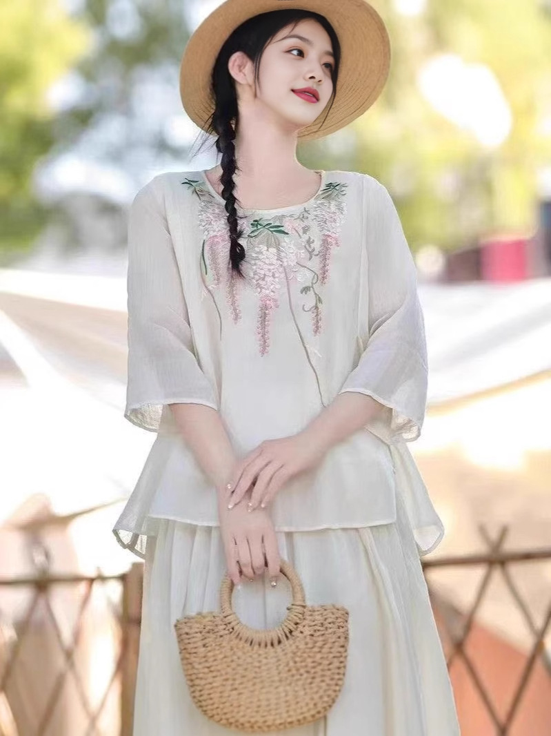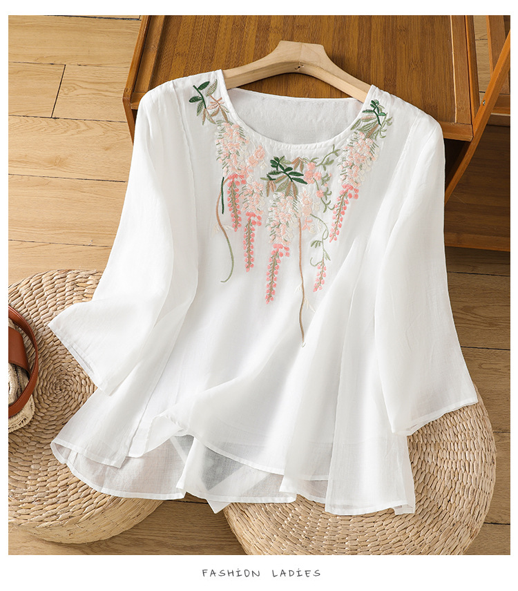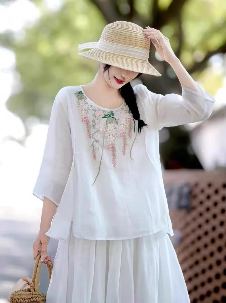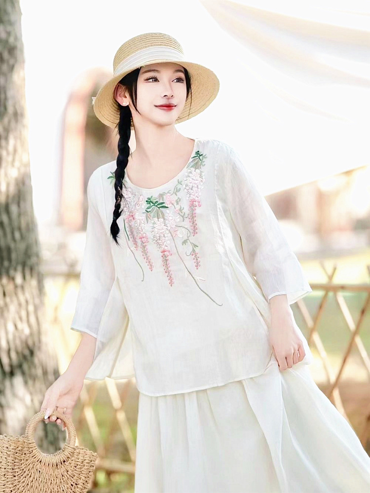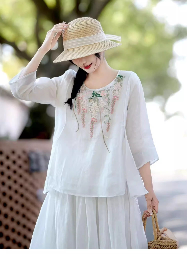 商品名称:(总)洛兰沙家居馆【只代发】【只代发】 2025春夏新款刺绣苎麻显瘦立领斜襟盘扣七分袖T恤上衣女