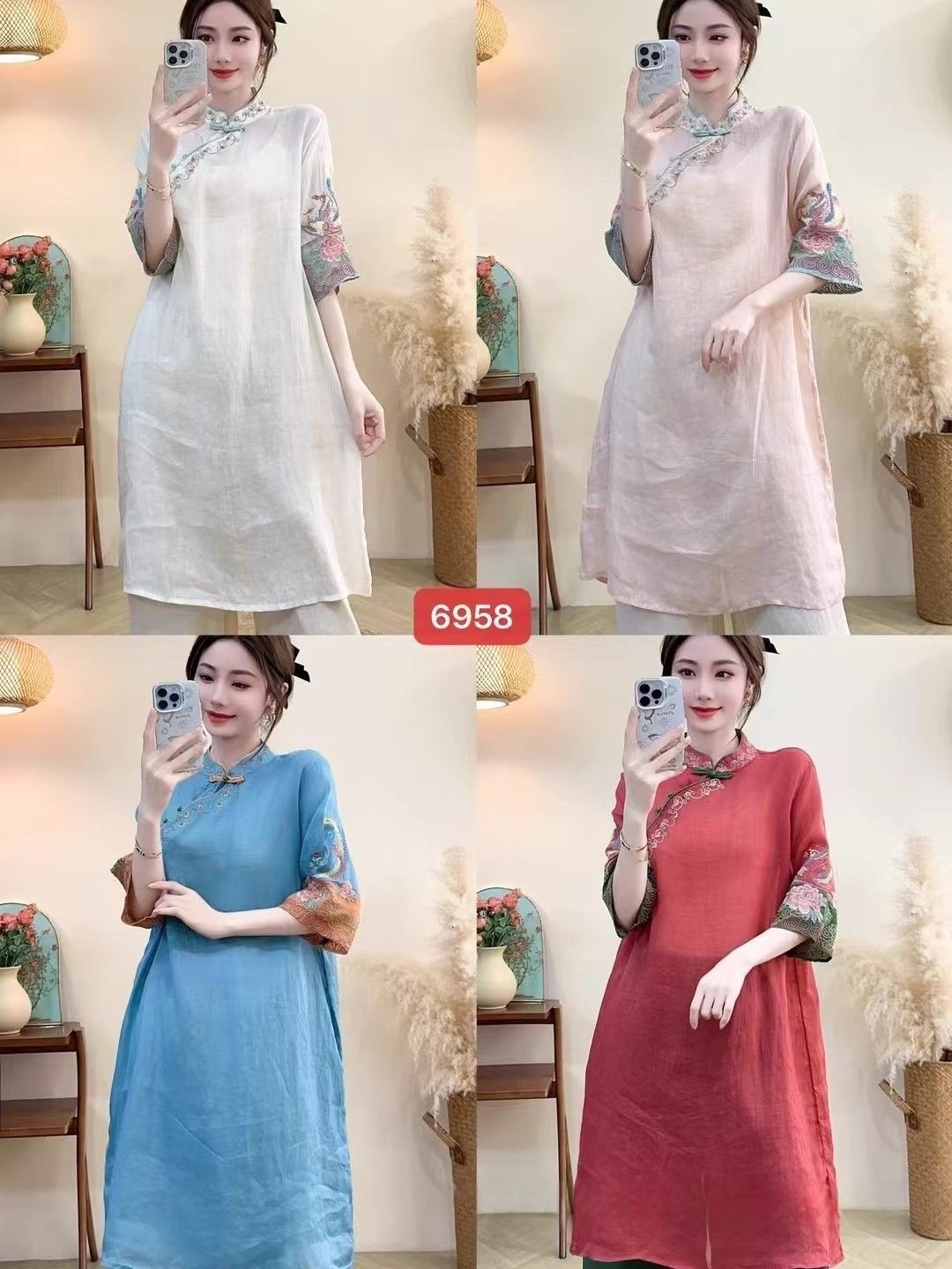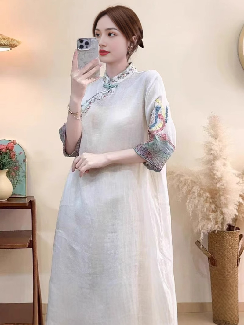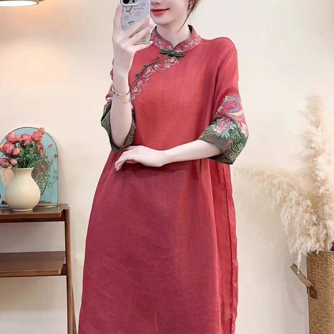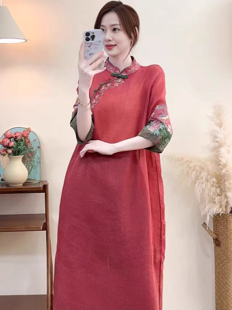 洛兰沙家居馆【只代发】【只代发】 2025春夏新款文艺复古民族风上衣女刺绣花棉麻连衣裙盘扣立领连衣裙女装 蓝色