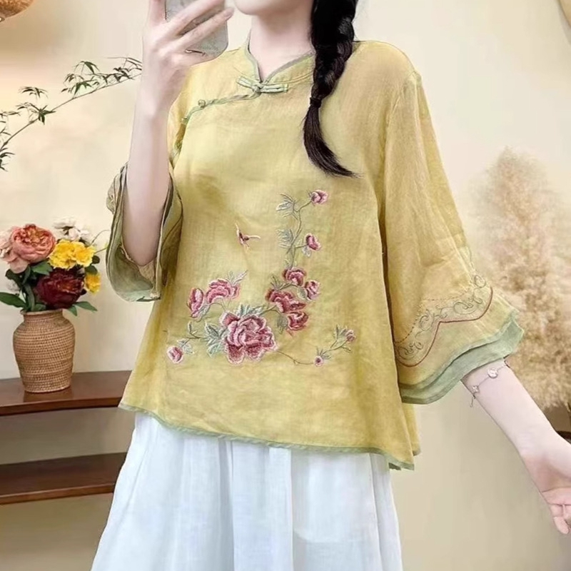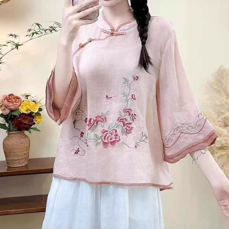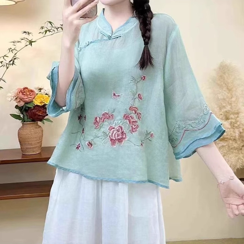 (总)洛兰沙家居馆【只代发】【只代发】 2025新款国风夏季棉麻斜襟绣花上衣盘扣文艺中国民族刺绣复古茶服衬衫