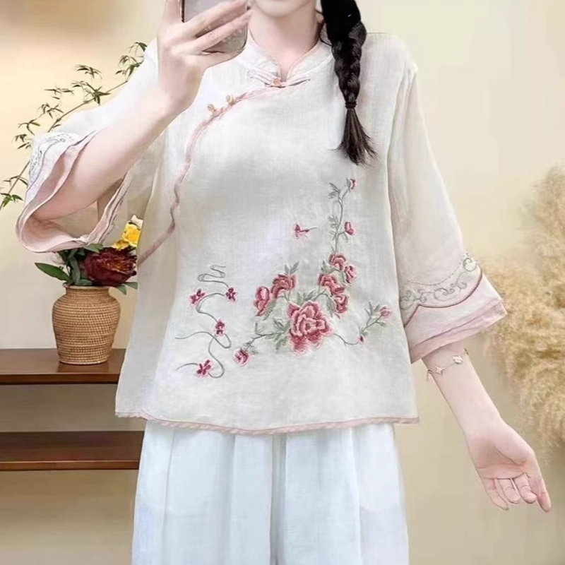 商品名称:(总)洛兰沙家居馆【只代发】【只代发】 2025新款国风夏季棉麻斜襟绣花上衣盘扣文艺中国民族刺绣复古茶服衬衫