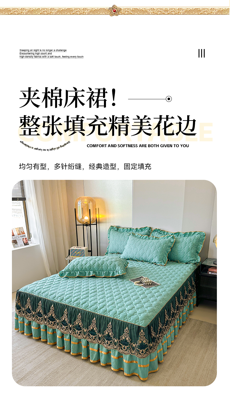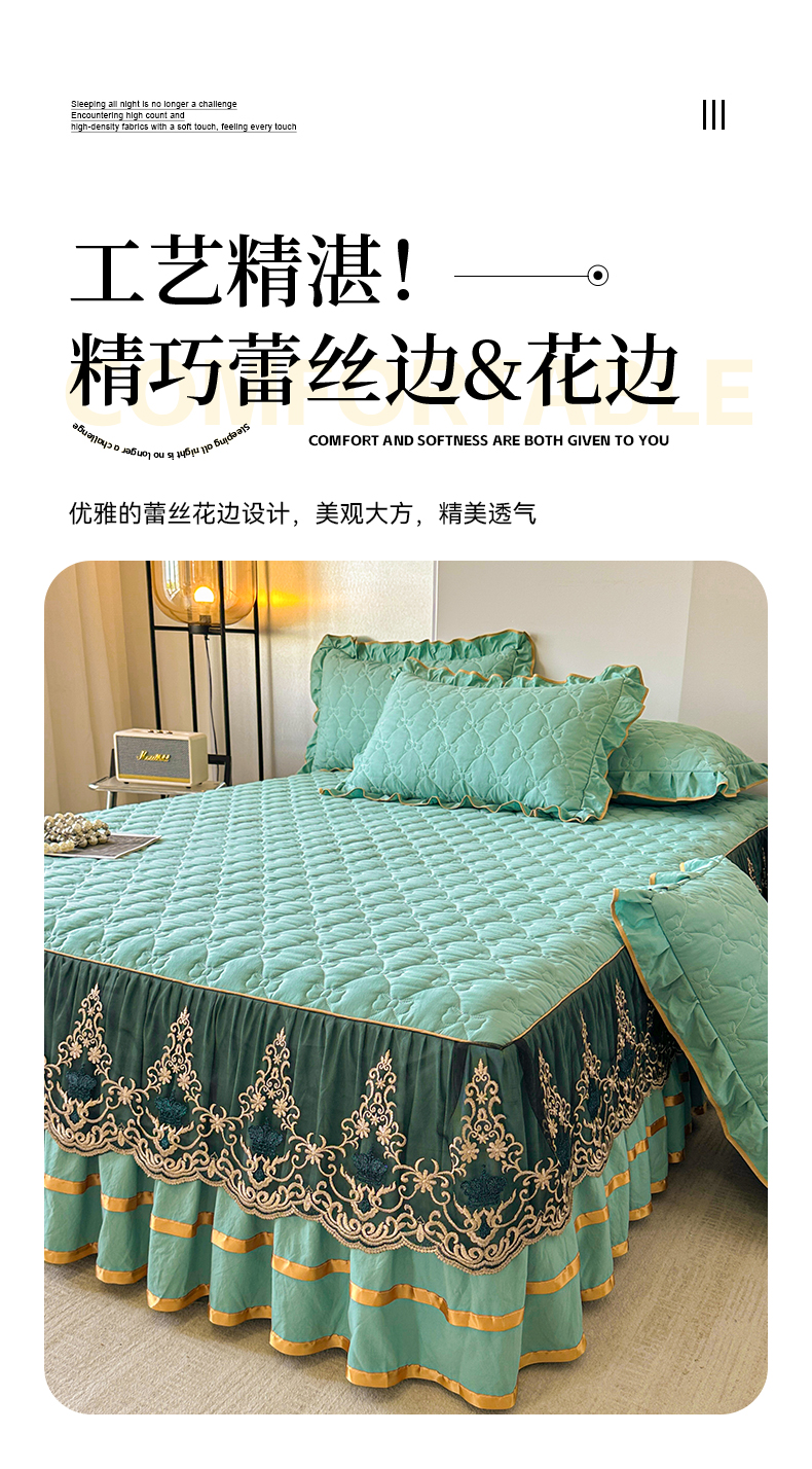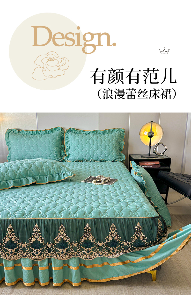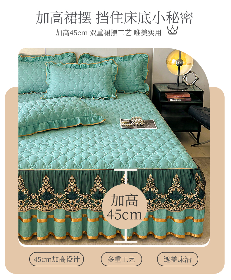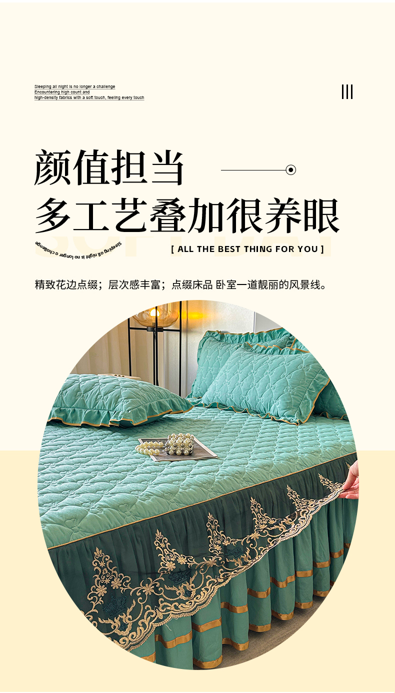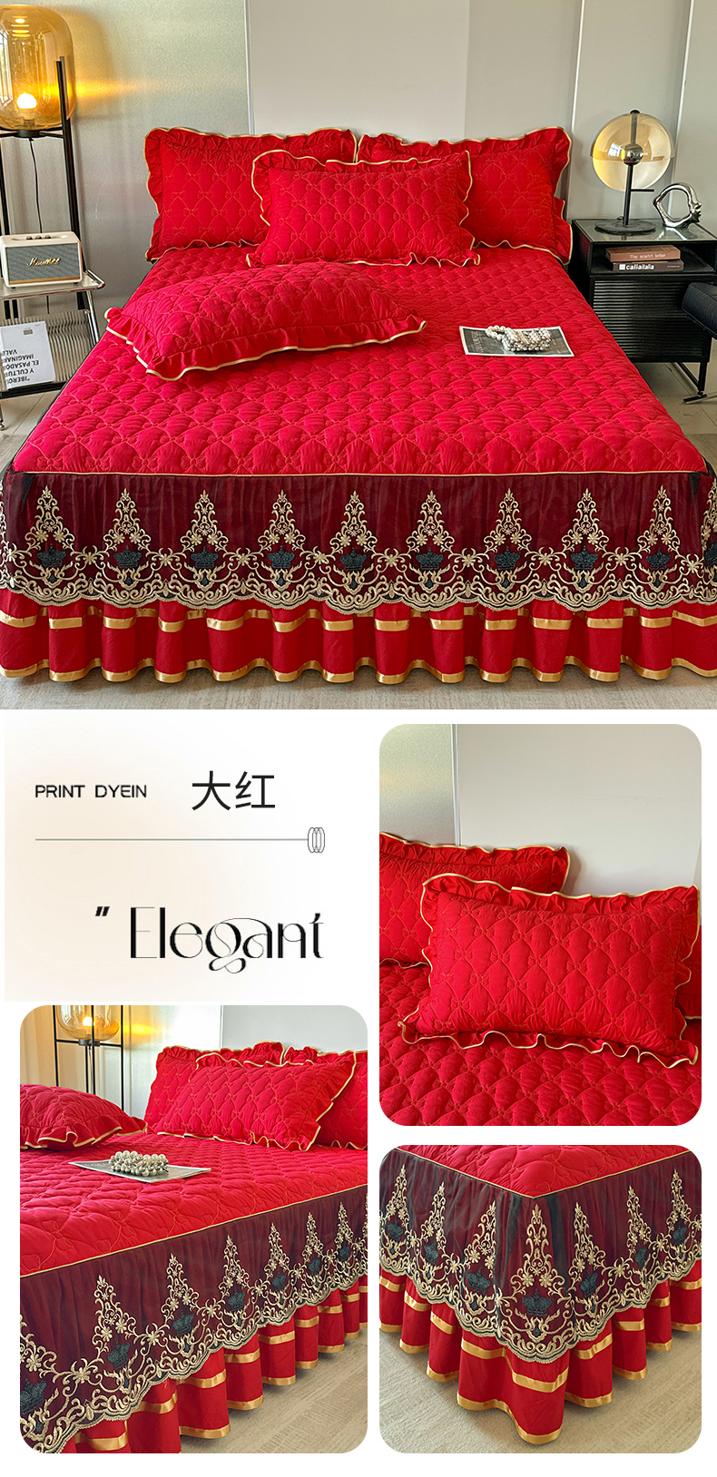 (总)屹成家纺2025新款水晶绒夹棉绗缝蕾丝床裙三件套(塞纳河畔)床裙单件起售价不低于105元,大红,豆沙,翡翠绿,粉玉,橄榄绿,蔚蓝,银灰