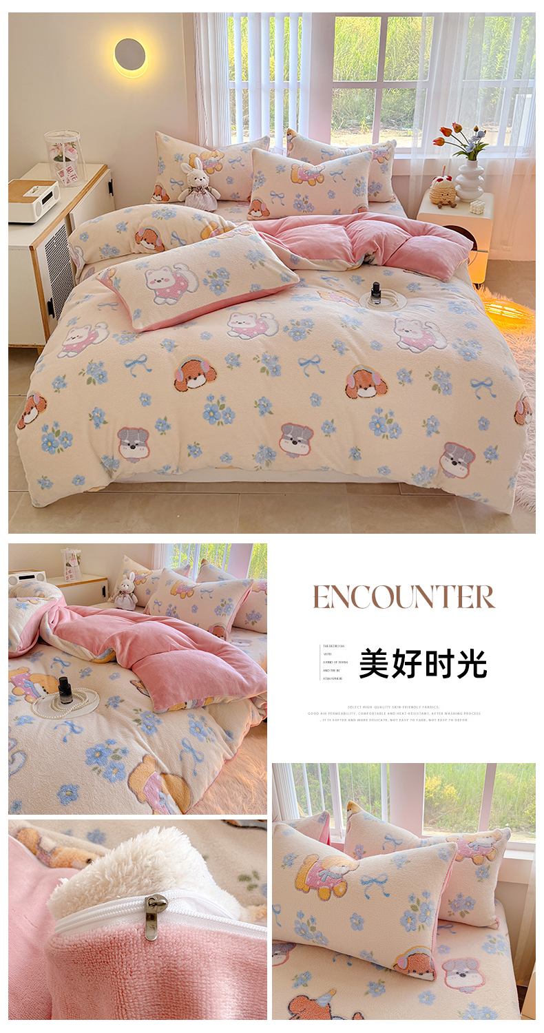 (总)慕梵家居 2024新款雪花绒四件套牛奶绒法莱绒套件,爱心兔,彩虹,草莓兔,繁花似锦,欢乐花朵,恐龙蓝,毛球,绅士熊,太空熊,泰迪熊,桃子少女,小波浪,小恐龙,小萝卜,小南瓜,心想事橙,星星熊,樱桃女孩,枝繁叶茂,字母熊