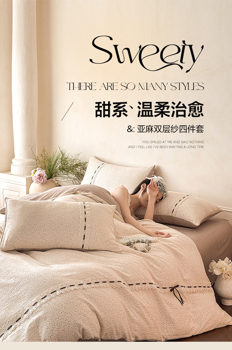 (总)遇见家居生活馆 2025新款亚麻双层纱印花四件套-往事,往事-枫叶红,往事-复古咖,往事-奶油黄,往事-浅灰色,往事-深灰色