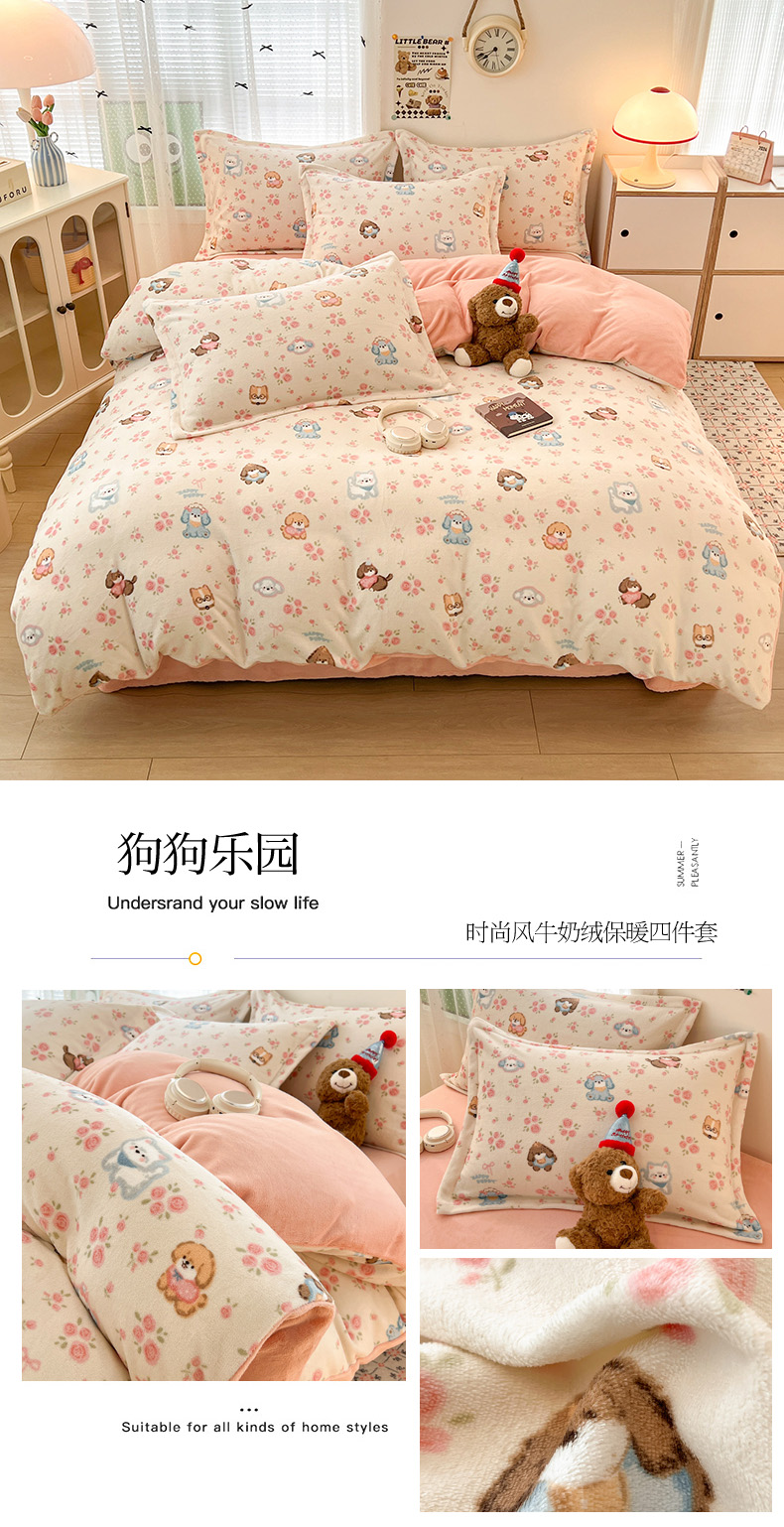 当前位置: 91家纺网 > 商品网购 > 床品套件 > 四件套 > 牛奶绒四件套 > 倾慕 2026新款高克重时尚印花牛奶绒系列 狗狗乐园