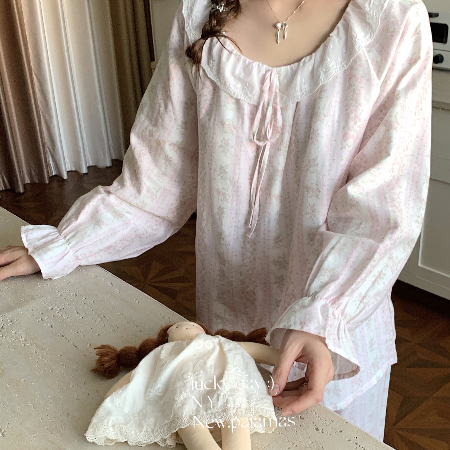 当前位置: 91家纺网 > 商品网购 > 居家日用 > 睡衣/家居服套装 > 纽约生活 2025新款系绳胸垫蕾丝套装 礼物熊