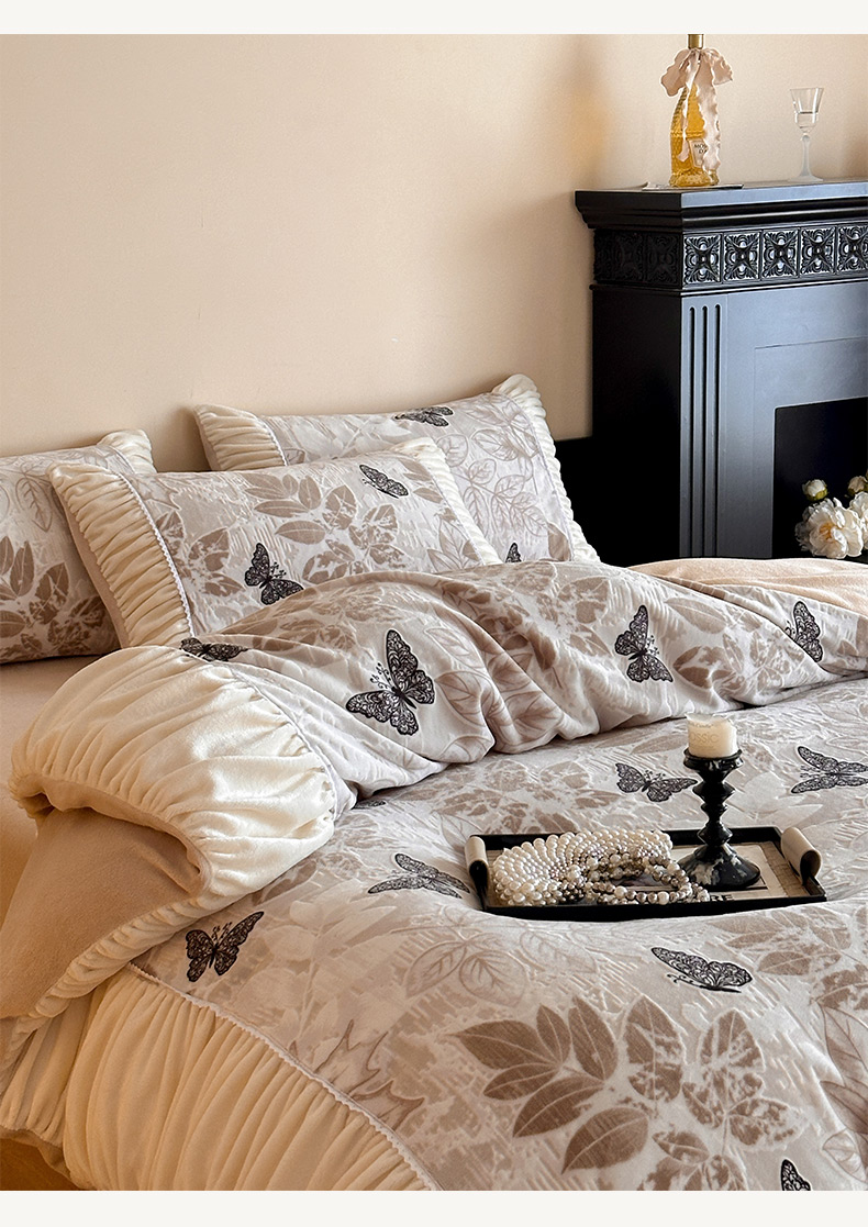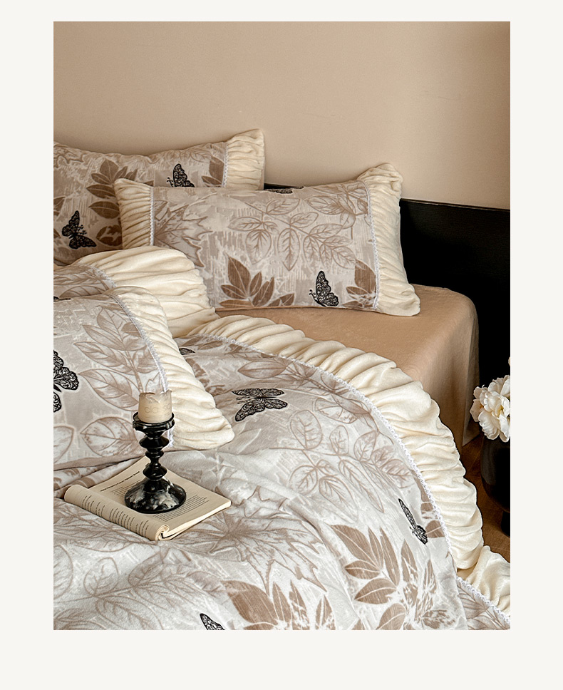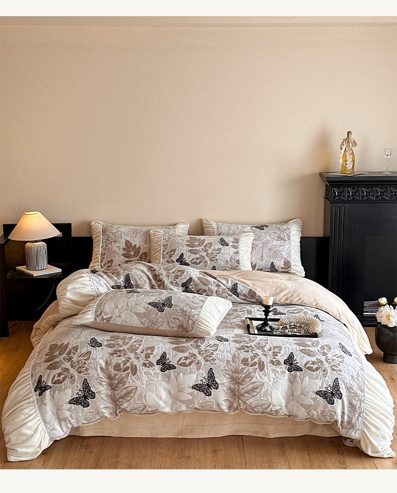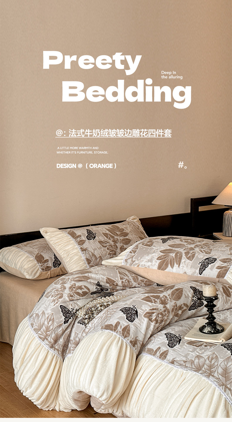 索飞特家纺 2025新款秋冬法式牛奶绒皱皱边雕花四件套 夏花之梦-卡其