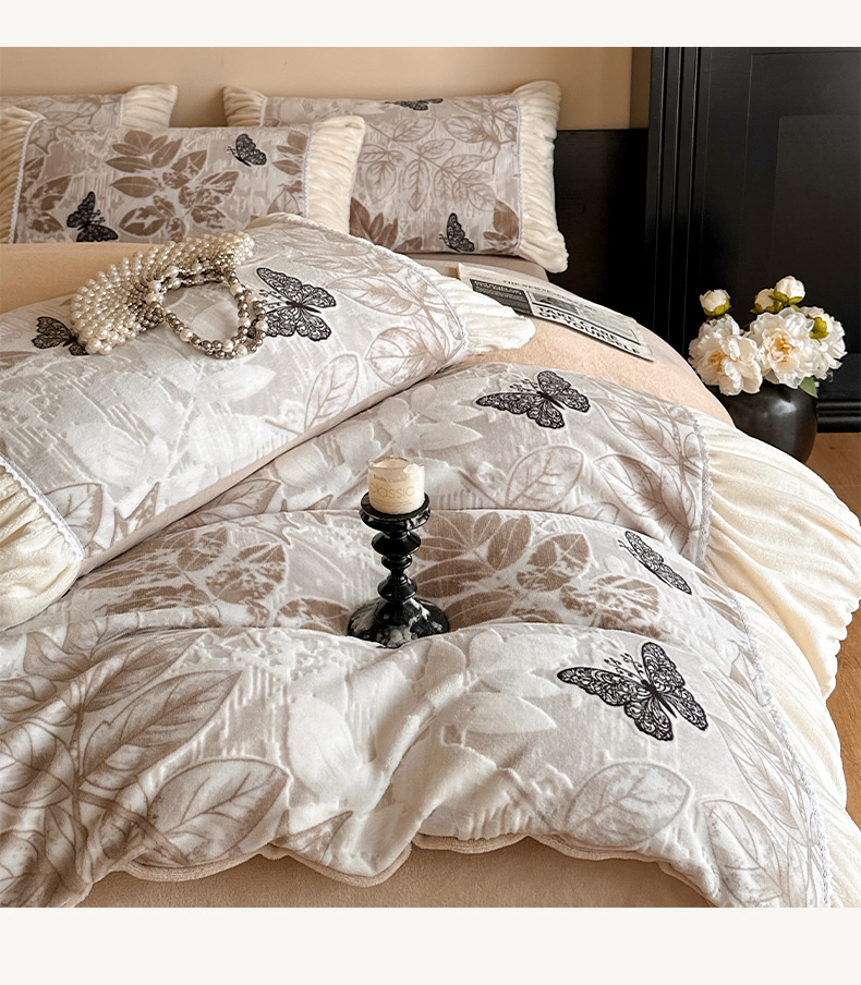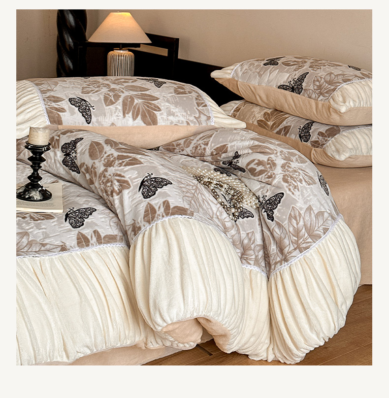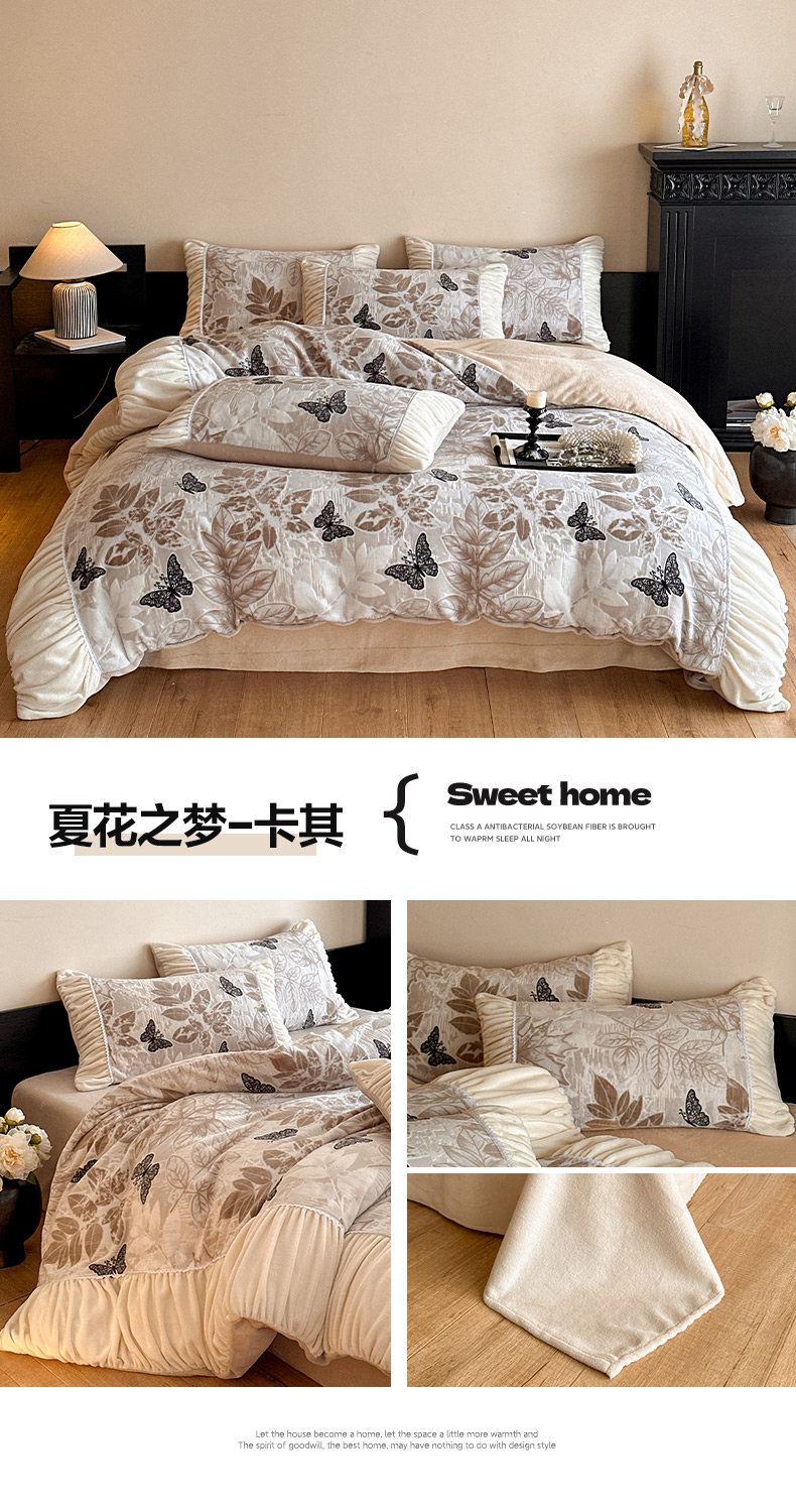 商品名称:索飞特家纺 2025新款秋冬法式牛奶绒皱皱边雕花四件套 夏花之梦-卡其
